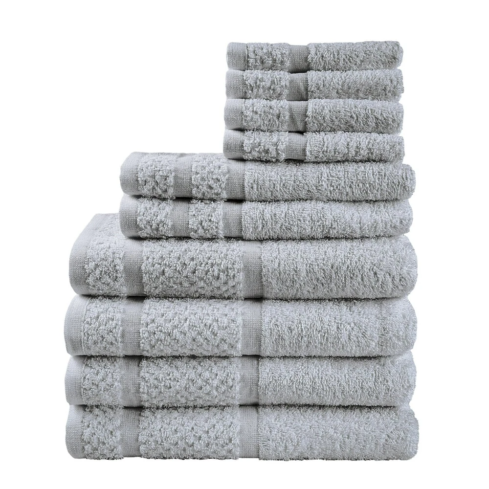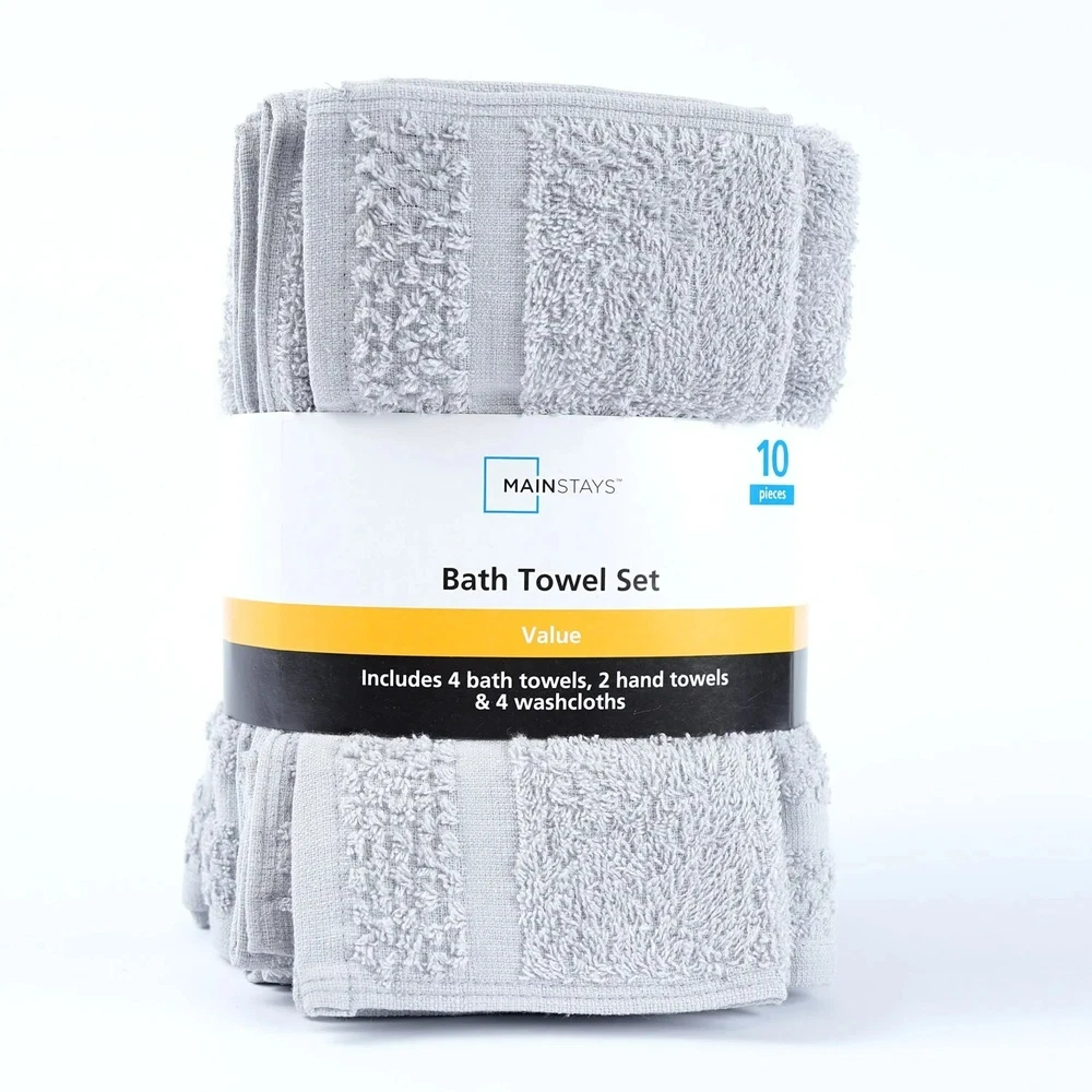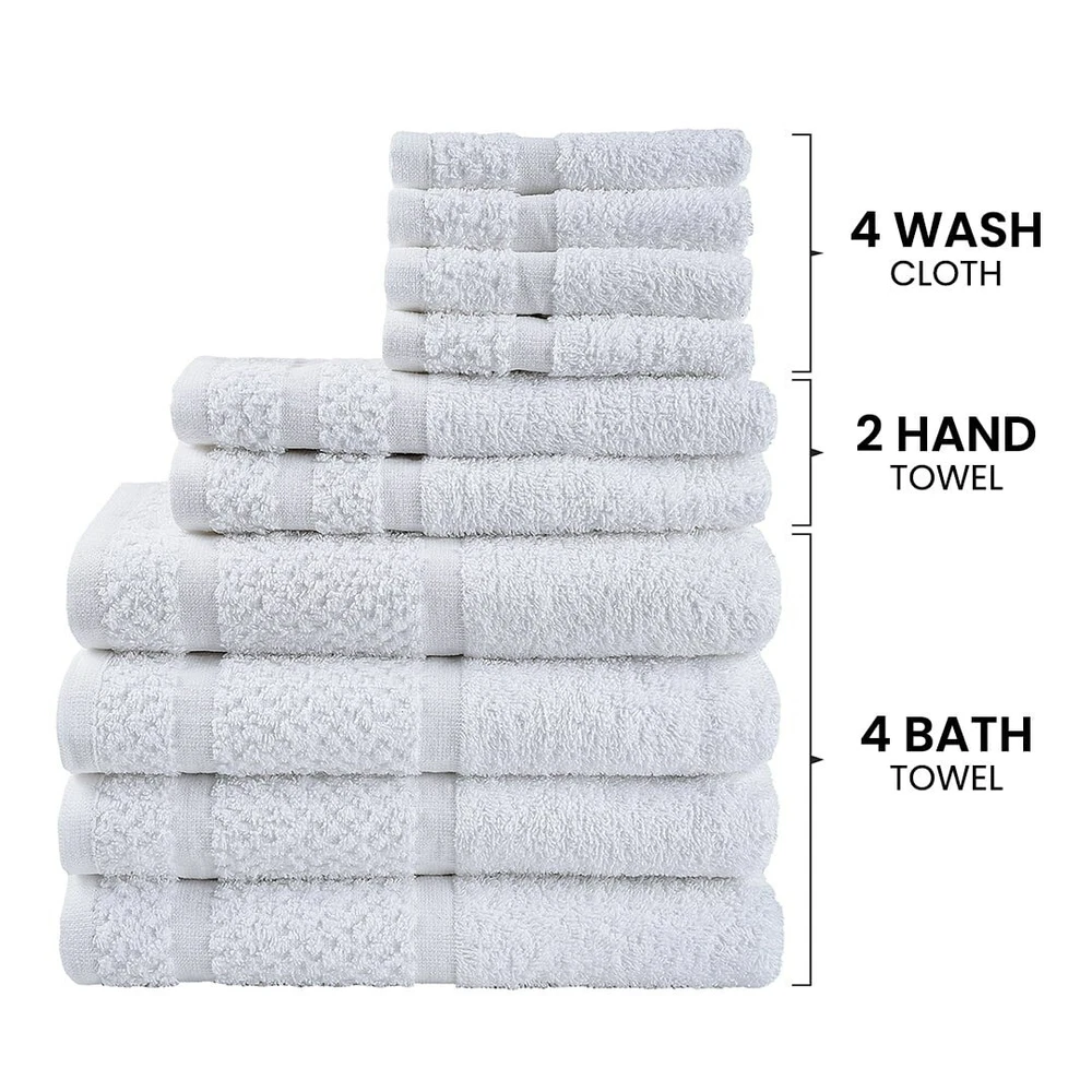 Product details Embrace yourself in the comfort of the Value 10-Piece Towel Set. Made from soft, absorbent 100% cotton, these towels dry quickly . The new design features a popcorn textured border for a fresh look in your bathroom, and double needle stitching for durability. This fade-resistant set includes four bath towels, two hand towels, and 4 washcloths, All age group. and all machine washable. 10-piece set includes 4 bath towels, 2 hand towels, and 4 washcloths New design with a popcorn textured border Stylish cotton bath towels feature double needle stitching for even more durability an everyday must-have for your bathroom. for adults Soft, absorbent, and fade-resistant Made of 100% cotton All age group. Specifications Collection value towel Towel & Washcloth Type Bath Towels Material Cotton Fabric Content 100% Cotton Grams per Square Meter (GSM) 372 gsm Color White and Grey Pattern Solid Print Theme value towel Piece Count 10 Items Included bath towel , hand towel , washcloth Features Quick Dry Assembled Product Weight 3.02 lb Number of Bath Towels 4 Number of Hand Towels 2 Number of Washcloths 4 Shape Rectangle Assembled Product Dimensions (L x W x H) 11.50 x 8.00 x 8.00 Inches Directions Fabric Care Instructions Machine wash warm with like colors, Deep color bleeds, Wash Before Use., Tumble Dry , Do Not Bleach Color Towels Package Includes 4 * bath towels 2 * hand towels 4 * washcloths