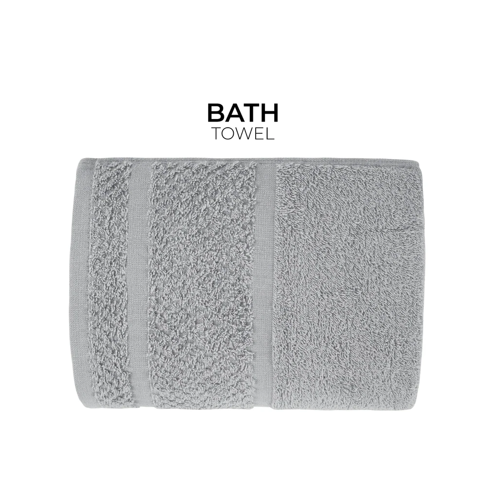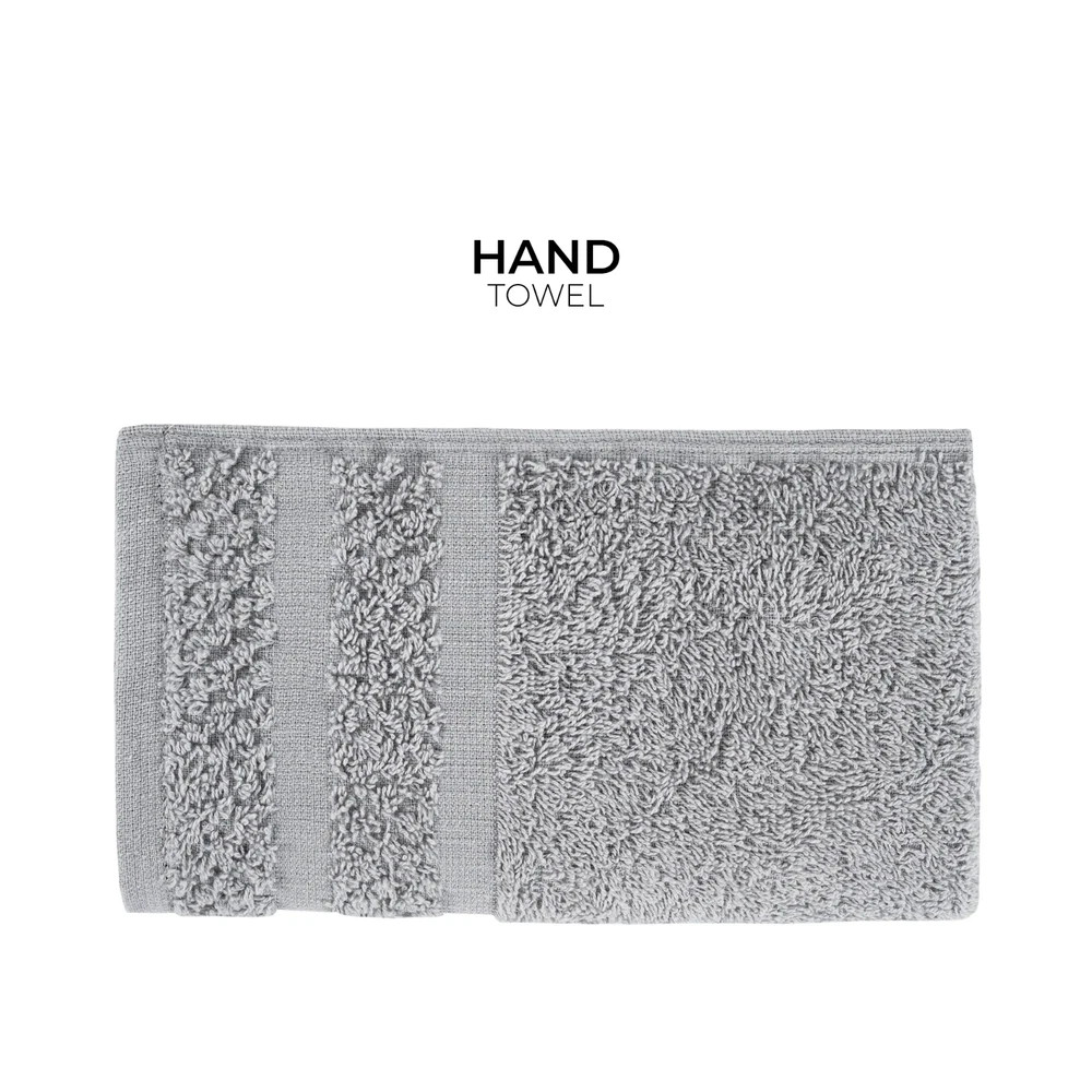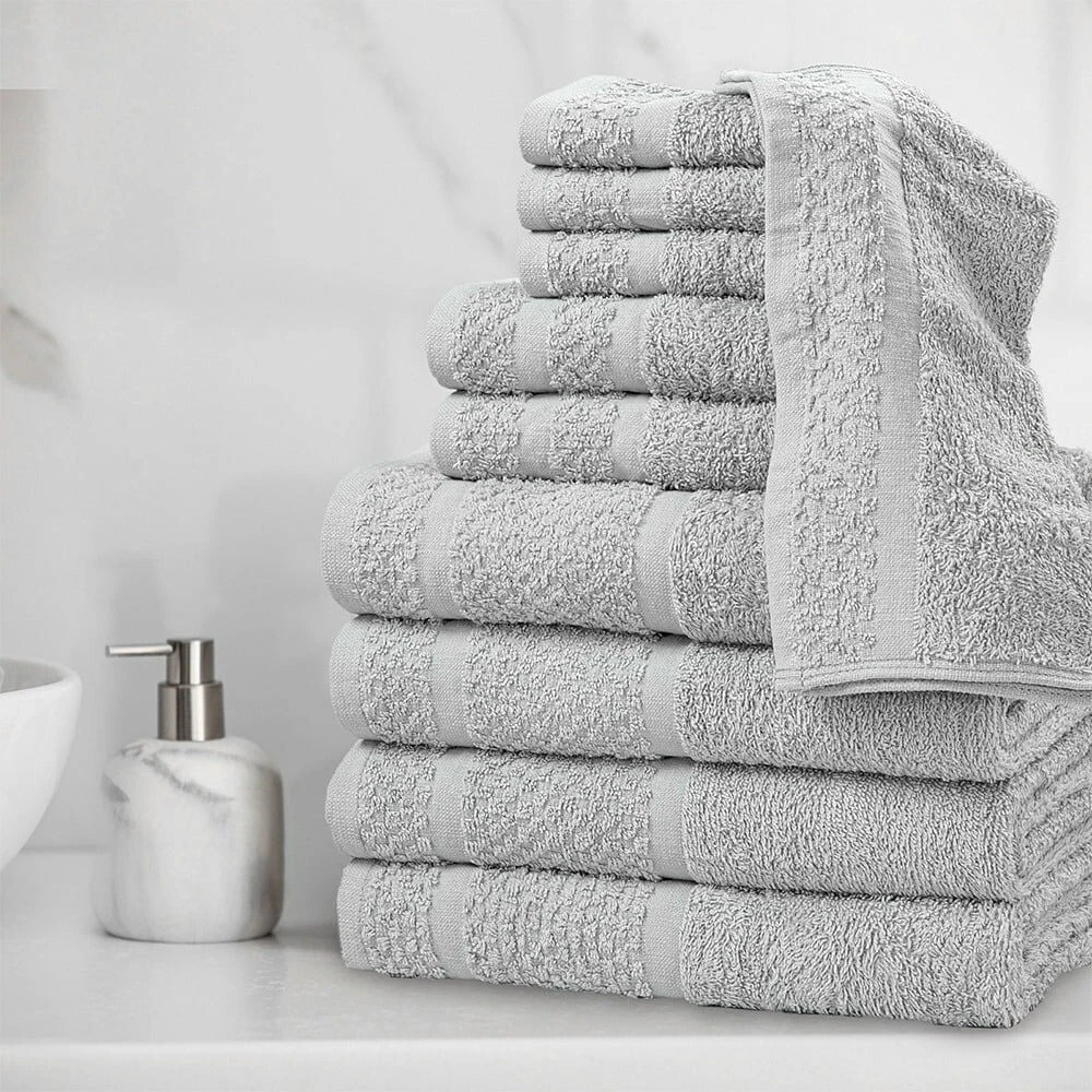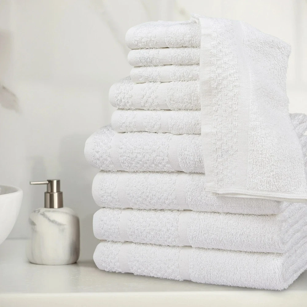 Product details Embrace yourself in the comfort of the Value 10-Piece Towel Set. Made from soft, absorbent 100% cotton, these towels dry quickly . The new design features a popcorn textured border for a fresh look in your bathroom, and double needle stitching for durability. This fade-resistant set includes four bath towels, two hand towels, and 4 washcloths, All age group. and all machine washable. 10-piece set includes 4 bath towels, 2 hand towels, and 4 washcloths New design with a popcorn textured border Stylish cotton bath towels feature double needle stitching for even more durability an everyday must-have for your bathroom. for adults Soft, absorbent, and fade-resistant Made of 100% cotton All age group. Specifications Collection value towel Towel & Washcloth Type Bath Towels Material Cotton Fabric Content 100% Cotton Grams per Square Meter (GSM) 372 gsm Color White and Grey Pattern Solid Print Theme value towel Piece Count 10 Items Included bath towel , hand towel , washcloth Features Quick Dry Assembled Product Weight 3.02 lb Number of Bath Towels 4 Number of Hand Towels 2 Number of Washcloths 4 Shape Rectangle Assembled Product Dimensions (L x W x H) 11.50 x 8.00 x 8.00 Inches Directions Fabric Care Instructions Machine wash warm with like colors, Deep color bleeds, Wash Before Use., Tumble Dry , Do Not Bleach Color Towels Package Includes 4 * bath towels 2 * hand towels 4 * washcloths