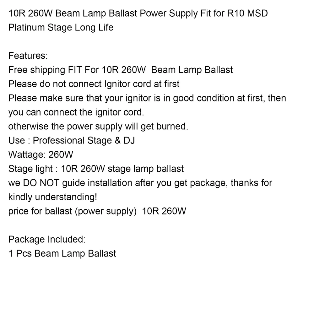 MPN: E201-H004-260W Wattage: 260W Type: Ballast Power: 260W Warranty Terms: 6 Month Compatible Brand: For OSRAM Stage light: 10R 260W stage lamp ballast lamp model: 10R Brand: Vipjq gtin13: Does not apply Use: Professional Stage & DJ Manufacturer Part Number: E201-H004-260W UPC: Does not apply