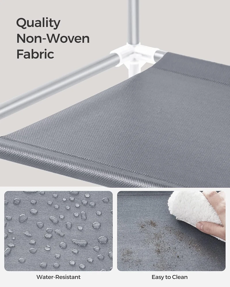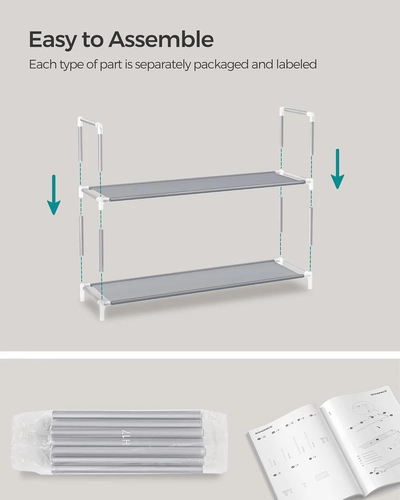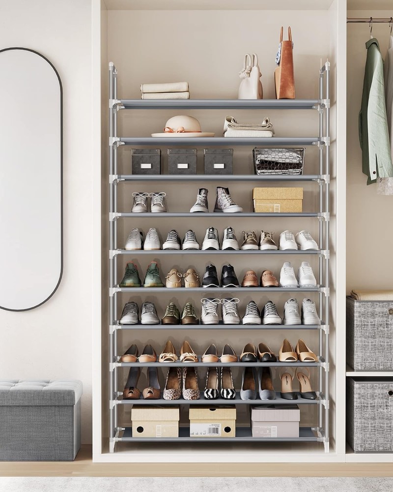 This shoe rack is a game-changer for small spaces! It holds up to 50 pairs without taking up much room, and the sturdy metal frame keeps everything neat. Assembly was a breeze with labeled parts and clear instructions. The non-woven fabric shelves are surprisingly strong, holding everything from flats to boots. Perfect for closets or hallways—highly recommend for anyone needing extra shoe storage!