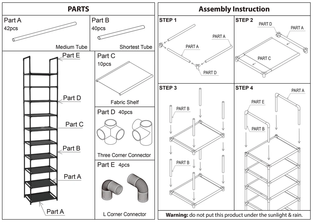 MATERIAL & STRUCTURE: Made from Durable waterproof non-woven fabric tiers , Strengthened plastic connectors and thickened iron pipes. Short design of shelf pipes are hard to bend even put larger & heavy objects, that makes this rack sturdier, stabler and longer lifetime. STORE CAPACITY: 10-tier rack can hold up 10 pairs of adult shoes, each shelf hold 1 pair, much more space saving. You can remove one layer to fit boots, high heels. This rack is not only for shoes, but also for tiny things, such as CD, toys, towel, sundries, books, plants and small accessories. MEASURES: 11 "L x 11"W x 68.8"H, perfectly storage for your closet, entryway, dormitory, apartments, garage, etc. EASY ASSEMBLY: No tools needed, simply assemble the unit by hand with provided parts, quickly and brings you great convenience. You can also separate it into 2 5-tier racks. MATERIAL & STRUCTURE: Made from Durable waterproof non-woven fabric tiers , Strengthened plastic connectors and thickened iron pipes. Short design of shelf pipes are hard to bend even put larger & heavy objects, that makes this rack sturdier, stabler and longer lifetime. STORE CAPACITY: 10-tier rack can hold up 10 pairs of adult shoes, each shelf hold 1 pair, much more space saving. You can remove one layer to fit boots, high heels. This rack is not only for shoes, but also for tiny things, such as CD, toys, towel, sundries, books, plants and small accessories. MEASURES: 11 "L x 11"W x 68.8"H, perfectly storage for your closet, entryway, dormitory, apartments, garage, etc. EASY ASSEMBLY: No tools needed, simply assemble the unit by hand with provided parts, quickly and brings you great convenience. You can also separate it into 2 5-tier racks. LIFE SPAN: more than 2 years, any quality issues and problems of this product, free to change new one, or money back.