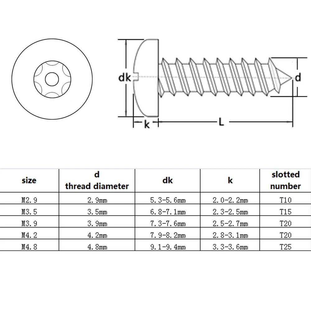 There are torx pan head with pin self-tapping screw Material 304(A2-70) stainless steel Size : d(thread diameter) x L(thread length) Thread diameter: 2.9mm / 3.5mm / 3.9mm / 4.2mm / 4.8mm Thread length: 8-60mm On Dec 14, 2024 at 23:16:47 PST, seller added the following information: