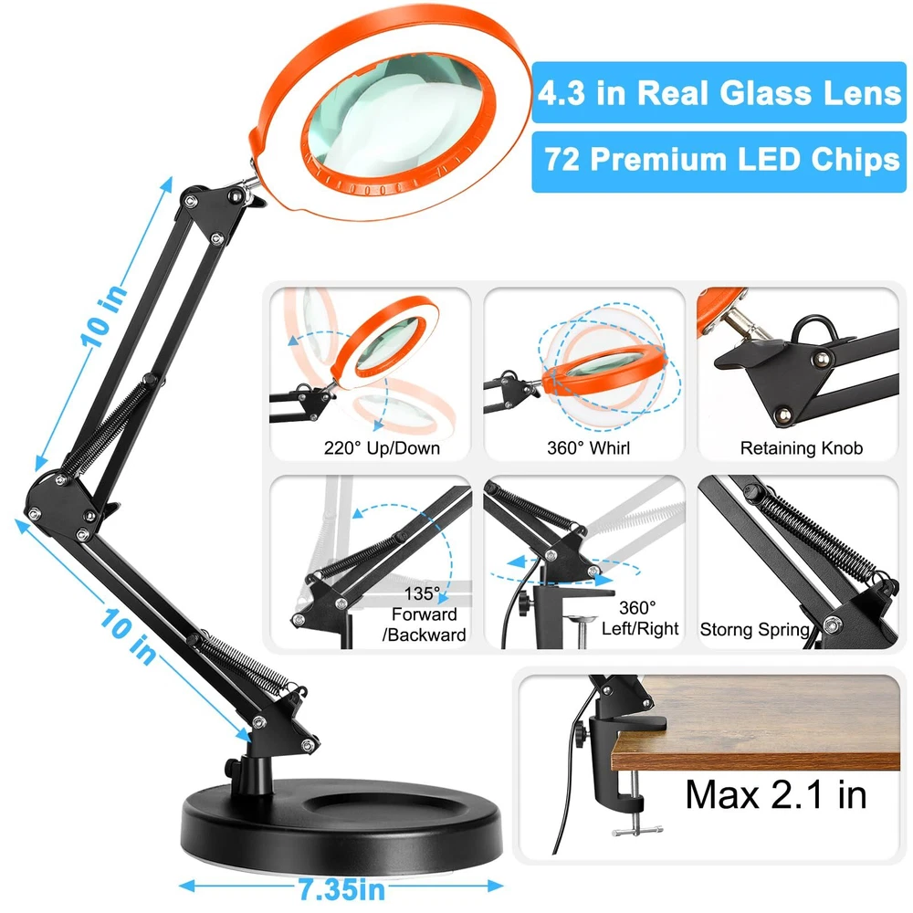 Multifunctional desk lamp with magnifying glass and light Free your hands, Eye protection and energy saving Craft magnifying glass with light hands free is designed with a 4.3" real glass lens for a clearer view. 2-in-1 desk lamp & clamp light design meets more usage needs. It's great for people who need to work continuously at close range or who need visual aids. 10X magnifying work light & Real Glass Lens High-Quality 4.3" real glass lens can provide you clear, undistorted, and realistic visual effects. There is no dizziness even if use it for a long time. 72Pcs LED Beads Light with magnifying glass adopts a ring design with 72pcs built-in super brightness LED provides you with an even, soft light and a large area of illumination. Without glare and flicker. 2-in-1 Desk Lamps & Clamp Light Led magnifying lamp come with a weighted base and clamp, You can easily switch to a desktop standing magnifier or clip light without any tools. Memory Function Desktop magnifying glass with light has memory function, your lighting preferences are conveniently stored, ensuring a consistent and personalized lighting experience every time you use it. Give the best gifts to the seniors We have launched a unique desk light with magnifying glass: it can be applied to welding, crafts, reading, miniature painting, read, sewing, hobbies, mini tasks, jewelry, soldering, beading, fly tying, etc. The lighted magnifier with stand will be your best choice. Specifications: Lens Material: Real Glass Type: Base and Clamp Switch Mode: Button Switch Package Includes: 1 * Magnifying Lamp 1 * Metal Clamp 1 * Desktop Base 1 * Adapter 1 * User manual 【10X Magnification & Real Glass Magnifier】Magnifying glass with light features a 4.3" real glass lens that provides a clear and distortion free view. The 10X magnifying lamp is especially suitable for crafts, reading, miniature painting, sewing, cross stitch, mini tasks, diamond painting, puzzle, jewelry, hobbies, manicure, soldering, repair, nails tech, needlework, beading, fly tying, needlepoint, drawing, book, knitting, solder, etc. Our magnifier with light is designed to meet your needs. 【Upgraded 2-in-1 Desk Lamp & Clamp Light】Magnifying light for crafts hands free come with a weighted base and clamp. You can use the base as a table lamp, which is heavy enough to support a magnifying lamp with light. It also comes with a metal clip that easily attach them to flat surfaces up to 2.1 inches thick, more firm and stable mounted to the desktop, tabletop or workbench. Handsfree lighted magnifying glass with stand to free your hands can point glass and light to the location you need. 【Upgraded Head Button】The desk magnifying glass with light features an upgraded head button to experience hassle-free operation. Unlike other magnifying desk lamps with switches on the power cord, our head button allows for easy and intuitive control. And adjustable swing arm allows you to choose the angle you want. The magnifying glasses with light for close work make it easier to operate the buttons to adjust the 5 color modes and stepless dimming brightness. 【5 Color Modes & Stepless Dimmable】Magnifier with light and stand offers 5 color modes and 10 dimmable brightness to suit your needs. High-Quality ring LED lights provide you with even, flicker-free light, giving you a clearer view and reducing eye fatigue caused by prolonged observation. The table magnifying glass with light has a memory function can keep the mode and brightness last used.