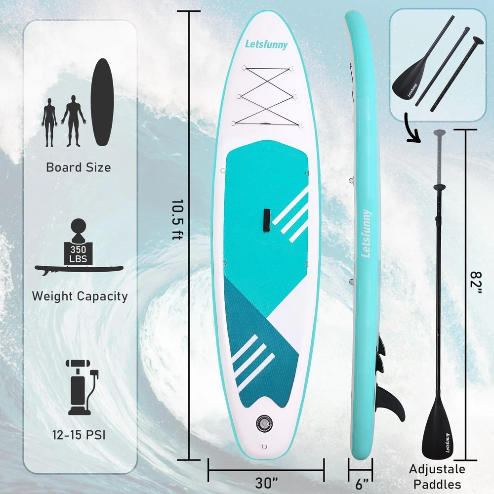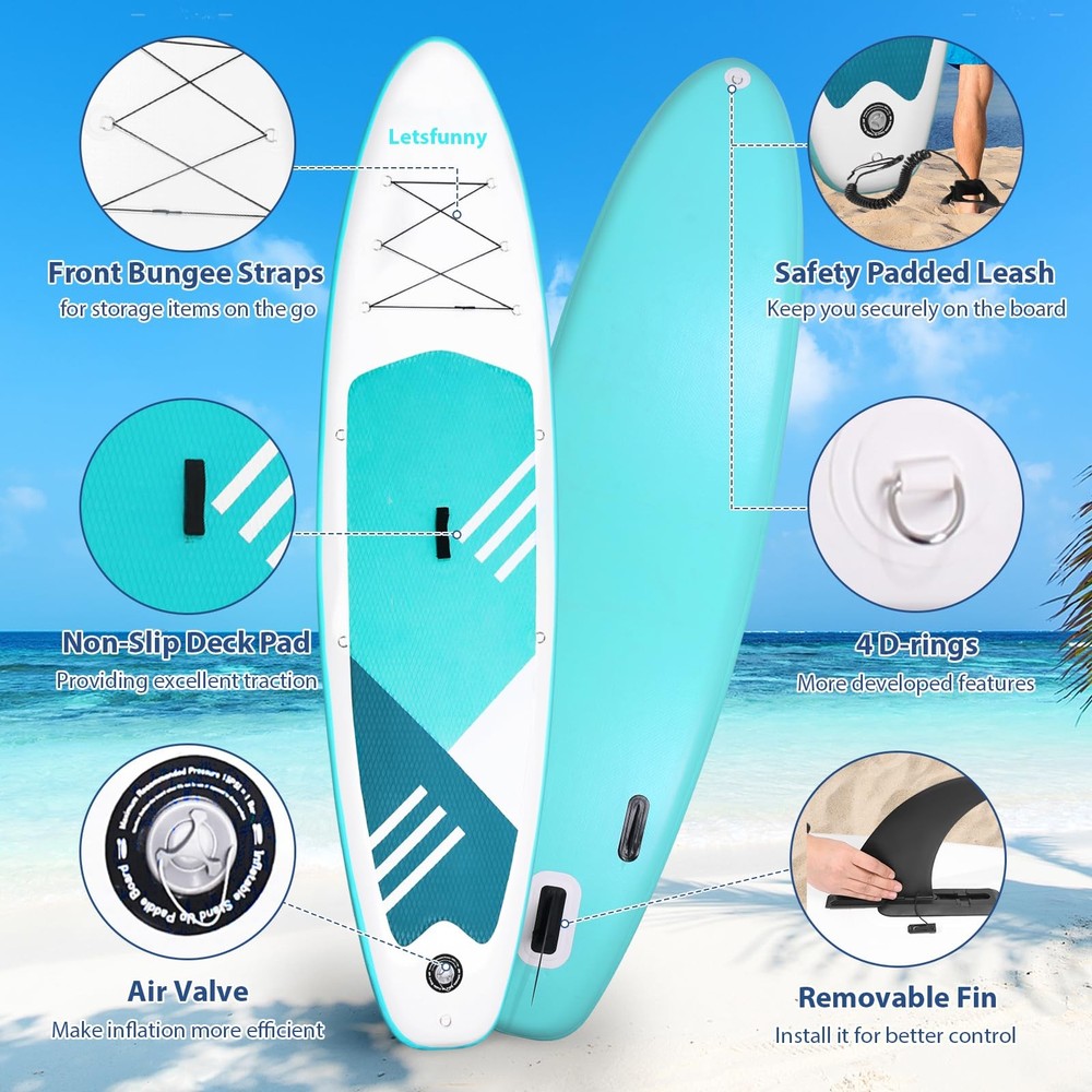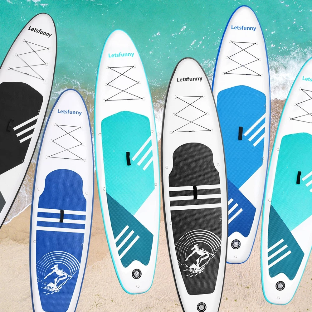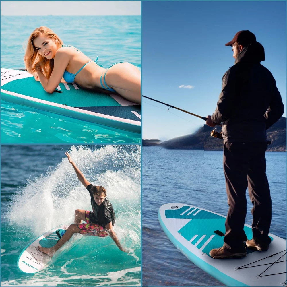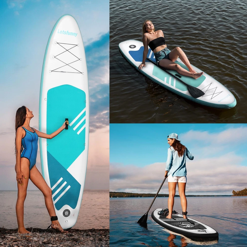 If you are looking for a paddle board, a sup paddle board, or a inflatable paddleboard, I believe this inflatable paddle boards is the right product for you. ADVANTAGES: Multiple Colours: Black / Green / Blue Non-slip Surface & Safe: Designed with non-slip surfaces and elasticated materials to reduce injury and noise. Easy to Carry: When not in need of use, you can easily fold it up and put it inside the bag to save your space. Widely Application: This inflatable sup can be used in various water conditions, such as the ocean, lake, and river, and is versatile enough for yoga, surfing, exploring, traveling, and fishing. What's in the package? Inflatable Stand Up Paddle Board, portable carry bag, hand pump with a psi reader,safety leash, removable fins, adjustable paddles and repair kit STABLE & DURABLE -- Our paddle boards are made of high-strength PVC, with a wide, sturdy shape that provides excellent stability and balance on the water PORTABLE & EASY TO USE -- Inflatable paddleboard can be easily deflated and rolled up for easy storage and transportation. Comes with a larger backpack, perfect for beginners, families, and for yoga or simple relaxation VERSATILITY -- SUP paddle boards are suitable for a variety of water adventures, sports and recreational activities such as fishing, yoga, surfing and more COMPLETE ACCESSORIES -- Hand pump with psi reader, safety leash, removable fins, larger backpack, adjustable paddles, and repair kits for a complete experience QUALITY GUARANTEED -- offer 1 year warranty, please feel free to contact us if you have any questions about inflatable paddle boards