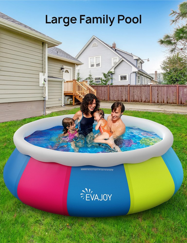 【Family Size Swimming Pool】Measures 10 feet in diameter and 30 inches deep, and has a water capacity of 956 gallons, the swimming pool above ground is ideal for 5 people and is big enough for the whole family to enjoy summer fun together. 【Easy Set Up Pool】Just spread out the quick set pool on level ground, then inflate the top ring with an air pump (not included), then fill the pool with water to 80% full (keep the bottom of the pool flat during the filling process), and the fun can begin! 【Durable Triple-Layer PVC】The hull of the kiddie pool is made of 0.55mm 3-layer material, the inner and outer layers is PolyLaminate PVC, the middle layer is Polyester Mesh, make this family swimming pool more durable and stable. 【Anti-aging and anti-fading】The surface of the inflatable swimming pool is protected by anti-ultraviolet coating, which is resistant to aging and ensures that the color will not fade in the sun, it's an inflatable kids pool for your backyard or garden. 【With Pool Cover】The kids pool comes with a pool cover to keep the water clean when not in use and designed to have two reserved circulation outlets and drainage work with filter pump (not included)