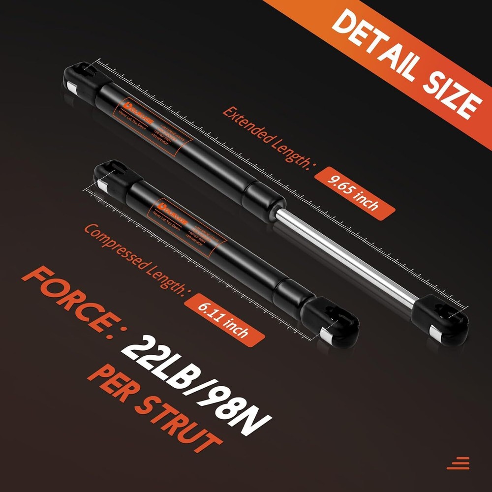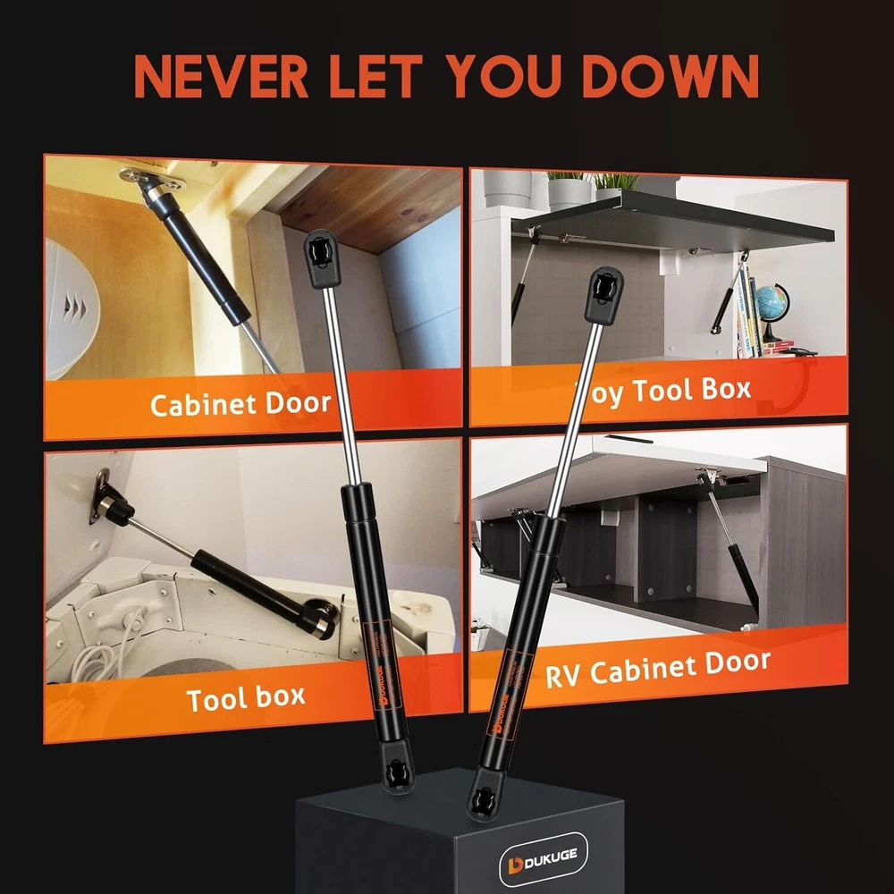 Free eBay listing template designed by dewiso.com 10 inch 22lbs/98N Gas Struts, 2PCS 10" Gas Shock Lift Spring Prop for Truck Pickup Tool Box Lid Weatherguard Aluminum UWS Toolbox Boat Storage Lid RV Cabinet Door FREE AND FAST SHIPPING! About this item [Dukuge 10 inch Tool Box Hydraulic Arms]:Extended Length( hole to hole): 10", Compressed Length( hole to hole): 6.2", Force: 22Lb/98N per shock. Package include 2 Pcs struts, 2 sets of mounting brackets and 8 screws. Applicable Lid/Door Weight: 18-25 lbs [Warm Tips]: For your shopping experience, please measure the weight of your lid or door before purchasing [Most Commonly Used]: Dukuge 10 inch 22 pound gas spring for truck pickup tool box, aluminum toolbox, RV cabinet door, weatherguard toolbox lids, bass boat storage cover, industrial tractor door, cabinet door replacement struts, and other custom project [Why Choose Us]: 10 gas shock 22lb have gone through more than 30 testing procedures, 18,000 times of compression test, fearless of high temperature and cold. Give you a reliable using experience [Dukuge Promise]: Dukuge 10 inch tool box hydraulic lid cylinders comes with 18 months product support - If you have any questions before or after your purchase, you can come to us at any time to let us know, and we will provide professional service for you within 12 hours › Product We offer a 30-Day Return Policy on items which you are not completely satisfied with. You have the option for a full-refund or an exchange of the item. No returns are available on items shipped outside of the US . Shipping We offer Free Shipping to the US and ship within 2 business days of payment, usually sooner. We use UPS express shipping. That's why your products are usually delivered within 3 days . Contact We try our very best to make sure every customer is completely satisfied. If there's a problem , message us! We're happy to help. 24/7 live chat available.