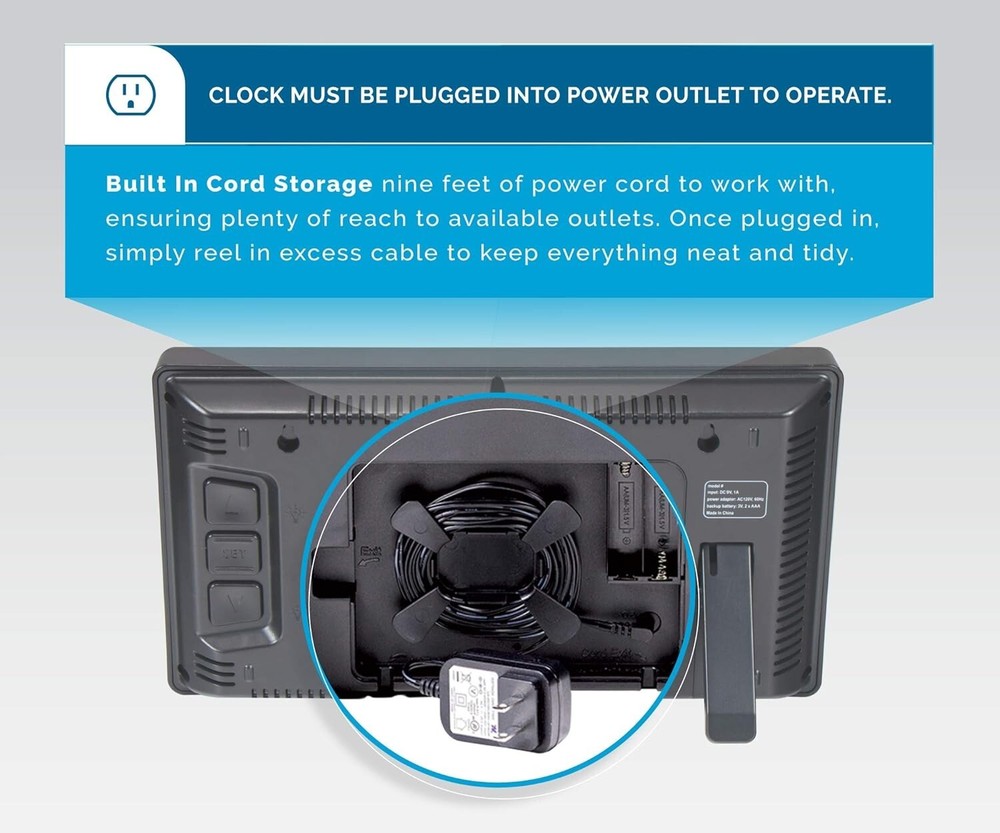 75099M 10-inch LED Digital Clock with Auto Dimming Brightness Red Six different lightning settings includng auto-dim mode Oversized tall digits allow for easy-viewing from across the office, classroom, or living room Easy to mount as a digital wall clock using the integrated keyholes, or use the fold-out stand for desk placement Powered by 9-foot power adapter (REQUIRED) with integrated cord storage Battery operated back up keeps the time in the event of a power outage The 10-inch LED digital clock is the perfect addition to any home, office or classroom. Its large numbers make viewing from across the room simple so that you always know the time. The clock also features 6 different lighting options including an Auto-dim mode so that the Clocks bright lights don't keep you up at night. It is powered by a 9-foot power adapter and features cord storage to secure excess cord. Integrated keyholes for easy wall-mounting and sits upright for tabletop use with its fold-out stand.