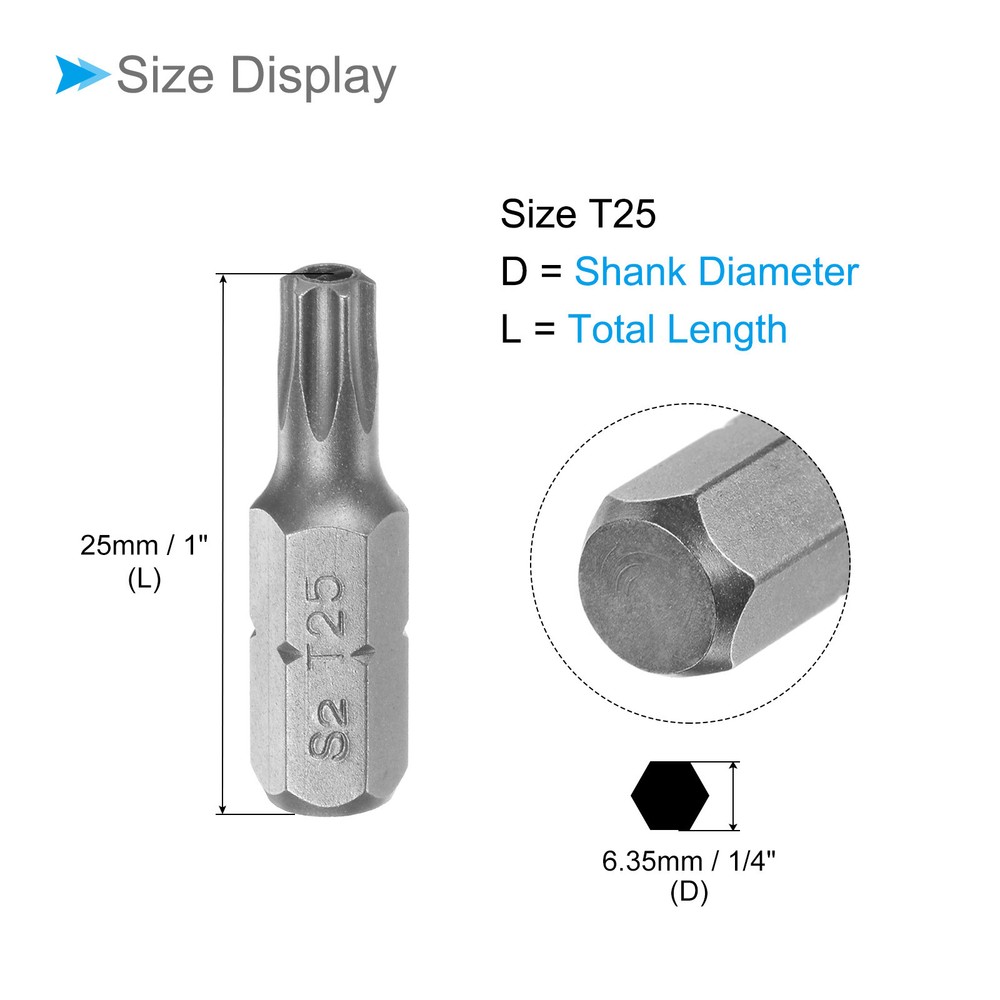 Document Attributes:* Shank Size: 1/4"* Total Length: 25mm / 1"* Bit Type: T25 * Material: S2 SteelWhat Is Included:* 10 Piece x Torx Screwdriver BitApplications & Features:--- Those bits fit for electric screwdrivers, hand screwdrivers, electric drills, air drills, air batches and 1/4" screwdriver sets.--- The torx screwdriver bits are made of S2 steel, which ensures high hardness, durability and wear resistance.--- These screwdriver bits are magnetic, which can firmly absorb the screw to prevent it from falling off.--- The star head bits are easy to install on the screwdriver handle with double ear on the sides of the bit shank.Useful Tips:--- Please apply appropriate force. Excessive force may cause the bit to slip, while insufficient force may not effectively tighten or remove the screw. 10pcs Torx Screwdriver Bits 1/4" Hex Shank 25mm T25 Magnetic Screwdrivers Bit Attributes: * Shank Size: 1/4" * Total Length: 25mm / 1" * Bit Type: T25 * Material: S2 Steel What Is Included: * 10 Piece x Torx Screwdriver Bit Applications & Features: --- Those bits fit for electric screwdrivers, hand screwdrivers, electric drills, air drills, air batches and 1/4" screwdriver sets. --- The torx screwdriver bits are made of S2 steel, which ensures high hardness, durability and wear resistance. --- These screwdriver bits are magnetic, which can firmly absorb the screw to prevent it from falling off. --- The star head bits are easy to install on the screwdriver handle with double ear on the sides of the bit shank. Useful Tips: --- Please apply appropriate force. Excessive force may cause the bit to slip, while insufficient force may not effectively tighten or remove the screw. Hot Item Payment 1.We accept eBay payment . 2.Payment must be received within 7 business days of auction closing. Shipping 1.We ship to your eBay or Paypal address. Please make sure your eBay and Paypal address is correct before you pay. 2.Items will be shipped within 1-3 business day when we received payment. 3.Delivery time depends on destination and other factors. Description Policy 10pcs Torx Screwdriver Bits 1/4" Hex Shank 25mm T25 Magnetic Screwdrivers Bit Attributes: * Shank Size: 1/4" * Total Length: 25mm / 1" * Bit Type: T25 * Material: S2 Steel What Is Included: * 10 Piece x Torx Screwdriver Bit Applications & Features: --- Those bits fit for electric screwdrivers, hand screwdrivers, electric drills, air drills, air batches and 1/4" screwdriver sets. --- The torx screwdriver bits are made of S2 steel, which ensures high hardness, durability and wear resistance. --- These screwdriver bits are magnetic, which can firmly absorb the screw to prevent it from falling off. --- The star head bits are easy to install on the screwdriver handle with double ear on the sides of the bit shank. Useful Tips: --- Please apply appropriate force. Excessive force may cause the bit to slip, while insufficient force may not effectively tighten or remove the screw. Hot Item Payment 1.We accept eBay payment . 2.Payment must be received within 7 business days of auction closing. Shipping 1.We ship to your eBay or Paypal address. Please make sure your eBay and Paypal address is correct before you pay. 2.Items will be shipped within 1-3 business day when we received payment. 3.Delivery time depends on destination and other factors.