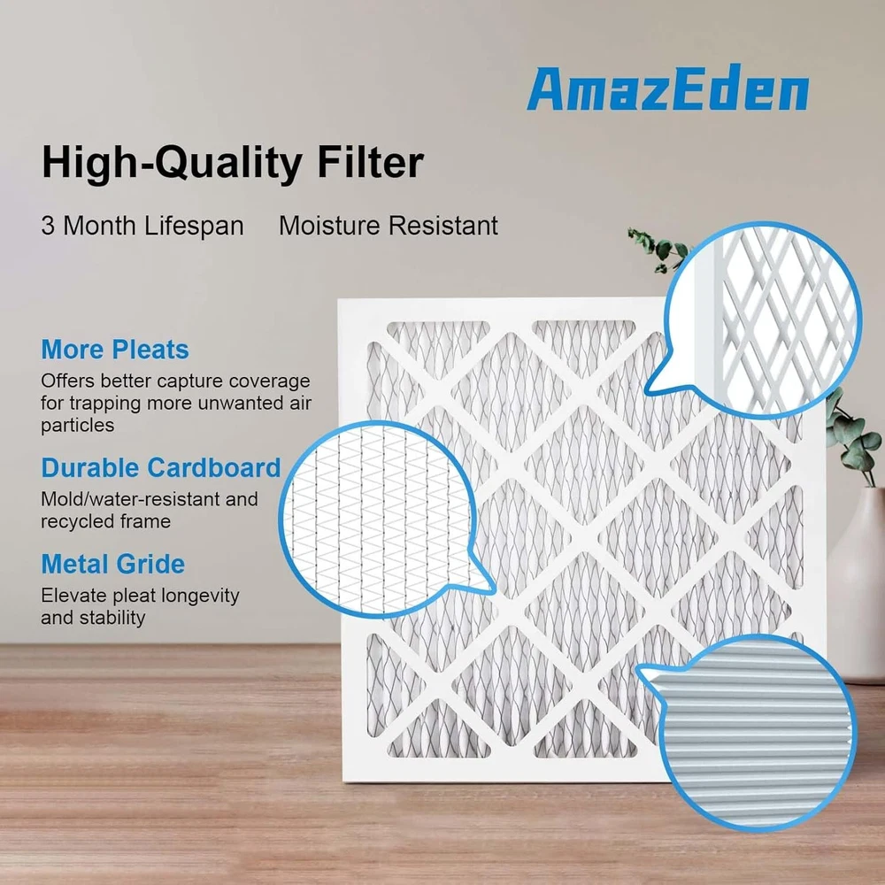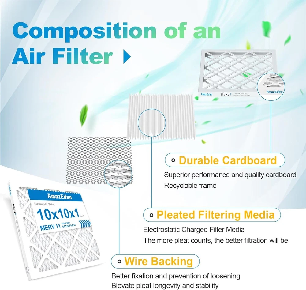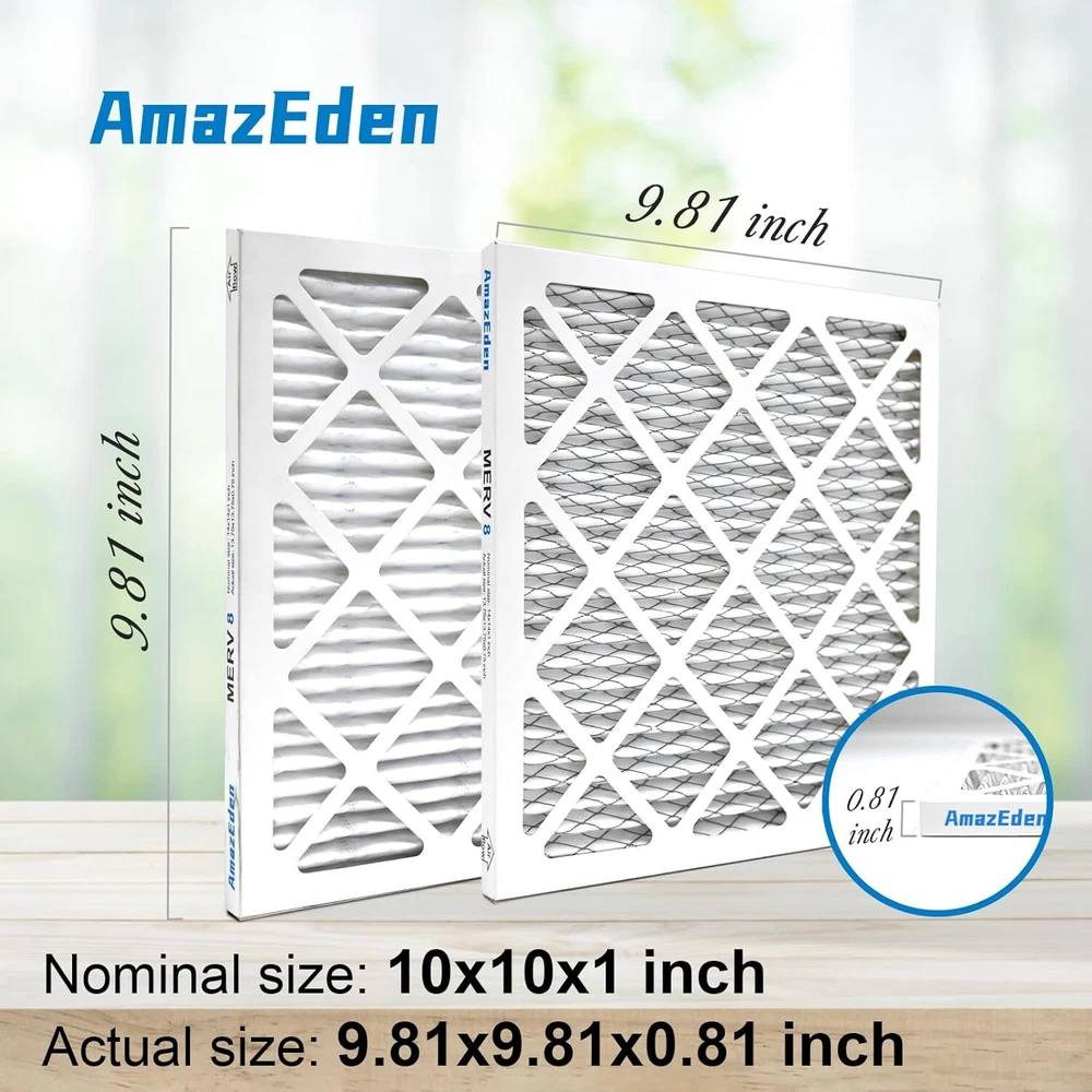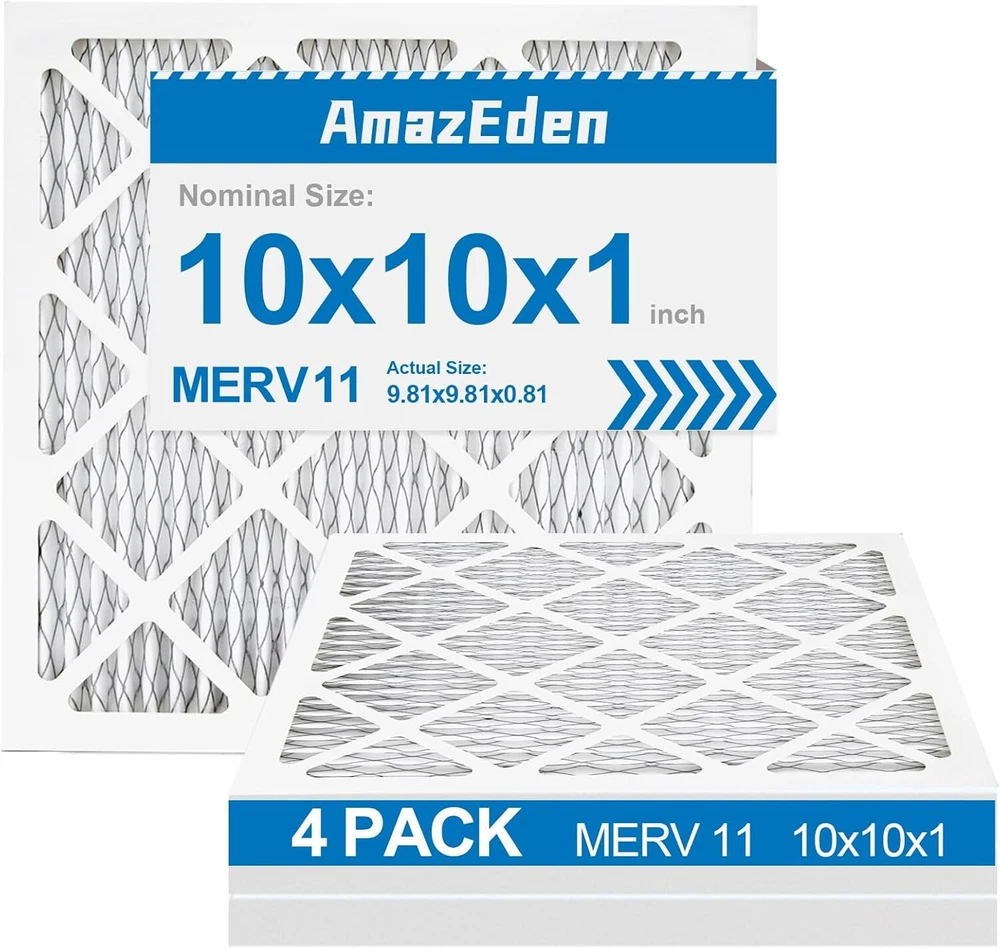 10x10x1 AC Furnace Air Filter (4-Pack) MERV 11 MPR 1000 & FPR 7 Pleated HVAC Furnace Dust Defense Air Filters Replacement (Exact Dimensions: 9.81x9.81x0.81 Inches) Product Details Brand: AmazEden Material: Cotton Product Dimensions: 9.81"L x 9.81"W x 0.81"Th MERV Rating: 11 Compatible Devices: Air Conditioner, Heat Pump, HVAC System, Furnace Number of Items: 4 Manufacturer: AmazEden Unit Count: 4.0 Count 10x10x1 air filters commonly used for furnace, air conditioner, heat pump, or HVAC system. (Exact Dimensions: 9.81x9.81x0.81 Inches). Home air filter 10x10x1 MERV 11 (comparable with MPR 1000 & FPR 7) HIGH-EFFICIENCY FILTRATION synthetic media protects homes from dust by trapping 95% of airborne particles without impacting air flow. The furnace air filters adopt ADVANCED PLEATED TECHNOLOGY to expand air coverage to improve capture capacity. Combined with a sturdy frame ensuring a stable structure for optimal efficiency and low resistance to airflow. 10x10x1 air filter for home with a higher pleats count than others.SUFFICIENT MATERIAL can give you a better air filtration effect. Providing a meaningful improvement in indoor air quality. The MERV 11 air filter can be installed in minutes without the use of any tools. Friendly tips: each inner filter is recommended to be changed every 3 months or sooner for optimal performance.