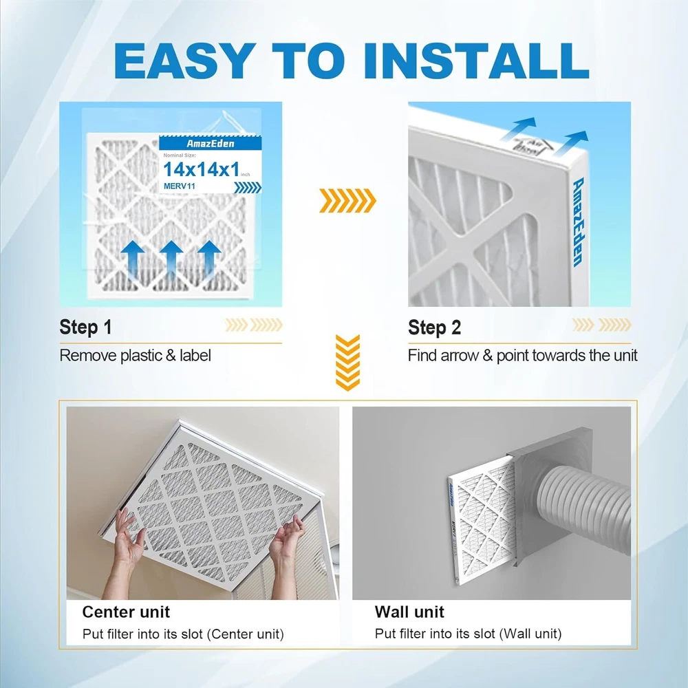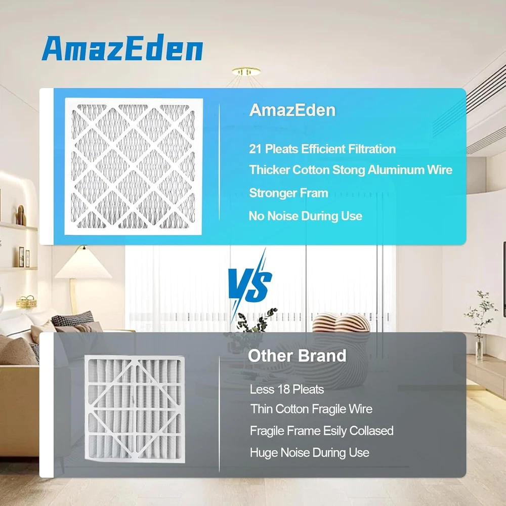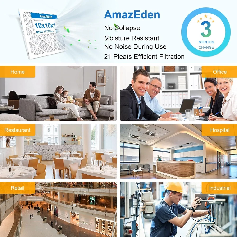 10x10x1 AC Furnace Air Filter (4-Pack) MERV 11 MPR 1000 & FPR 7 Pleated HVAC Furnace Dust Defense Air Filters Replacement (Exact Dimensions: 9.81x9.81x0.81 Inches) Product Details Brand: AmazEden Material: Cotton Product Dimensions: 9.81"L x 9.81"W x 0.81"Th MERV Rating: 11 Compatible Devices: Air Conditioner, Heat Pump, HVAC System, Furnace Number of Items: 4 Manufacturer: AmazEden Unit Count: 4.0 Count 10x10x1 air filters commonly used for furnace, air conditioner, heat pump, or HVAC system. (Exact Dimensions: 9.81x9.81x0.81 Inches). Home air filter 10x10x1 MERV 11 (comparable with MPR 1000 & FPR 7) HIGH-EFFICIENCY FILTRATION synthetic media protects homes from dust by trapping 95% of airborne particles without impacting air flow. The furnace air filters adopt ADVANCED PLEATED TECHNOLOGY to expand air coverage to improve capture capacity. Combined with a sturdy frame ensuring a stable structure for optimal efficiency and low resistance to airflow. 10x10x1 air filter for home with a higher pleats count than others.SUFFICIENT MATERIAL can give you a better air filtration effect. Providing a meaningful improvement in indoor air quality. The MERV 11 air filter can be installed in minutes without the use of any tools. Friendly tips: each inner filter is recommended to be changed every 3 months or sooner for optimal performance.