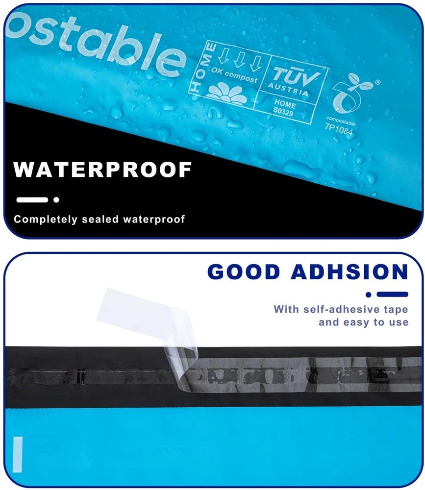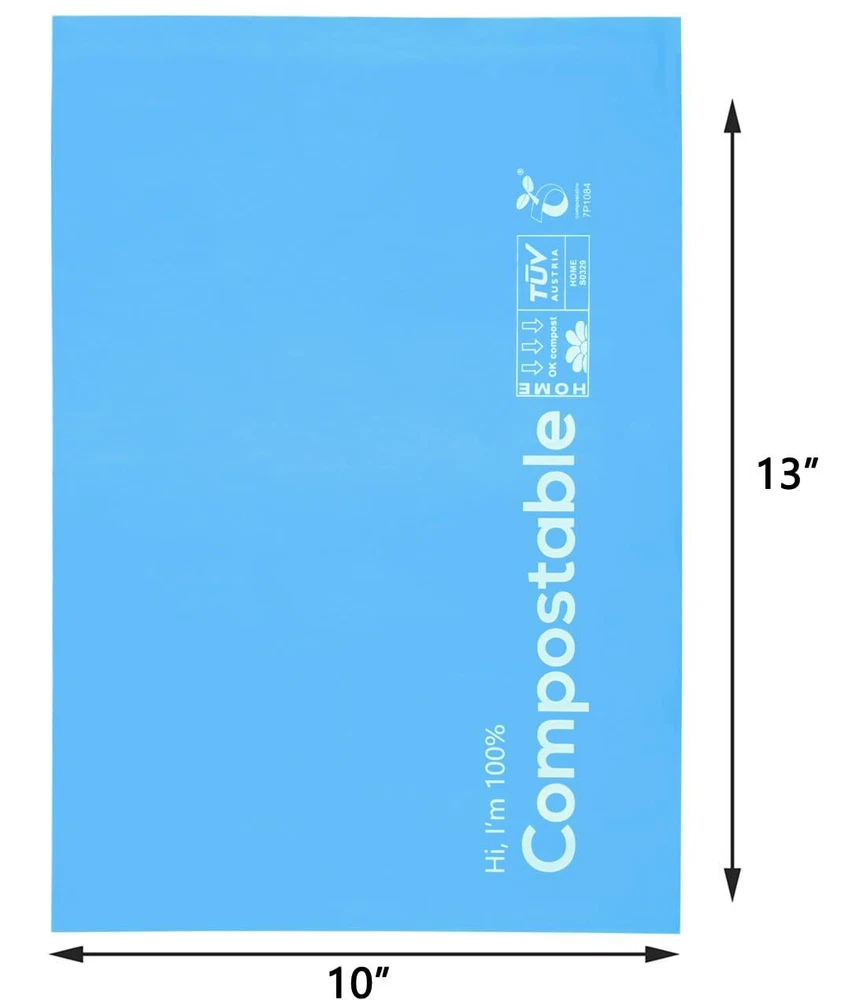 KTOB Blue Compostable Poly Mailers with Adhesive Self-Sealing Strip Eco Friendly Envelopes Supplies or Mailing bags for Clothing Quantity: 50 Pieces Additional Details: Self-sealing, peel and stick, adhesive keeps contents secure and tamper proof Extremely lightweight material helps save on postage High strength seams for maximum protection 100% BIODEGRADABLE - Made of PBAT and modified corn starch in accordance with the standards of ASTM 6400, EN13432, BPI and OK COMPOST HOME. This material is BPA-free, non-microplastic and represents a 60% reduction in CO2 emissions compared to traditional plastics. LEAVE A LASTING IMPRESSION - Your customers will be surprised and relieved to open shipping bags made of plant based eco materials. Using biodegradable shipping supplies will speak volumes about your sense of social responsibility and the high grade of your brand, and bring you closer to your customers through a good corporate image. This small sustainable effort will bring your brand to the forefront. STRONG & DURABLE - These biodegradable shipping envelopes are resistant to moisture, water, punctures, and stretching. The adhesive strip is very strong, and the only way to open the packaging envelope is by cutting or destroying them. You can be sure that your parcels will reach your customers in the same state they left you - intact and looking awesome. CONVENIENT & ECONOMICAL - Simply peel and fold over to seal each package safely and securely. Compared to shipping boxes, this is an affordable (lightweight) and efficient (no tape required) alternative that makes your products feel more branded and like an exciting package you'd want to receive. Featuring a black inner lining, these fully opaque mailing bags help to respect the privacy of your customers. PERFECT FOR YOUR BUSINESS - Our 2.5 mil compostable poly mailers are unpadded and perfect for sending out non-fragile items such as clothing, shoes, and knitwear. These shirt poly bags will protect your online business from water damage and other superficial blemishes, and your customers will smile when they see them.