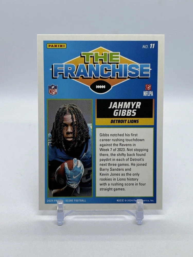 This 2024 Score sports trading card features Jahmyr Gibbs, player for the Detroit Lions in the NFL. The card is made of 20 pt cardstock, with a standard size, and is part of the Franchise Insert set. It has a base parallel/variety and is numbered 11 in the set. The card is in English and manufactured by SCORE. It does not include an autograph and is a great addition to any football fan's collection.