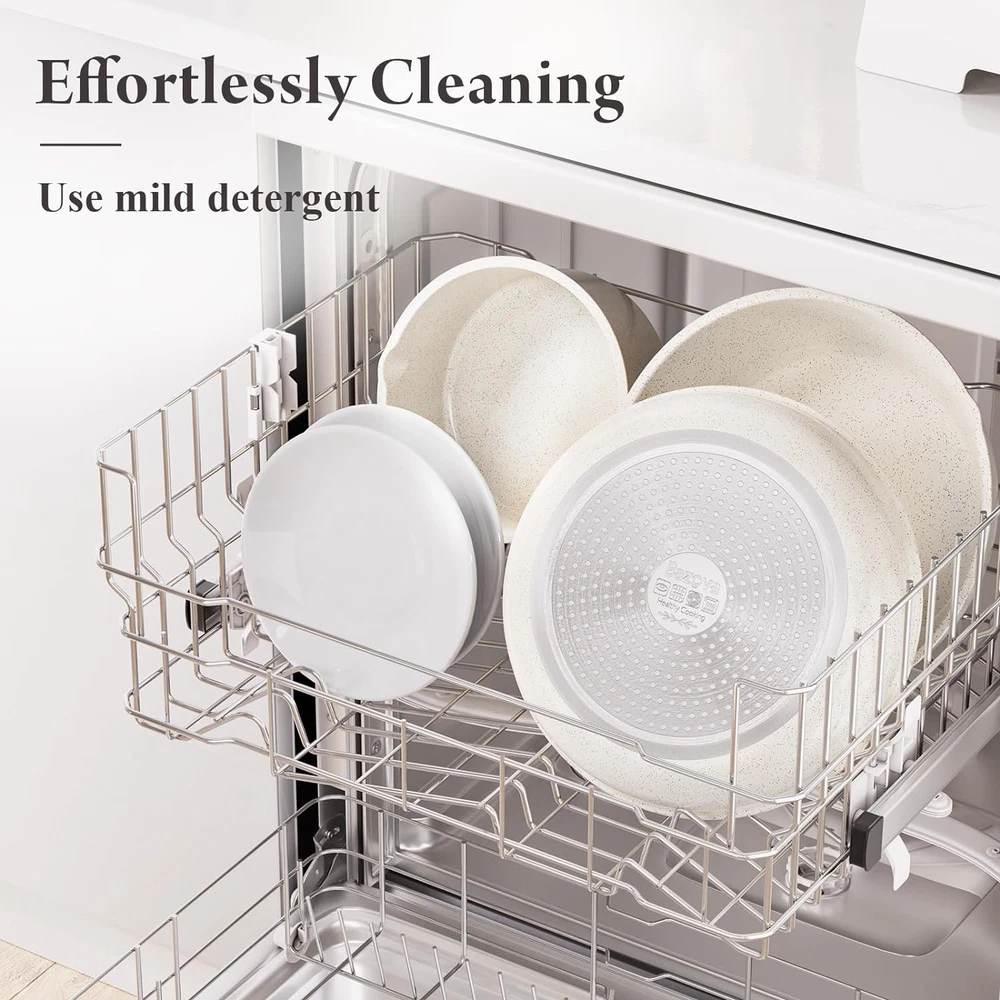 Healthy Ceramic Coating: Made of natural ceramic, our kitchen cookware set is Teflon-free and guarantees no PFAS, PTFE, PFOA,PFOS, lead, or cadmium.Stain-resistant and durable for long-lasting use; Ideal choice for safety-conscious families, especially those with babies Effortless Storage: Save 75% kitchen space by neatly stacking pots and pans in cabinets or drawers; perfect for compact spaces, RVs and campers Innovative Detachable Handles: Transform pots with a "CLICK" into baking dishes, serving plates, or fridge storage, enhancing versatility Ultra Non-Stick Performance: Experience 5X superior non-stick cooking with minimal oil - food just slides off smoothly.No toxic fumes emitted, even when overheated Easy Cleaning: While our cookware is dishwasher-safe for your convenience, we highly recommend handwashing. A simple rinse or quick wipe effortlessly removes any residue, ensuring your cookware remains spotless and maintains its pristine condition with ease Universal Cooktop Compatibility: Enlarged, thickened magnetic base ensures compatibility with all stovetops, including induction and oven; Crafted from recyclable aluminum ensures lightweight yet sturdy, and promotes rapid and even heating 11-Piece Set Includes: 1.3QT(6.3") & 1.8QT(7") saucepans, 8-inch & 11-inch frying pans, 3.2QT(10")sauté pan, 2 removable handles, 7-inch & 10-inch glass lid,silicone slotted turner & ladle Product Description Why Choose Bazova Detachable Handle Pots and Pans Set? Seamless mobility with a click – the removable handles provide flexibility, effortlessly transitioning cookware from stoves to the oven, grill, fridge, and finally to the dinner table. Explore the convenience now. A Versatile Set of Pots and Pans Servers as a frying pan, a dinner plate From Stove, To The Table Unlock the boundless potential of the cookware with its detachable handle – perfect for cooking on any stovetop or serving as elegant dinnerware on the table. Servers as an oven plate Remove Handle, To The Oven Just one click, remove the handle for oven use. Let's make delicious stews! Servers as RV cookware To the Outdoors Stackable and space-saving, our cookware is perfect for RV trips or camping. Enjoy the convenience and ease of bringing our versatile pots along on your journey. Optimal Storage Save 75% Space - Our cookware set is designed for perfect stacking in kitchen drawers, cabinets, cupboards,RVs, travel trailers and motorhomes. Important Tip- We suggest to detach the handle during cooking when you don't need it for fixing. This could greatly extend the lifespan of the handle. Cooking with Ceramic Nonstick Cookware Healthy and Safe Safety First - Our cookware features natural ceramic nonstick,setting it apart from Teflon - free from harmful chemicals and heavy metals such as PFAS,PTFE,PFOA,lead, and cadmium.Prioritize your health with a toxic-free cooking experience. Built for Last -Stain & scratch-resistant,keeps great nonstick performance even after years of use. With Bazova Ceramic Non-stick Ultra Smooth & Nonstick Easy Cooking Smooth interior makes it exceptionally nonstick - perfect for everyday cooking like pancakes, eggs, steaks, and fish. Clean with 5 Sec. Easy Cleaning Rinse or wipe clean - zero residue in 5 seconds. Alternatively, toss it in the dishwasher for time-saving convenience. Heat Transfer Even& Rapid Feature an enlarged and thickened bottom for rapid and even heating. All Stoves Compatible The magnetic conductive bottom ensures compatibility with all stovetops, including induction. 1 What's Included 2 Use & Care