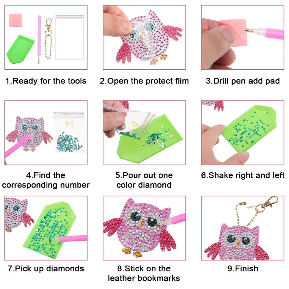 11 Pieces diy diamond painting keychains full round drill 5D diamond painting pendant owl and sea horse shaped diamond painting pendant ornaments for art craft, key ring, phone charm, bag decor Feature: Cultivate your ability: These diamond painting keychains allow you to diy sweet presents by yourself, enable you experience a sense of achievement, learn to reduce stress, emotional adjustment, enhance self-confidence and perseverance, cultivate your hands-on ability, color match recognition, coordination and so on, brighten up your leisure time. Wide applications: Ideal pendant decoration for car keys, mobile phones, wallets, handbags, backpacks or other items you want to decorate, good accessories for parties, anniversary, birthday, Christmas, Thanksgiving Day, Mother's Day, graduation or any other festivals. How to diy: 1. Peel off the protective film of the product. 2. Find the same diamond number according to the list of canvas and place these diamonds on a plate. 3. Put the clay on the diamond drill pen. 4. Use the diamond drill pen to paste the diamond and then paste in the corresponding diamond number. 5. Use a book or your hands to press the diamond to make it more stably. Specification: Material: PVC Pattern: owl, sea horse Color: assorted colors Package include: 11 x Diy diamond painting keychain 2 x Plate 2 x Diamond sticky pens 2 x Clay Note: Please do not fold the canvas to avoid crease. Small and inedible items included, please keep away from little kids to avoid accidental ingestion. Manual measurement, please allow slight errors on size. The colors may exist slight difference due to different screens. Adorable animal pattern: these diamond painting keychains feature three-dimensional beauty and dazzling luster, designed with cute animal patterns like owl and sea horse, various expressions and postures modeling looks vivid and delicate, can be served as nice ornaments to adorn your phone, bag, art crafts and more Durable and reliable: the diamond painting pendant is made of PVC plastic material, durable and waterproof to use, the adhesive is sticky enough to pick the rhinestones up, not easy to fall off, no color fading and not easy to break, durable for long-term use Enjoyable diy process: you should firstly prepare the necessary drill tools on a smooth and neat table, then stick a small amount of clay in the drill pen tip, use the pen to stick the diamond and paste into correct place according to corresponding diamond color number, finally use the key chain to buckle the finished diamond painting mould, easy to complete a beautiful diamond painting keychain Applicable occasions: these adorable diamond painting keychains can be attached to your keys, schoolbags, pencil cases, smartphones, manual crafts, handbags, backpacks and wallets, nice decorations to add charms and vitality to your personal items Complete diamond painting kit: you will receive 11 pieces diamond painting keychains in 2 styles, 2 pieces of plates, 2 pieces of drill pens and 2 pieces of clays in this package, complete diamond painting kit to satisfy your use and replacement