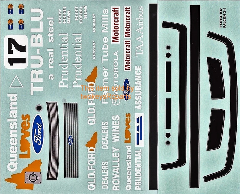 AS ALWAYS - before purchase - check the specs given below to ensure this body shell is suitable for your needs. CLEAR UNPAINTED LEXAN BODY SHELL (UNPAINTED) to suit a 1:10th scale touring, race, drift or rally car. Suit Nitro or Electric Body shell - Ford Falcon XD with Tru Blu livery as shown in pics #4 ~ #8 above, supplied with Tru Blu decals pics #9 & #10 and window masks -shown in pic #4 Pics #1~ #3 are sample pictures only.To did with decal placement. Pics #11 ~#14 are pics of customers completed body shells. Body shell is for a chassis (wheelbase) of 258 mm and an outer wheel track of up to 200mm . Part # M2346 Item is new, brand is Colt. All Colt shells are covered with clear spray film. Often shells are trimmed for freight purposes so excess plastic may be less than shown above. This item will be sent in a box (for safety) not a bag. Check out other great bargains in my E b a Y store , including more body shells. I am not a "drop shipper", all products are in stock in Australia being sold by an Australian seller. POSTAGE - AUSTRALIAN CUSTOMERS . If you want to use the Express Post service please buy one item and select Express post, then buy any other items you want with regular post (the default option). All items will be sent together via Express Post service……… INTERNATIONAL CUSTOMERS. For post quotes for multi item orders please message me. Thanks. All duties and taxes (if applicable) are the responsibility of the buyer. If you have any questions or special requests regarding this please feel free to message me. Manufacturers are constantly improving products and changes are made without prior notice. This means that changes can be made to products (including slight colour changes) from time to time. These changes in no way constitute any intent to change the basic description of an item, nor do they constitute a reason for an items return or warranty replacement. Return Policy: Any returns will be handled as per Ebay’s return policy. Returned items must be new, unopened and undamaged. Opened returns will attract a 50% “reduced value” fee. Any unrecoverable costs and fees incurred (by me) will be deducted from any refund issued. Warranty: items have a 30 day warranty, except drift wheels – which is ‘dead on arrival’ only. Warranty doesn’t cover crash damage, poor maintenance, misuse or incorrect assembly. Warranty covers sold items only.
