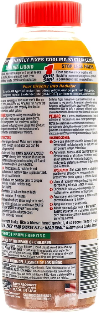 PERMANENTLY FIXES COOLING SYSTEM LEAKS: . One step formula permanently repairs coolant loss problems on cars, trucks, vans, SUV’s and RV’s. ANTIFREEZE COMPATIBLE - NO DRAINING REQUIRED: Antifreeze compatible sodium silicate liquid glass penetrates large and small leaks in plastic, aluminum and cast iron heads, blocks, intake manifold & gaskets, freeze plugs, heater cores and radiators. ONE STEP - POUR DIRECTLY INTO RADIATOR - EASY TO USE: Fiber additives lock together with liquid to increase strength and promote a permanent seal. It will not harm the coolingsystem when used properly, no draining is required. USE WITH ALL TYPES OF TRADITIONAL OR EXTENDED LIFE COOLANT: Use with ALL types of traditional or extended life coolant including yellow, orange, pink, red, blue, purple and green silicate based & non-silicate based (OAT/HOAT) 50-50 mix antifreeze, and/or water. Bar’s Leaks® Liquid Copper™ Block Seal Coolant Leak Fix Stop Leak seals larger leaks regular stop leaks won’t. One step formula permanently repairs coolant loss problems on cars, trucks, vans, SUV’s and RV’s. Antifreeze compatible sodium silicate liquid glass penetrates large and small leaks in plastic, aluminum and cast iron heads, blocks, intake manifold & gaskets, freeze plugs, heater cores and radiators. Fiber additives lock together with liquid to increase strength and promote a permanent seal. It will not harm the coolingsystem when used properly, no draining is required. Use with ALL types of traditional or extended life coolant including yellow, orange, pink, red, blue, purple and green silicate based & non-silicate based (OAT/HOAT) 50-50 mix antifreeze, and/or water.