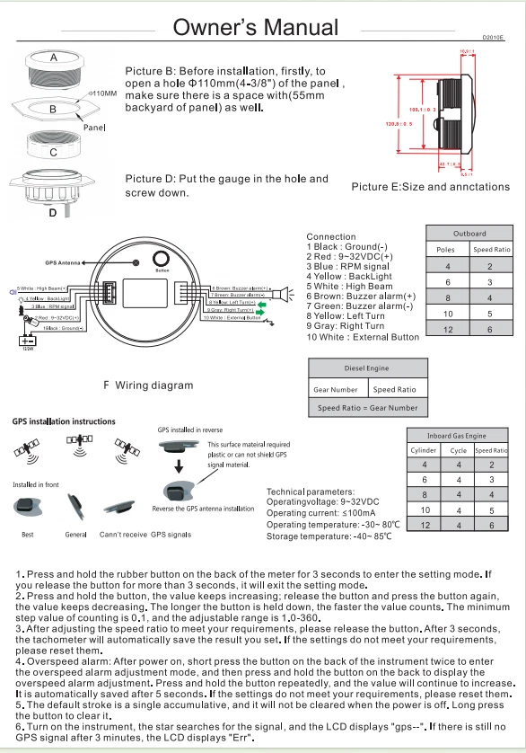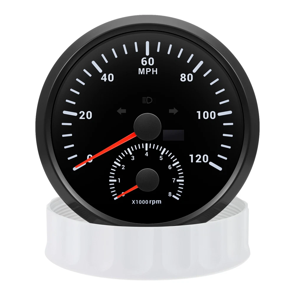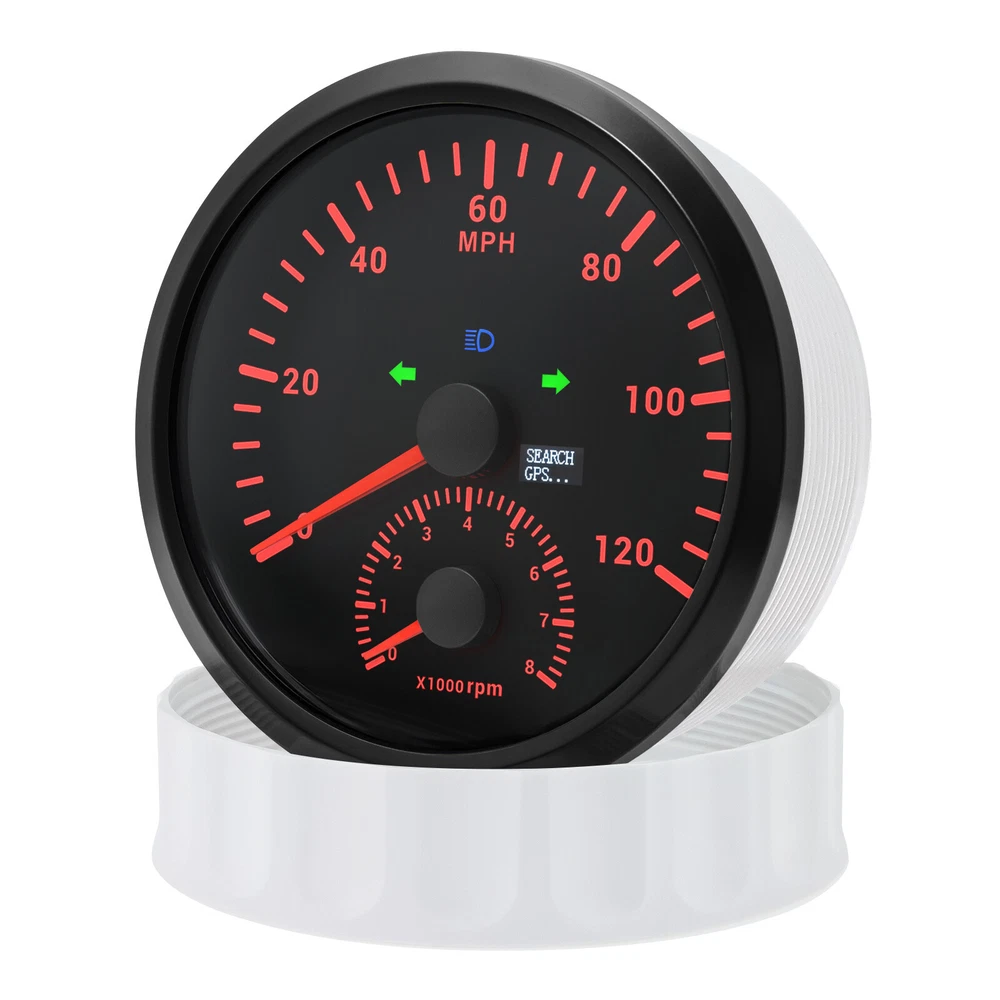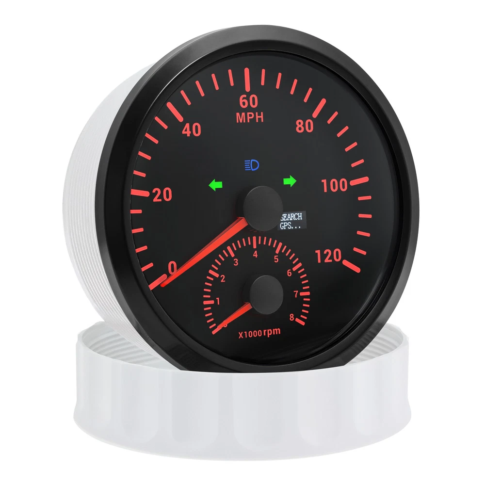 110MM BLACK GPS Speedometer 0-120MPH w/Tachometer 8000RPM Gauge for Boat Car ATV 110mm GPS Speedometer 0-120MPH With Tachometer Gauge 0-8000RPM for Car Marine Boat Features: Suitable for all vehicles and off-road vehicles The signal comes directly from the satellite signal receiver(GPS Antenna), don't need other speed sensor. The gauge has the advantages of high precision, quick location confirmation and short start up time. IP67 waterproof and dustproof grade Reverse polarity protection and anti-fogging performance Stepper motors used for full range of stepping gauges, great feature with its less power consumption, longer life, higher precision, etc. Specifications: Application: Universal fit for Motorcycle/ Boat/Truck/Bus/Car Electronic Speedometer (stepper motor) No Mechanic Sensor, get speed signal from GPS Speed ≠0 and show accurate speed in tunnel with the help of accelerometer GPS Blind Area Odometer Compensation OverSpeed Buzzer Alarm (Value Adjustable) Indication Light (Left, Right and High Beam Installation Diameter: 110mm (4-3/8") Speed Range: 0~120MPH RPM Range : 0~8000RPM Mileage Range: 0-99999.9miles Working Voltage: 12V/24V Working temperatures: - 40 to 85°C Protection rank: IP67 Waterproof Reverse polarity protection and anti-fogging performance Connection: 1. Black: Ground(-) 2. Red: 9-32VDC(+) 3. Blue: RPM Signal 4. Yellow: Backlight(+) 5. White: High Beam(+) 6. Brown: Buzzer alarm(+) 7. Green: Buzzer alarm(-) 8. Yellow: Left Turn(+) 9. Gray: Right Turn(+) 10. White: (no need connect)==(If need to connect, please connect negative) Package Included: 1x GPS speedometer 1x GPS Antenna 1x Multi-plug socket 1x Installation Instruction