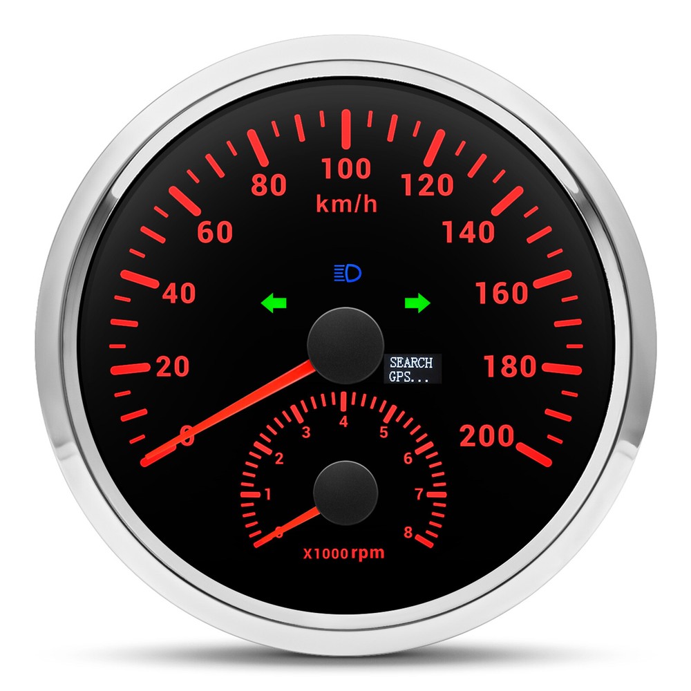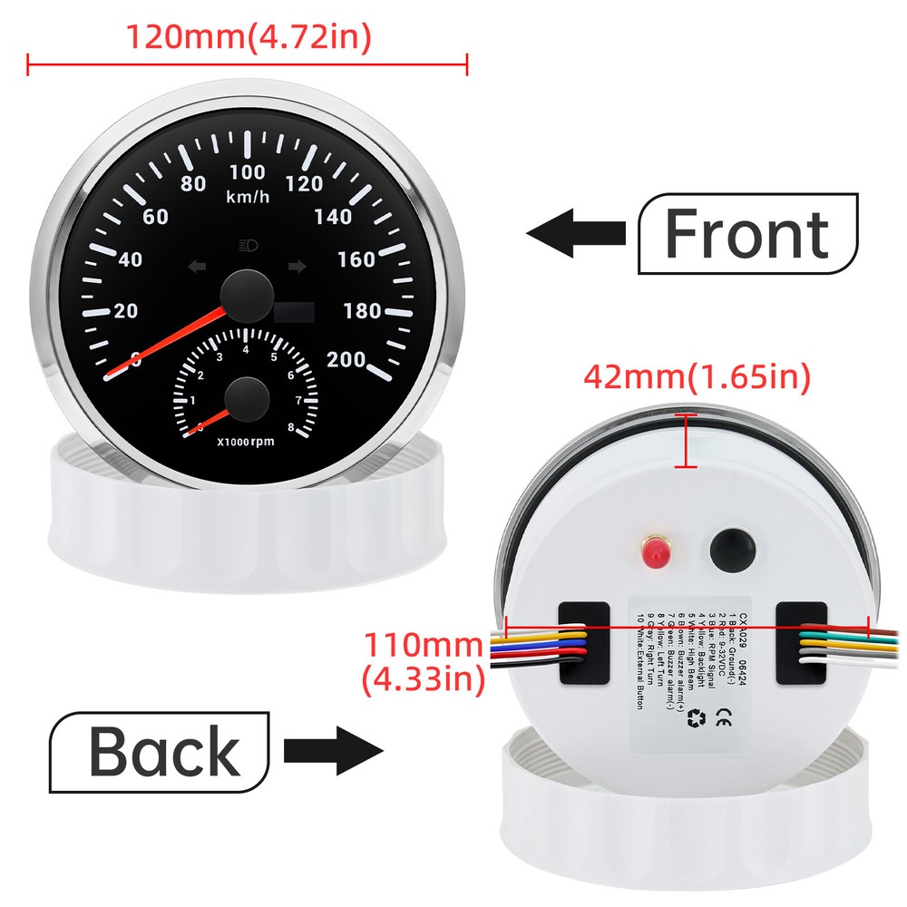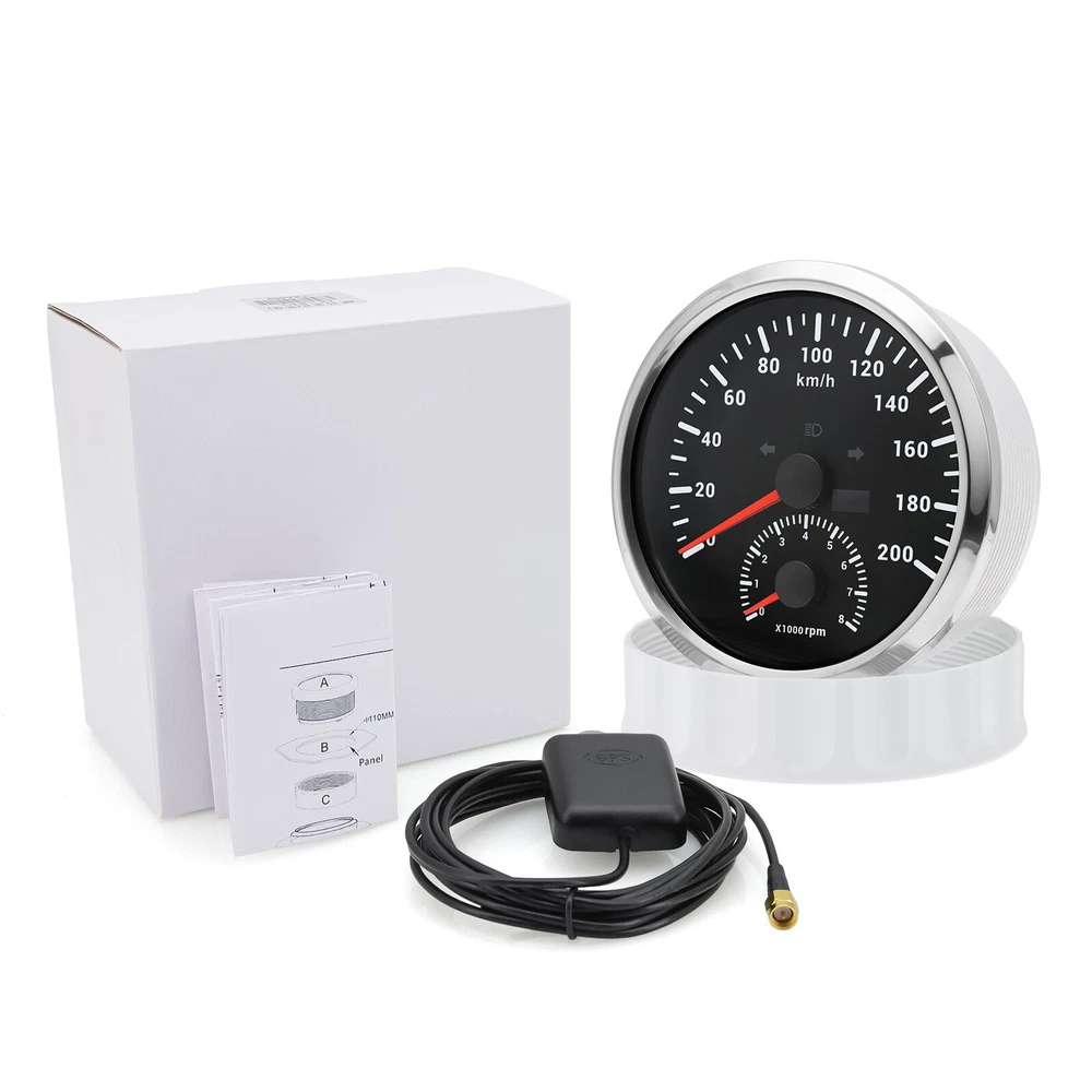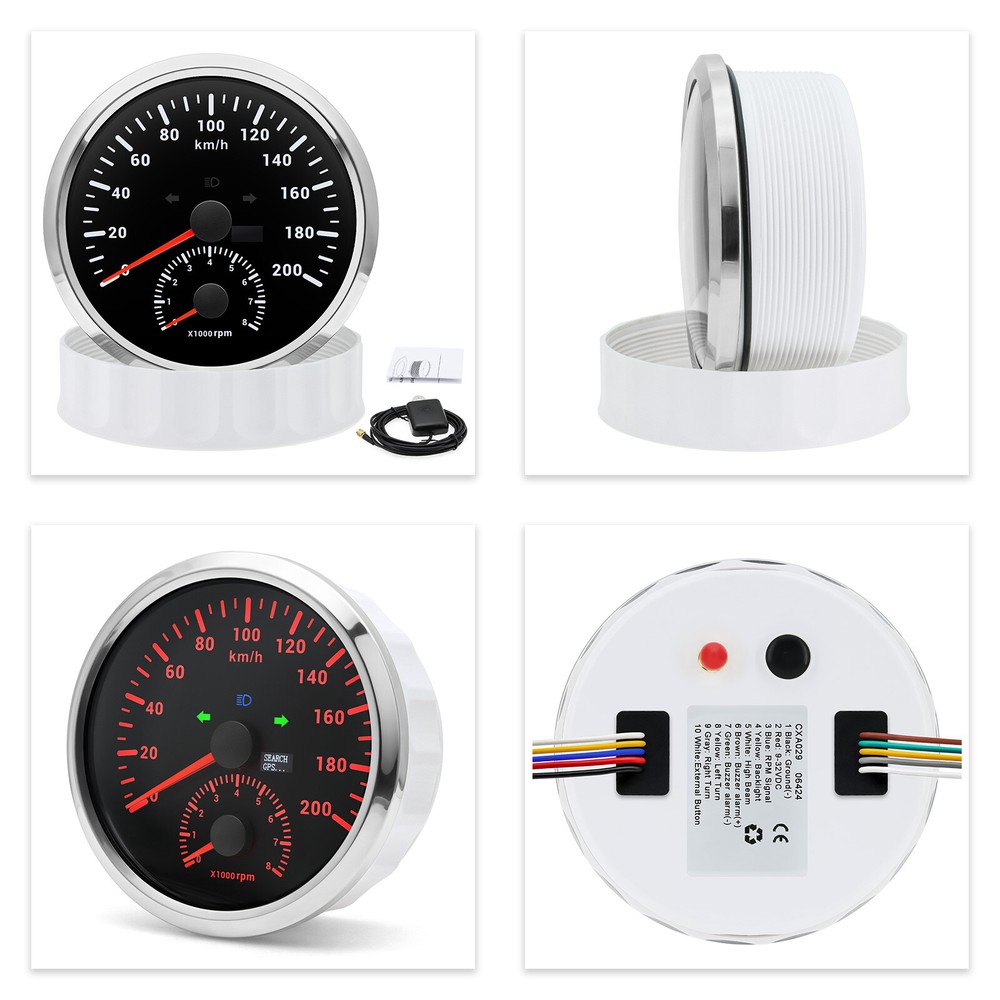 110MM Black GPS Speedometer 200km/h with Tachometer 8000RPM Gauge for Boat Car 110mm GPS Speedometer 0-200km/h with Tacho 0-8000RPM Waterproof for Boat Car Truck Features: Suitable for all vehicles and off-road vehicles The signal comes directly from the satellite signal receiver(GPS Antenna), don't need other speed sensor. The gauge has the advantages of high precision, quick location confirmation and short start up time. IP67 waterproof and dustproof grade Reverse polarity protection and anti-fogging performance Stepper motors used for full range of stepping gauges, great feature with its less power consumption, longer life, higher precision, etc. Specifications: Application:Universal fit for Motorcycle/ Boat/Truck/Bus/Car Electronic Speedometer (stepper motor) No Mechanic Sensor, get speed signal from GPS Speed ≠0 and show accurate speed in tunnel with the help of accelerometer GPS Blind Area Odometer Compensation OverSpeed Buzzer Alarm (Value Adjustable) Indication Light (Left, Right and High Beam Installation Diameter: 110mm (4-3/8") Speed Range:0~200KM/H RPM Range :0~8000RPM Mileage Range:0-99999.9miles Working Voltage:12V/24V Working temperatures:- 40 to 85°C Protection rank: IP67 Waterproof Reverse polarity protection and anti-fogging performance Connection: 1. Black:Ground(-) 2. Red:9-32VDC(+) 3. Blue:RPM Signal 4. Yellow:Backlight(+) 5. White:High Beam(+) 6. Brown:Buzzer alarm(+) 7. Green:Buzzer alarm(-) 8. Yellow:Left Turn(+) 9. Gray:Right Turn(+) 10. White:(no need connect)==(If need to connect, please connect negative) Package Included: 1x GPS speedometer 1x GPS Antenna 1x Multi-plug socket 1x Installation Instruction