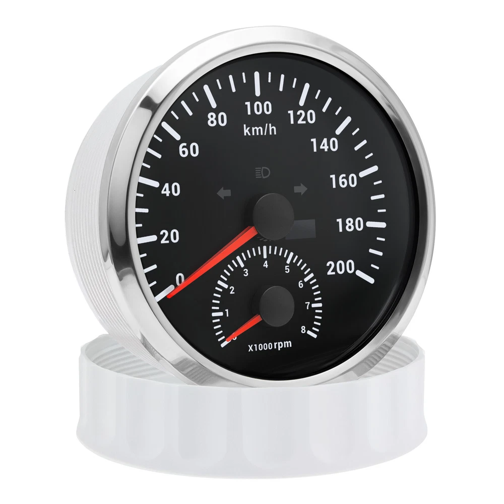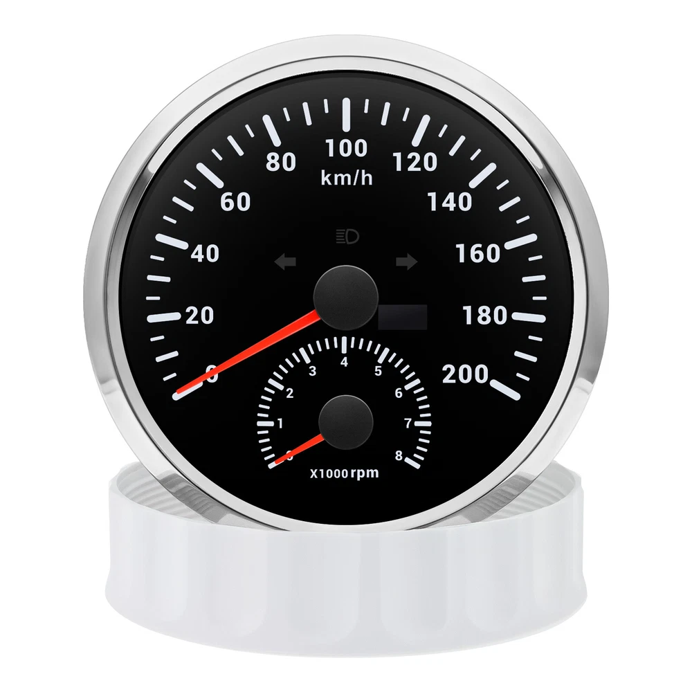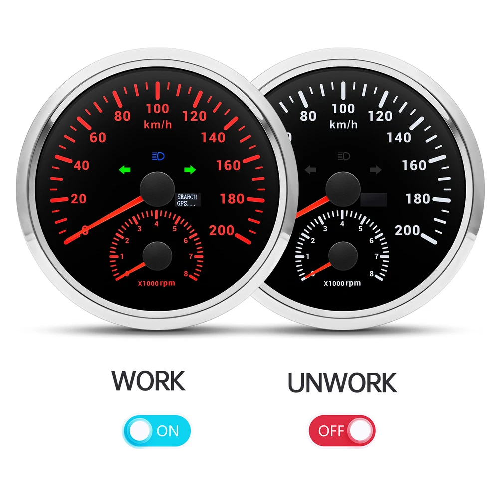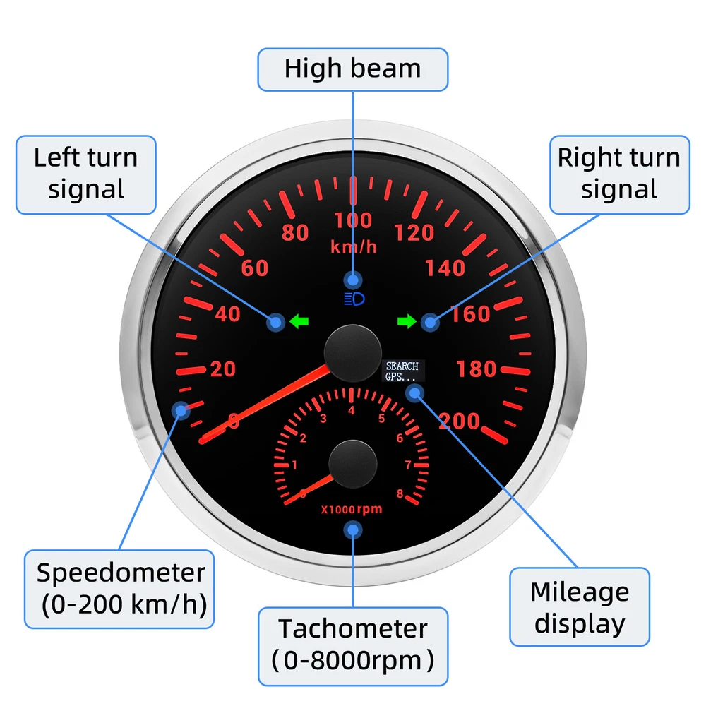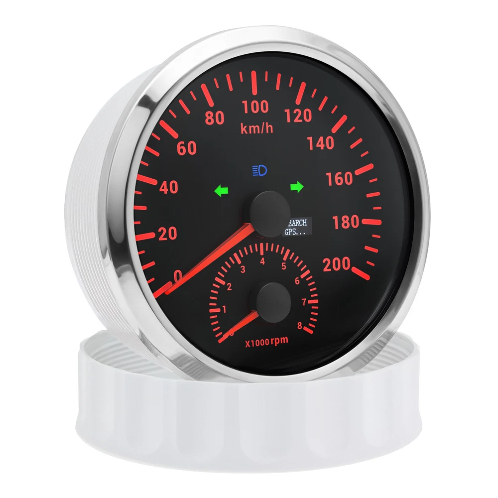 110MM Black GPS Speedometer 200km/h with Tachometer 8000RPM Gauge for Boat Car 110mm GPS Speedometer 0-200km/h with Tacho 0-8000RPM Waterproof for Boat Car Truck Features: Suitable for all vehicles and off-road vehicles The signal comes directly from the satellite signal receiver(GPS Antenna), don't need other speed sensor. The gauge has the advantages of high precision, quick location confirmation and short start up time. IP67 waterproof and dustproof grade Reverse polarity protection and anti-fogging performance Stepper motors used for full range of stepping gauges, great feature with its less power consumption, longer life, higher precision, etc. Specifications: Application:Universal fit for Motorcycle/ Boat/Truck/Bus/Car Electronic Speedometer (stepper motor) No Mechanic Sensor, get speed signal from GPS Speed ≠0 and show accurate speed in tunnel with the help of accelerometer GPS Blind Area Odometer Compensation OverSpeed Buzzer Alarm (Value Adjustable) Indication Light (Left, Right and High Beam Installation Diameter: 110mm (4-3/8") Speed Range:0~200KM/H RPM Range :0~8000RPM Mileage Range:0-99999.9miles Working Voltage:12V/24V Working temperatures:- 40 to 85°C Protection rank: IP67 Waterproof Reverse polarity protection and anti-fogging performance Connection: 1. Black:Ground(-) 2. Red:9-32VDC(+) 3. Blue:RPM Signal 4. Yellow:Backlight(+) 5. White:High Beam(+) 6. Brown:Buzzer alarm(+) 7. Green:Buzzer alarm(-) 8. Yellow:Left Turn(+) 9. Gray:Right Turn(+) 10. White:(no need connect)==(If need to connect, please connect negative) Package Included: 1x GPS speedometer 1x GPS Antenna 1x Multi-plug socket 1x Installation Instruction