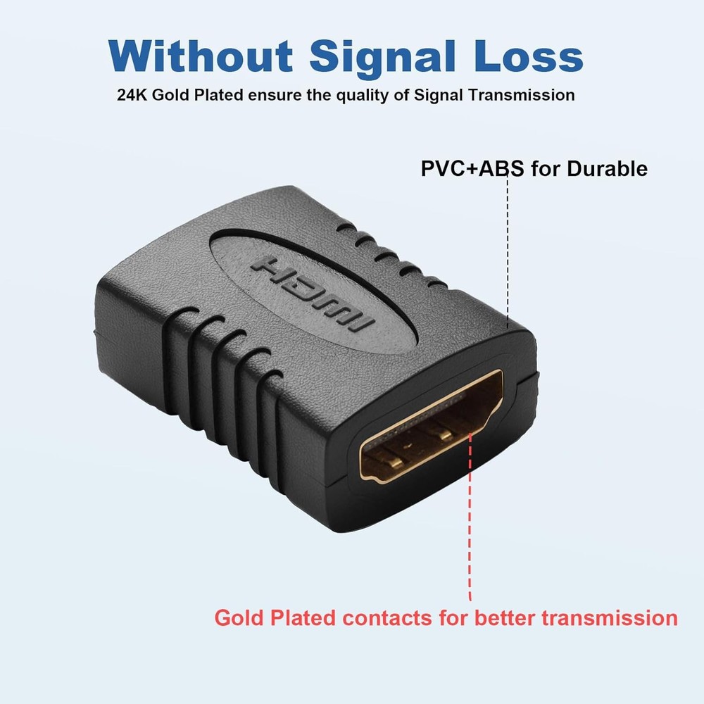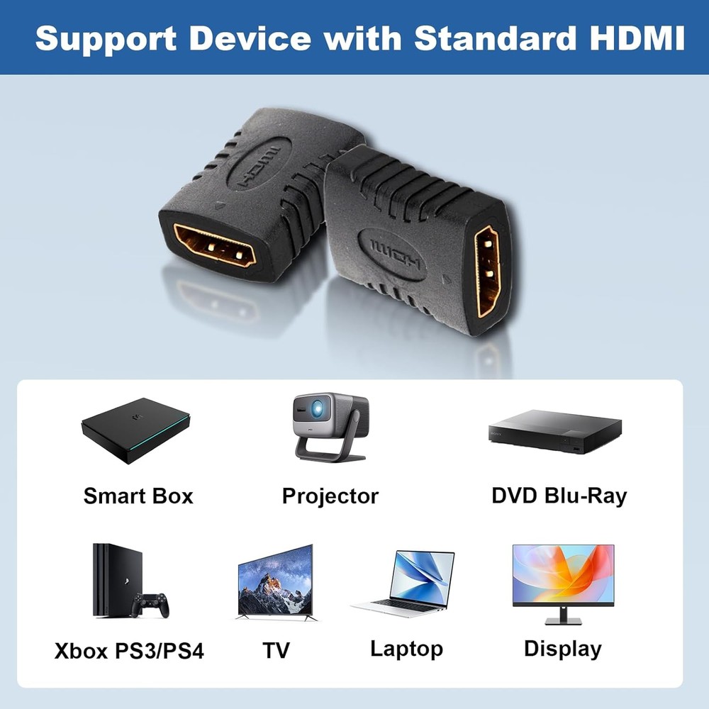 产品展示系统 - 增强版图片切换 1-10PCS HDMI 4k Female to Female Coupler Extender Adapter Cable Connector HDMI converter extension easily connects 2 regular HDMI cables into 1 HDMI cable for long-distance extension purpose and turn HDMI male port to female port for connecting other devices. A high-quality HDMI to HDMI coupler provides the interface needed to connect two HDMI cables, while still maintaining the highest level of signal quality. Compatible with HDMI interface device: HDTV, PS5, PS4, PS3, XBOX Series X/S, TV Box, HD-DVD recorder, Blu-ray, Set-Top Box, monitor, projector, etc. Features: Color: Black Connector A: HDMI 2.0 Standard Female Connector B: HDMI 2.0 Standard Female Dimensions: 3cm x 2cm x 1.1cm (1.1 x 0.8 x 0.4 inches) Supports the following resolutions: 4K, 1080p, 1080i, 720i, 720p, etc. PVC Outer Jacket,wear-resistant Gold-plated terminals ensure long-lasting, corrosion-free connections Package Included:(As Your Choice) 1-10PCS HDMI Female To Female Extender Adapter Coupler Connector