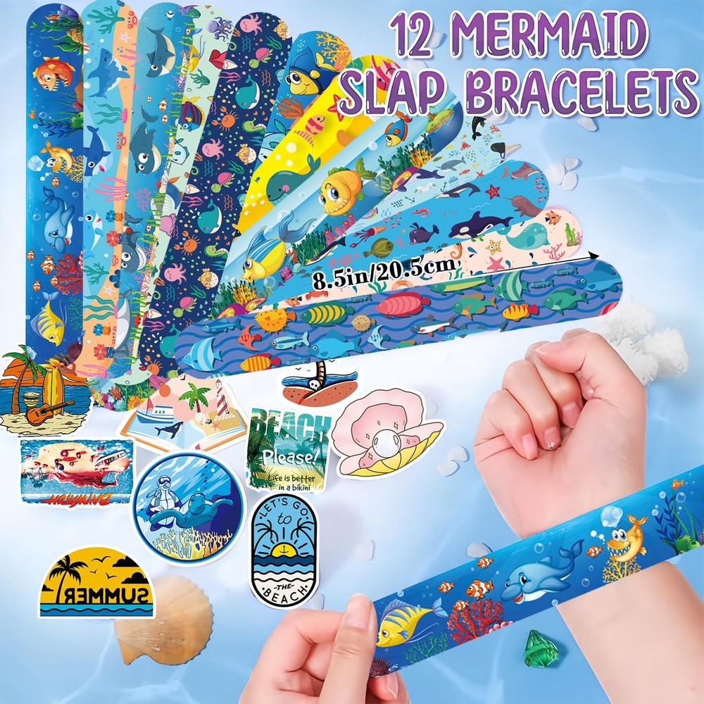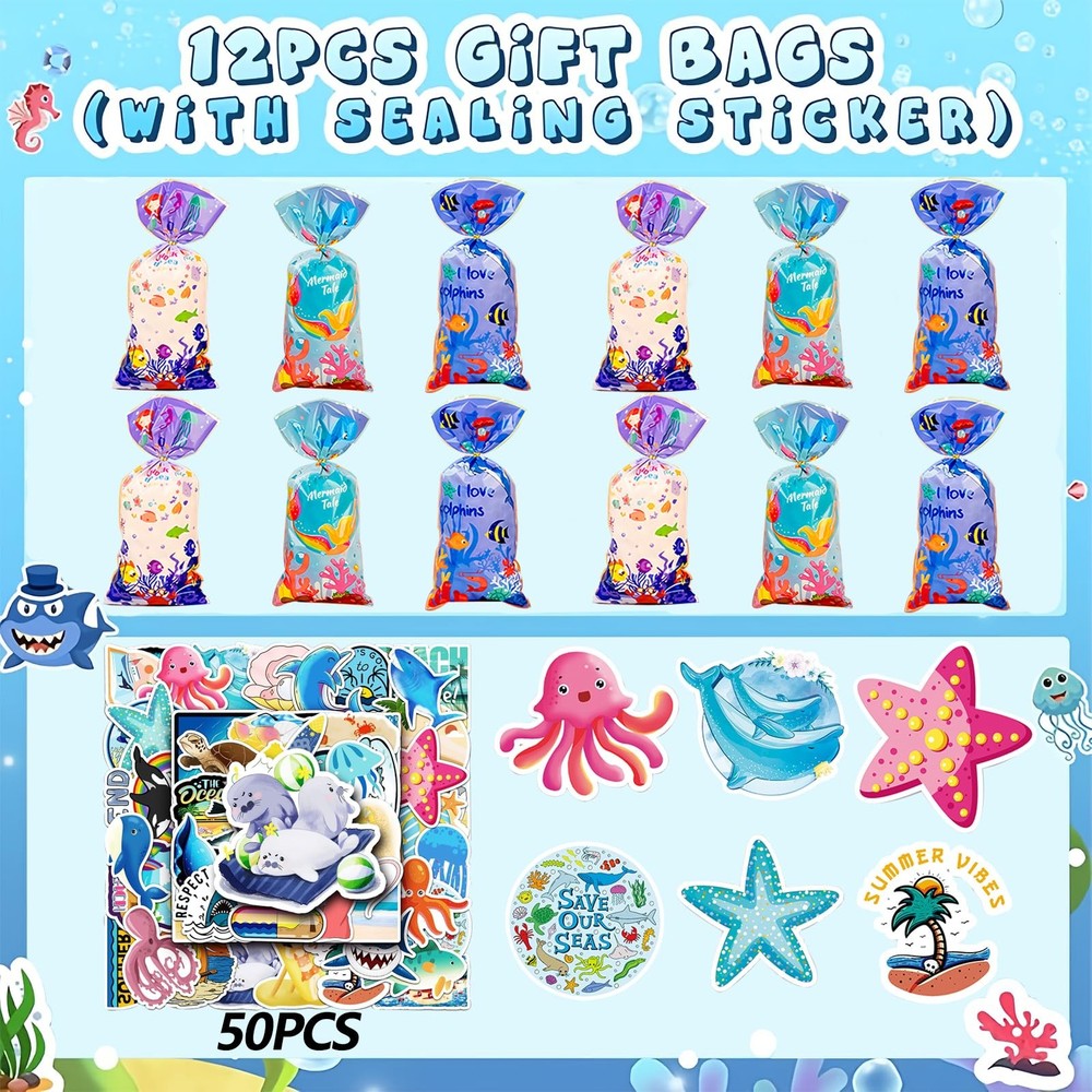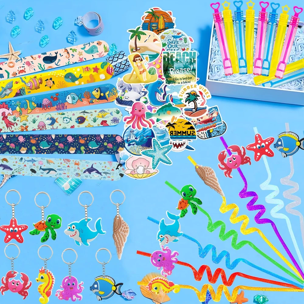 Under the Sea Party Favors Ocean Sea Party Favors 【MOST POPULAR SEA ANIMAL PARTY FAVORS 】Everyone desires the magical world of the ocean. This ocean themed birthday party supplies are enough to immerse your guests in an unforgettable experience, and can definitely become part wonderful memories for you! 【PERFECT SEA ANIMAL PARTY GIFT】There's something in here for everyone, Include 12 sea animal slap bracelets, 12 sea animal glitter drinking straws, 12 cute sea animal keychains, 50 sea animal stickers, 12 under the sea themed gift bags, 12 bubble sticks. Make your sea animal party the best one! 【SUITABLE FOR ALL OCCASIONS 】They are perfect for ocean themed goodie bag favors, party bag fillers, Easter egg fillers, treasure hunting prize, school prize, and giveaways. 【PREMIUM QUALITY MATERIAL】Under the sea birthday party decorations supplies for sea animal lovers! All toys in the gift bag are made of non-toxic materials and totally safe. Cute shapes and bright colors are so attractive that will be impressed and want more. 【UNDER THE SEA ANIMAL THEMED SET】 Is a good party gift for you to have fun, but also to liven up and entertain your party. Make you full of sea animal charm and make our Sea Animal Return Party 110 Piece Set your choice!
