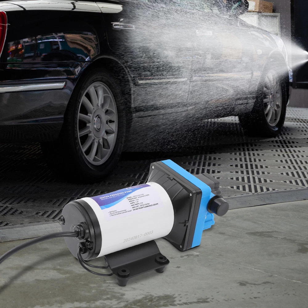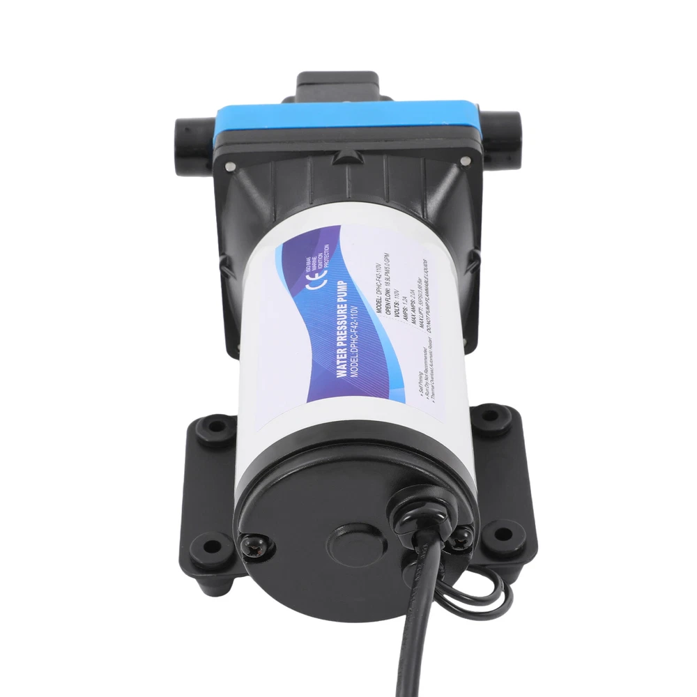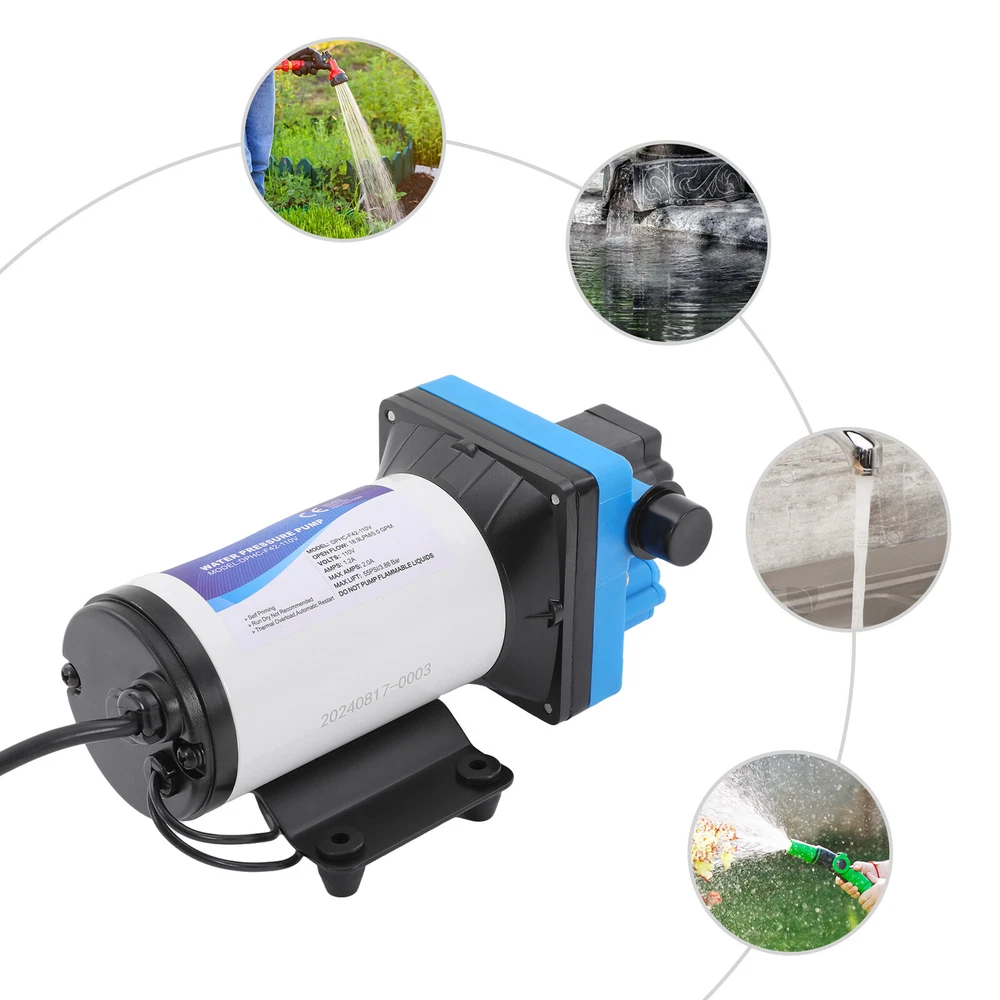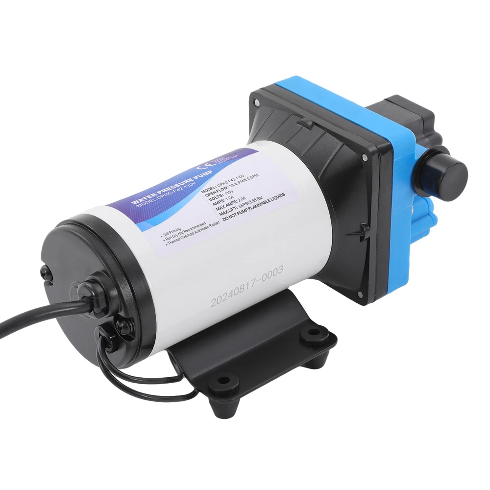 Specifications Color: Black, White, and Blue Material: Engineering Plastic, Copper, and Steel Motor: Pure Copper Motor Power Source: Corded Plug Type: US Standard Assembly Required: Yes Control Type: Pressure Switch Max. Temperature: 65°C/149°F Voltage: 110V Amps: 1.2A Max. Amps: 2.0A Noise: 55-60dB Suction Range: 3m/9.84ft Max Lift: 55PSI/3.88Bar Open Flow: 18.9LPM/5.0GPM Hose Adapter: 1/2" Gross Weight: 3.06kg/6.75lbs Net Weight: 2.8kg/6.17lbs Package Size: 32*15*13.5cm/12.6*5.91*5.31in Product Size: 12.45*10.97*21.2cm/4.9*4.32*8.35in Package Included 1* Diaphragm Water Pump 1* Filter 2* Hose Adapters 110V Water Pump 1.2A Diaphragm Water Pump Self Priming Automatic Diaphragm Pump Description Our water diaphragm pressure pump has excellent suction and head capacities and can easily cope with most liquid transfer tasks, guaranteeing a continuous and stable performance that defies many challenges. Whether for vehicle cleaning, food and beverage processing and handling equipment, home water supply and pipeline pressurization, or water use in the use of RVs, ships, etc, this high-performance pump is the ideal choice for the most demanding applications. Key Features Build to Last: The high-quality engineering plastic housing is wear-resistant, impact-resistant, and not easy to deform, which can better protect the internal components and extend the product's service life. High Efficiency: It features a pure copper motor, a self-priming range of 9.84ft, an open flow of up to 18.9LPM/5.0GPM, and a 55PSI/3.88 bar pressure that can accommodate 3-4 faucet water supplies, making your pumping faster and easier. Safety Guard: It has overheating protection, overload protection, grounding protection, automatic start/stop, and switch reflux function which guarantees the stability of the product's operation and at the same time ensures safety when using it. Thoughtful Design: It has the function of self-priming water, when there is water in the tank can be automatically pumped, and can be turned off without water, for you to save water. Economical and Practical: With it , you'll be able to extract water better, which can be extremely convenient and cost-effective for you. Ideal Gift: Thanks to its practicality and powerful functions, you can give it to your friends as a Christmas, Thanksgiving or Halloween gift! Simple Installation: With complete accessories, standard interfaces, and simple construction, you can put it together yourself and put it to use right away! Customer Service: We aim to provide quality products and services. If you have any problems, please feel free to contact us. We will reply and solve the problem for you as soon as possible. Details Stable Base: The rubber base can better maintain the stability of the product and ensure smooth and quiet operation. Standard Port: The 1/2'' standard hose adapters can match most water pipes for convenient installation and use. Practical Filter: It effectively filters out impurities from the liquid, which can better protect the pump for extended service life. Application It can be used for vehicle cleaning, ships, carpet/ground cleaning, water purification, and water treatment equipment; providing water for eating, washing, bathing, toilets, and flushing in the use of RVs, ships, yachts, boats, etc.; food and beverage processing and handling equipment; home water supply and pipeline pressurization, solar energy pressurization system supporting, water purification industry, and other equipment that require a liquid transfer, spraying, and even metering such as garbage trucks, sprinklers, carpet/floor/vehicle cleaning equipment, road construction equipment, dishwashers, chemical equipment, water circulation cooling systems, and pressurization systems. Pressure Switch Adjustment 1. Open the pressure switch cover. 2. Locate the hexagonal screw hole in the center of the switch's interior. 3. Tighten clockwise to increase pressure, loosen counterclockwise to decrease pressure! Operation Guide 1. Connect the pump with the inlet and outlet pipes, must ensure that the inlet and outlet pipes are tightly connected, otherwise, it will cause low pressure, poor sucking water, water leakage, and other problems; (Tip: the pump head is labeled with an arrow instruction, the arrow points in the direction of the outlet, and vice versa for the inlet). 2. Install the filter at the water inlet side; the density of the filter mesh is best in more than 80 mesh (i.e., 80 small holes/1cm²). 3. Connect the electric diaphragm pump with the power supply, the output parameters of the connected power supply must meet the input requirements of the motor. 4. Turn on the power, the pump starts to run. 5. Discharge water for 5-10 seconds, and drain the air in the pump and the pipeline, when the water is stable, temporarily turn off the power supply, and connect the water gun, faucet, shower, and other related tools. 6. Stop using, just close the outlet faucet, the pump has a pressure switch automatic start-stop function, the next use just open the faucet and it can work normally. Troubleshooting 1. When there is electricity, the pump does not work: open the pressure switch cover above the pump head, connect the two connecting wires together, and rule out whether the motor short circuit is caused by switch damage. 2. The water pump works normally, with insufficient suction, small water output, and low pressure: need to dismantle the pump head, check whether there is debris blockage in the pump cavity, whether the pump head and the motor bracket are loose, if it is, clean up the valve and the diaphragm debris, tighten the screws, and then install it. 3. The pump does not work when you just received it: Open the back cover of the motor, remove the springs of the two carbon brushes, and install them. 4. The water pump does not work after one use: any water pump has a starting current, which is usually 3-5 times the working current, please make sure that the battery and the power sup