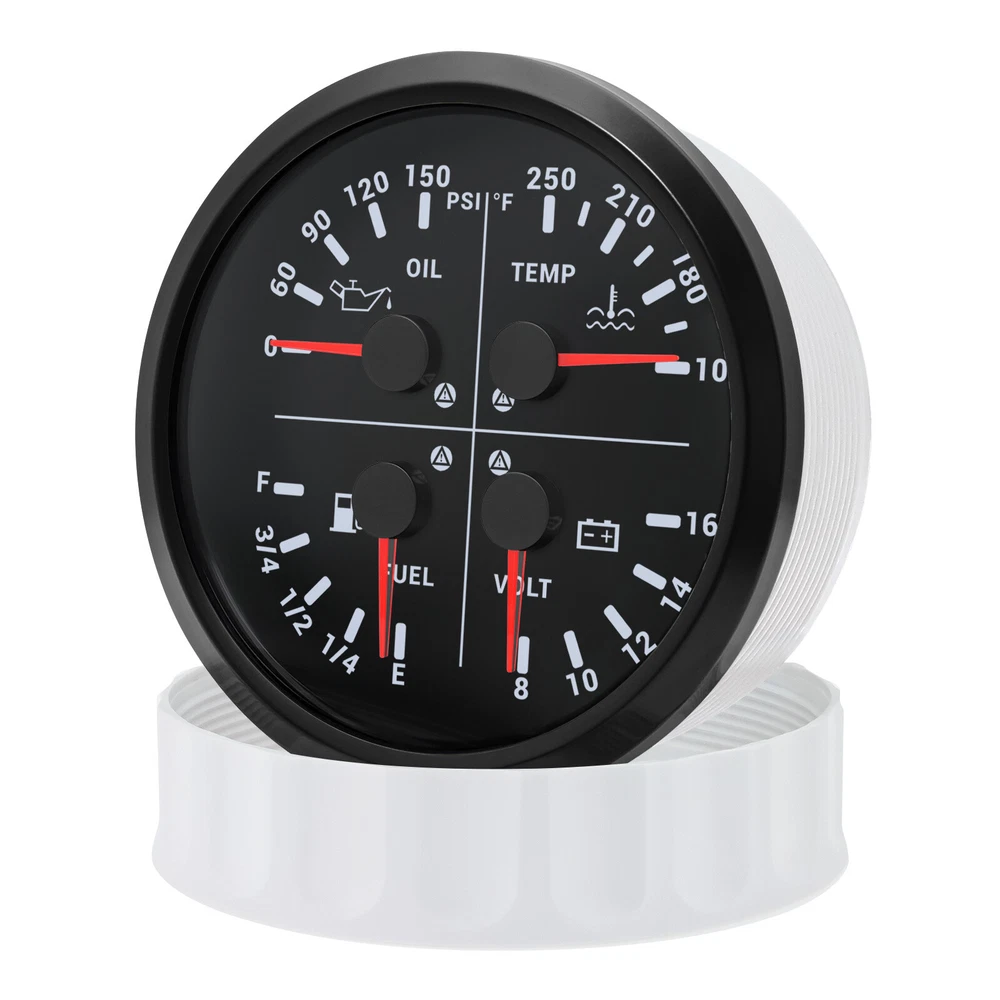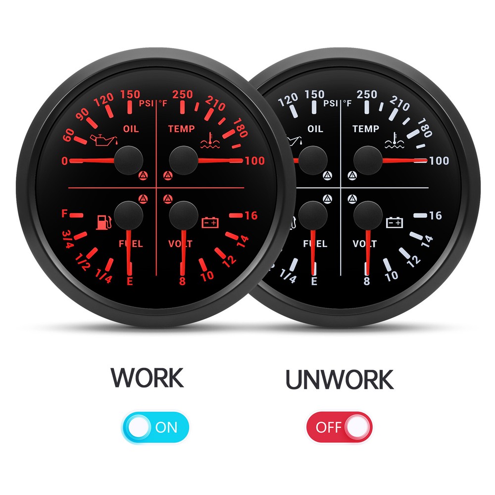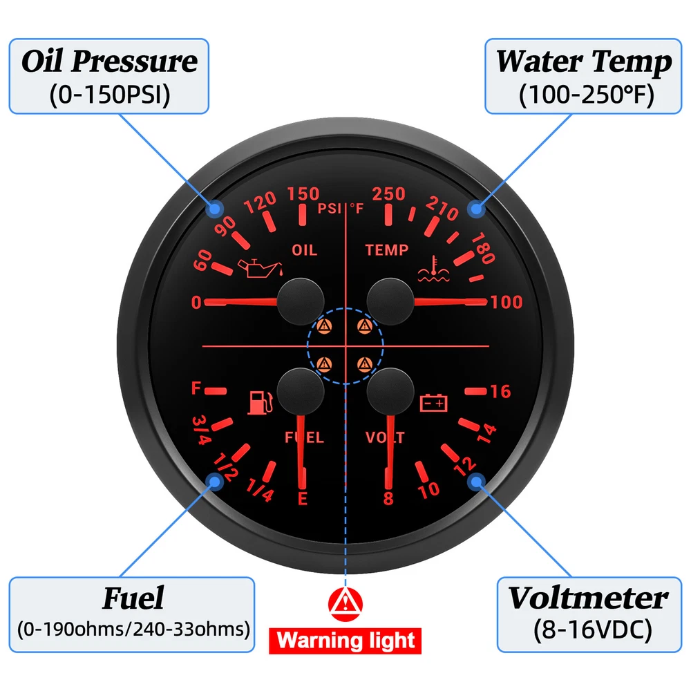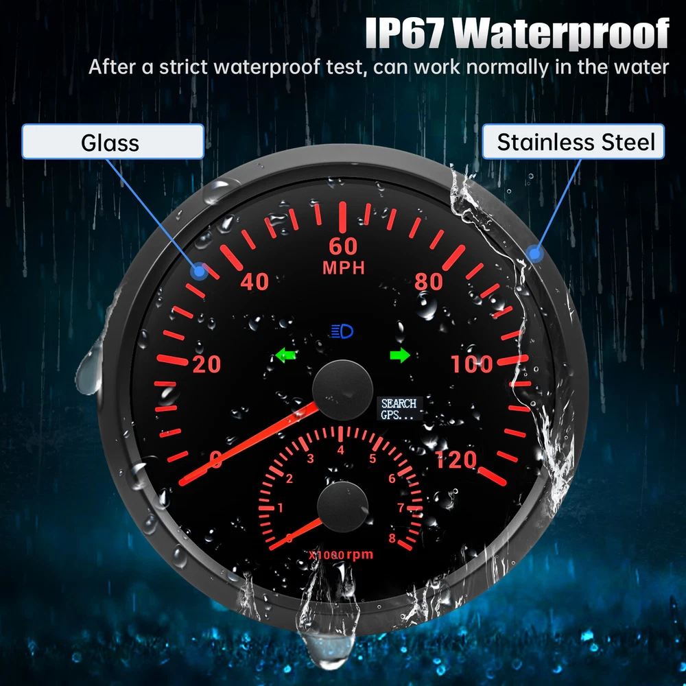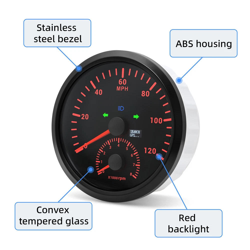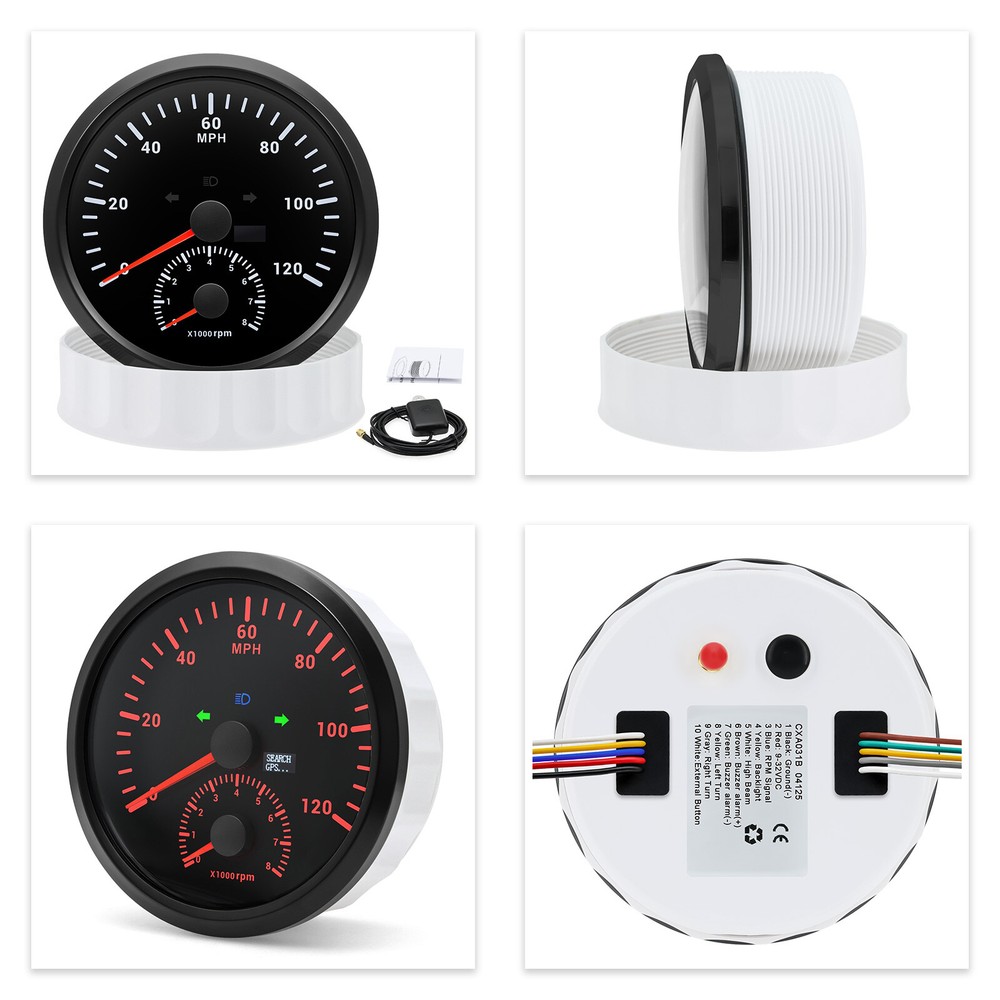 110mm GPS Speedometer 0-120MPH with Tachometer 8000RPM 4IN 1 Gauge For Car Boat 2 Gauge Set 110mm GPS Speedometer 0-120MPH Tachometer 0-8000RPM & 110mm 4 in 1 Multifunctional Gauge For Boat Features: Suitable for all vehicles and off-road vehicles Analog Display Speedometer & Tachometer & Digital Display Odometer. Speedometer with Turn Signal & High Beam Function. High Quality Stepper Motor Movement. Convex Clear Lens, 316 Stainless Steel Bezel & ABS Plastic Housing. Black Gauge Faceplate, Red Needle. RED LED Illumination. IP67 Waterproof, Rustproof, Anti-Fog & UV-Resistant. Tachometer Fits Both Gas & Diesel Powered Engine. 4 In 1 Multi-Function Gauge with Warning Function. 2 IN 1 Multi-Function Gauge Requires 12 / 24 Volt Negative Ground Systems. 4 IN 1 Multi-Function Gauge Requires 12 Volt Negative Ground Systems. Most importantly, the gauge is easy to setup, and can be used in all vehicles, boats and off-road vehicles. GPS Speedometer Specifications: Application: Universal fit for Motorcycle/ Boat/Truck/Bus/Car Electronic Speedometer (stepper motor) No Mechanic Sensor, get speed signal from GPS Speed ≠0 and show accurate speed in tunnel with the help of accelerometer GPS Blind Area Odometer Compensation OverSpeed Buzzer Alarm (Value Adjustable) Indication Light (Left, Right and High Beam) Installation Diameter: 110mm (4 3/8") Speed Range: 0~120MPH RPM Range: 0~8000RPM Mileage Range: 0-99999.9 miles Working Voltage: 8-16V Power consumption:<120MA Working temperatures: - 20 to 70°C Storage temperatures: -30 to 80℃ Protection rank: IP67 Waterproof Reverse polarity protection and anti-fogging performance 4 In 1 Multi-Function Gauge Fixing dimension: 110mm (4-3/8") Indicating Range: Oil press. meter: 0-150Psi Water temp. meter: 100-250℉ Fuel level meter: 0-100%, empty-full; 0-190ohms/240-33ohms, The signal can be adjusted Voltmeter: 8-16V Working Voltage: 12V Input Signal: 10-184ohms for 0-150Psi oil pressure meter; 0-100% for fuel level meter;(Default 0-190ohms, can adjust to 240-33ohms) 8-16V voltage meter; Input Signal 301-22ohms for water temperature meter Red backlight Protection grade is IP67, the whole body is completely waterproof; Excellent antifogging function; 316 Stainless steel bezel with curved glass; Convenient Installation by multi-plug socket connecting way; Accessories: matched with connectors, Installation Instruction Alarm Value: 1. Fuel<13% Alarm 2. Oil pressure <0.8Bar Alarm 3. Water temp.<95℃ Alarm 4. Voltage<11.5V Alarm Package Included: 1 x 110mm 4 in 1 Multifunctional Gauge 1 x 110mm GPS Speedometer Gauge 1 x GPS Antenna 2 x Cable 2 x Installation Instruction