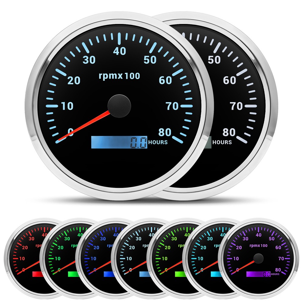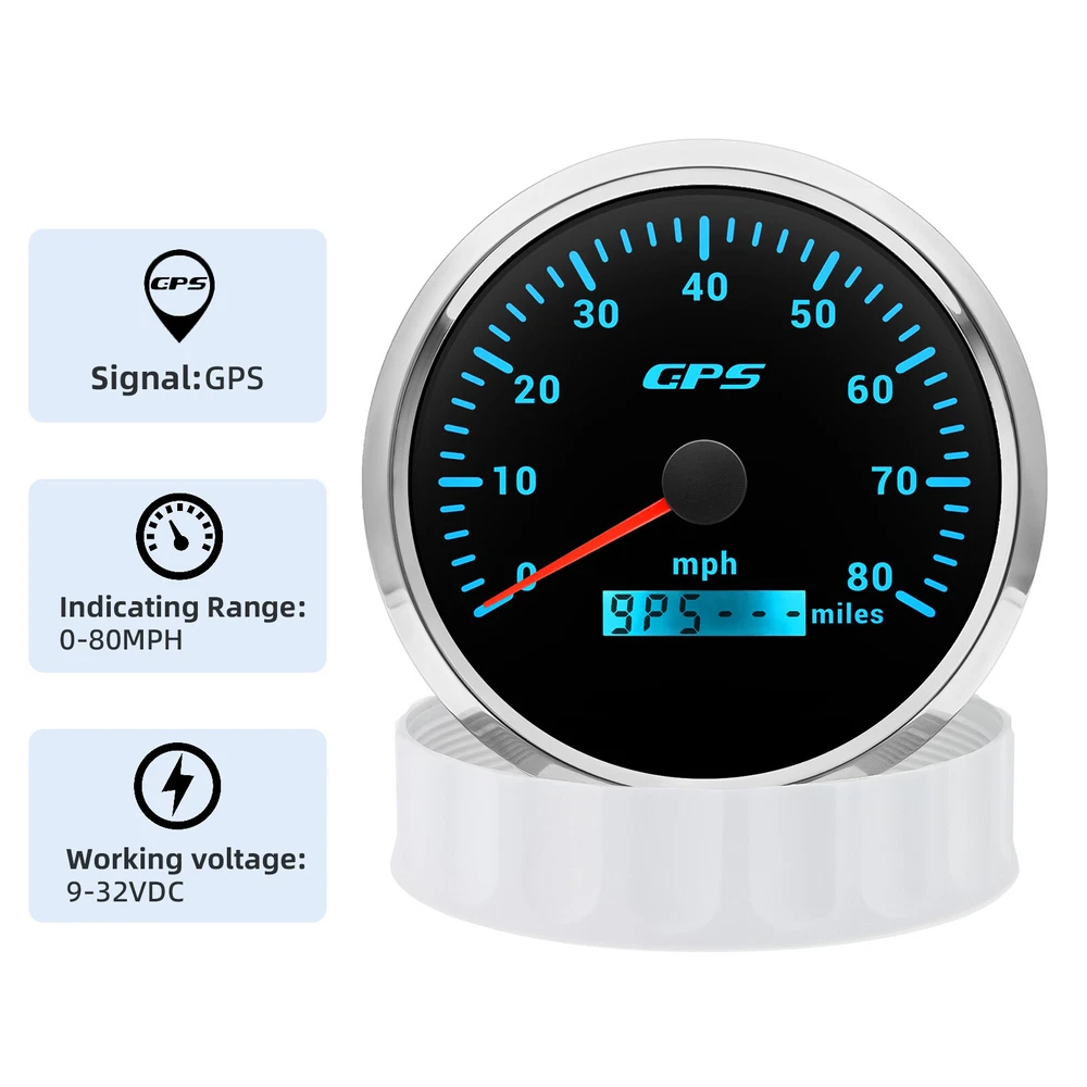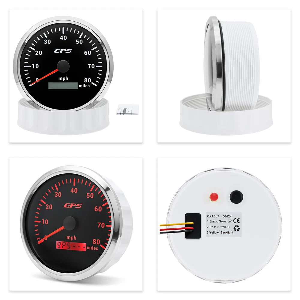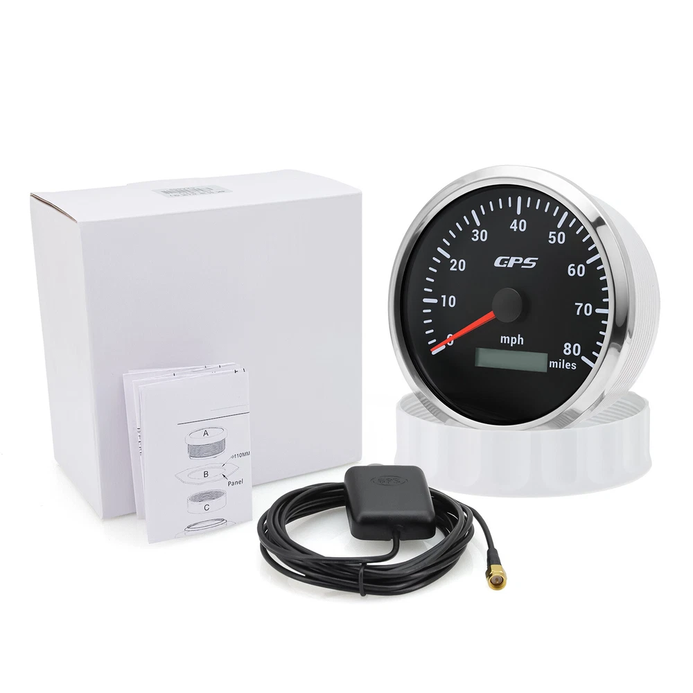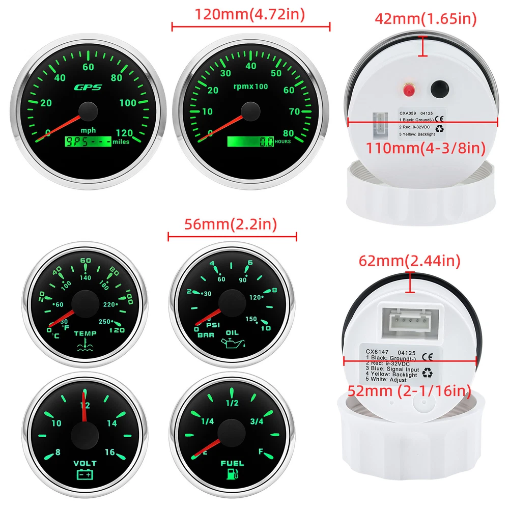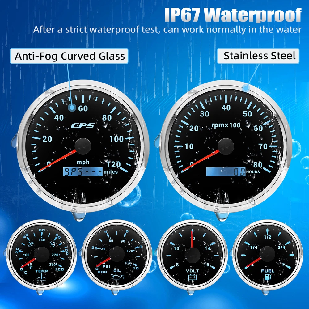 110mm GPS Speedometer 0-120MPH Tacho 8000RPM&52mm Fuel/Temp/Oil/Volt Gauge Set 6 Gauge Set 110mm Boat GPS Speedometer 0-80MPH Tachometer 0-6000RPM & 52mm Gauge Waterproof Feature: High-brightness LED backlight. 316 stainless steel for long-term use even in acid-base,humid environment. IP67 waterproof and dust-proof grade. With curved glass( with anti-fog function). Suitable for all kinds of vehicle modification. Using stepper motor drive pointer, accurate display of the engine speed, and with the LCD display clear display mileage. Gauges have many kinds backlight color (red,yellow,orange,green,blue,purple,white),customers can adjust any color that you like. GPS Speedometer Gauge Install Diameter: 110mm (4-3/8") Signal:GPS Working Voltage: 9~32V DC Indication Range: 0-120MPH Backlight:7 Colors Backlight Tachometer Install Diameter:110mm (4-3/8") Engine hours: 0.0-99999.9H Backlight :7 Color backlight Indicating Range:0~8000 RPM Signal: Pulse Fuel Level Gauge Sizes: 52 mm (2-1/16") Measuring Range:Empty-Full Resistance:240 (E)-33 (F)ohms Backlight: 7 Colors Backlight Water Temperature Gauge Install diameter:Φ52mm Indication range:0~120℃/30-250℉ Input signal:287.4~22.4 ohms Storage temperature:-40~+85℃ Backlight:7 Colors Backlight Oil Pressure Gauge Install diameter:Φ52mm or 2-1/16" Indication range:0~10bar / 0-150 PSI Input signal: 10-184 ohms Operating temperature:-30~+75℃ Storage temperature:-40~+85℃ Backlight: 7 Colors Backlight Volt Gauge Sizes: 52 mm (2-1/16") Measuring Range: 8-16 (V) Backlight: 7 Colors Backlight Package Includes: 1X 110MM Digital GPS Speedometer Gauge 1X GPS Antenna 1X 110MM Tachometer 1X 52MM Fuel Level gauge 1X 52MM Voltmeter 1X 52MM Water temp gauge 1X 52MM Oil Pressure gauge 6X Installation Instruction Sensors will be included