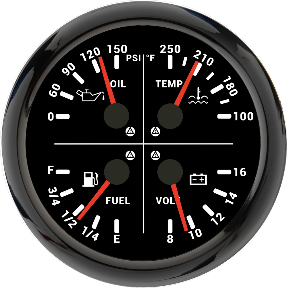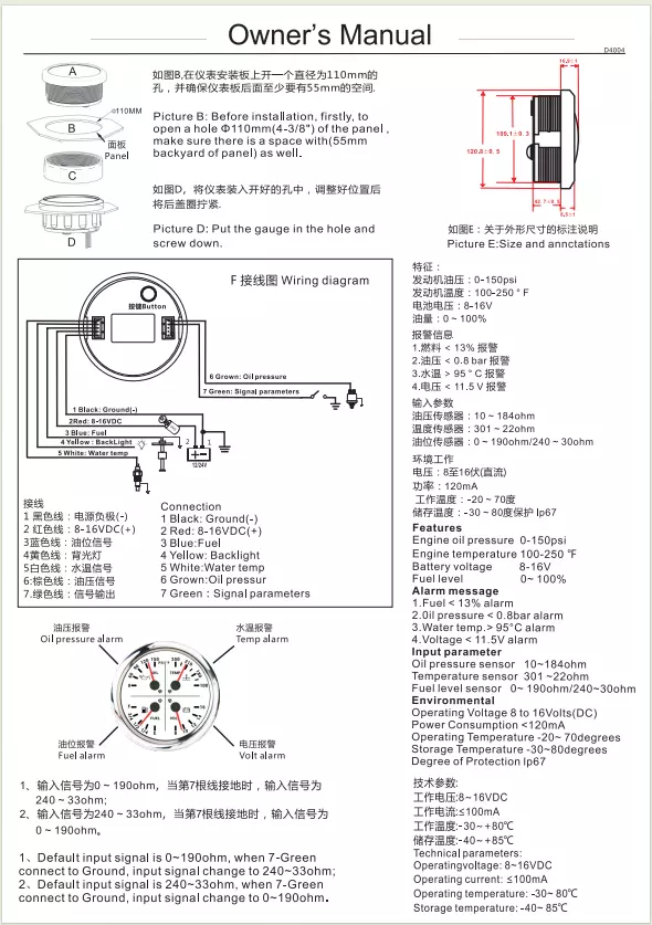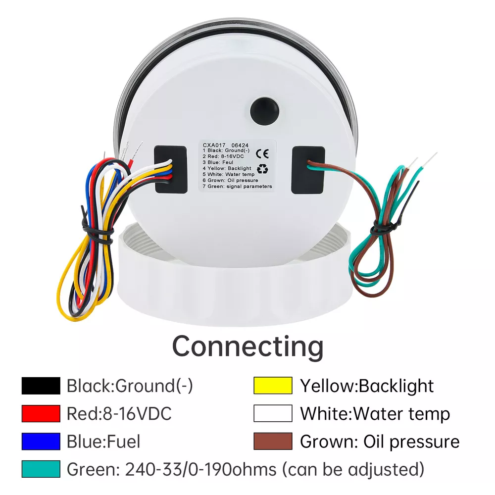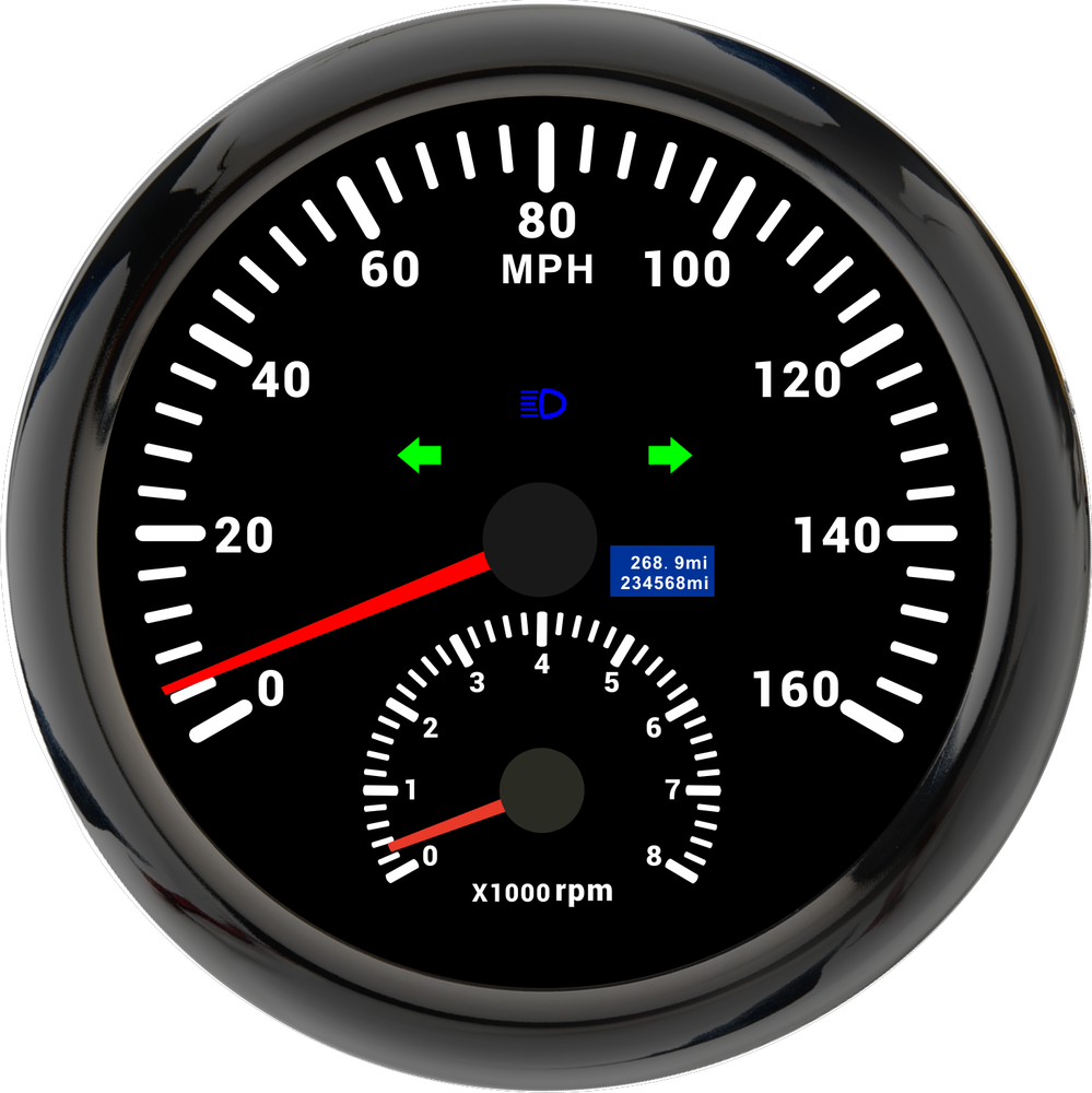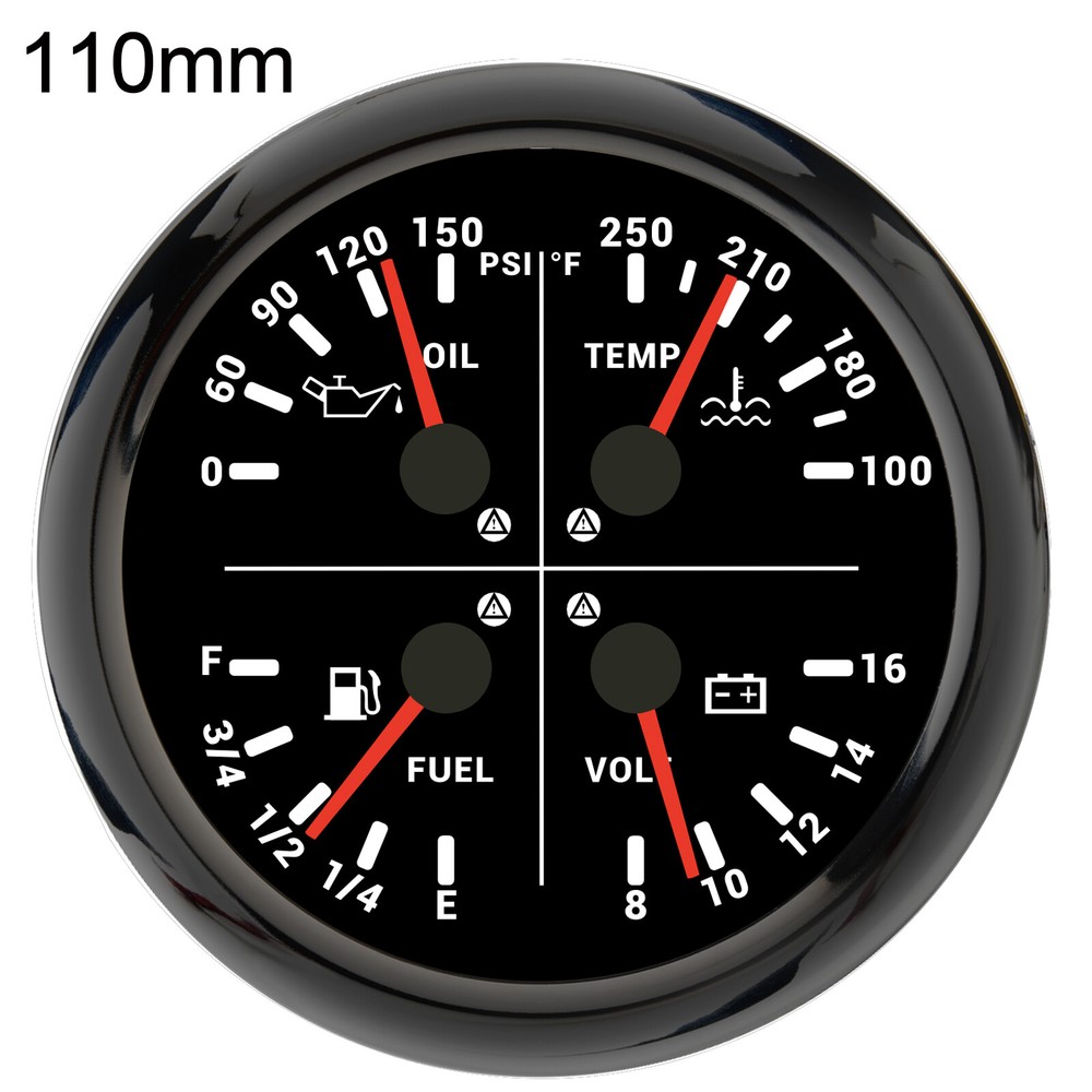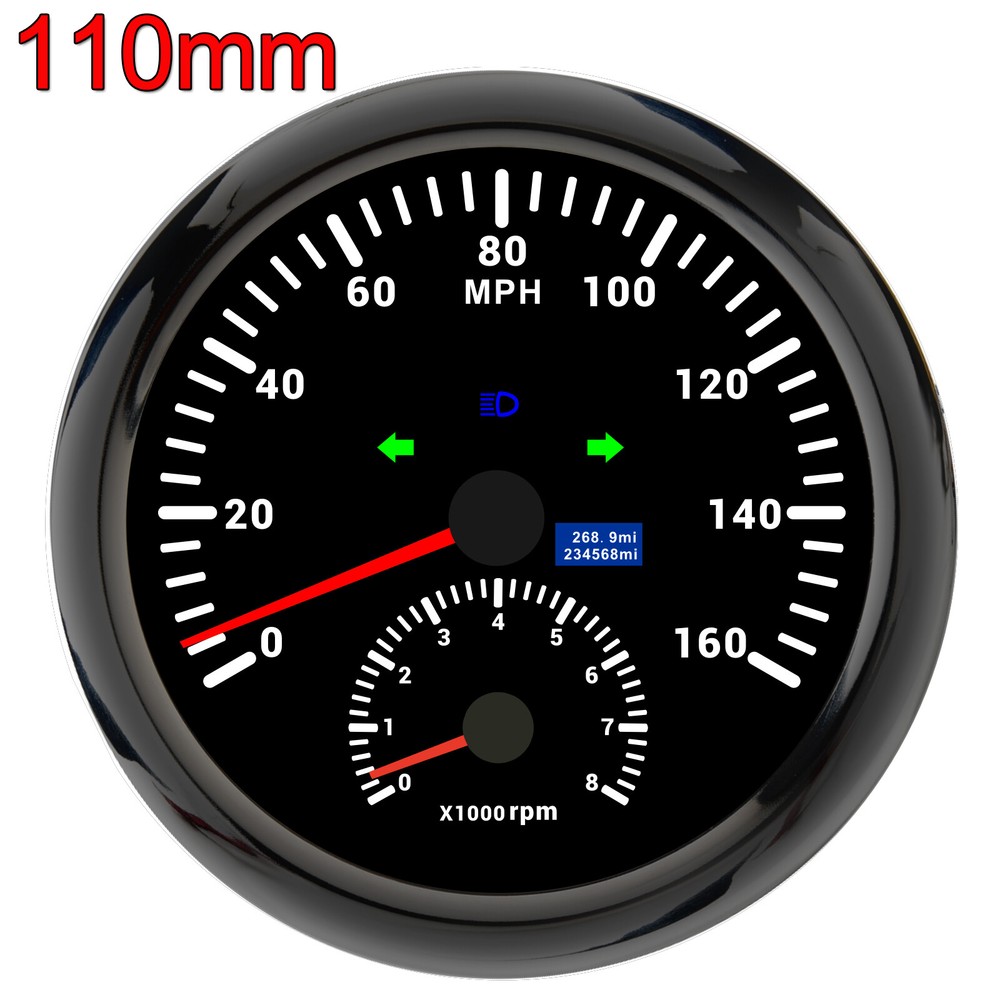 110mm GPS Speedometer 0-160MPH with Tacho & 110mm 4 IN 1 Gauge Set With Senders 2 Gauge Set 110mm GPS Speedometer 160MPH with Tacho & 4 IN 1 Gauge With Senders Features: Suitable for all vehicles and off-road vehicles Analog Display Speedometer & Tachometer & Digital Display Odometer. Speedometer with Turn Signal & High Beam Function. High Quality Stepper Motor Movement. Convex Clear Lens, 316 Stainless Steel Bezel & ABS Plastic Housing. Black Gauge Faceplate, Red Needle. RED LED Illumination. IP67 Waterproof, Rustproof, Anti-Fog & UV-Resistant. Tachometer Fits Both Gas & Diesel Powered Engine. 4 In 1 Multi-Function Gauge with Warning Function. 2 IN 1 Multi-Function Gauge Requires 12 / 24 Volt Negative Ground Systems. 4 IN 1 Multi-Function Gauge Requires 12 Volt Negative Ground Systems. Most importantly, the gauge is easy to setup, and can be used in all vehicles, boats and off-road vehicles. GPS Speedometer Specifications: Application: Universal fit for Motorcycle/ Boat/Truck/Bus/Car Electronic Speedometer (stepper motor) No Mechanic Sensor, get speed signal from GPS Speed ≠0 and show accurate speed in tunnel with the help of accelerometer GPS Blind Area Odometer Compensation OverSpeed Buzzer Alarm (Value Adjustable) Indication Light (Left, Right and High Beam) Installation Diameter: 110mm (4 3/8") Speed Range: 0~160MPH RPM Range: 0~8000RPM Mileage Range: 0-99999.9 miles Working Voltage: 8-16V Power consumption:<120MA Working temperatures: - 20 to 70°C Storage temperatures: -30 to 80℃ Protection rank: IP67 Waterproof Reverse polarity protection and anti-fogging performance 4 In 1 Multi-Function Gauge Fixing dimension: 110mm (4-3/8") Indicating Range: Oil press. meter: 0-150Psi Water temp. meter: 100-250℉ Fuel level meter: 0-100%, empty-full; 0-190ohms/240-33ohms, The signal can be adjusted Voltmeter: 8-16V Working Voltage: 12V Input Signal: 10-184ohms for 0-150Psi oil pressure meter; 0-100% for fuel level meter;(Default 0-190ohms, can adjust to 240-33ohms) 8-16V voltage meter; Input Signal 301-22ohms for water temperature meter Red backlight Protection grade is IP67, the whole body is completely waterproof; Excellent antifogging function; 316 Stainless steel bezel with curved glass; Convenient Installation by multi-plug socket connecting way; Accessories: matched with connectors, Installation Instruction Alarm Value: 1. Fuel<13% Alarm 2. Oil pressure <0.8Bar Alarm 3. Water temp.<95℃ Alarm 4. Voltage<11.5V Alarm Package Included: 1 x 110mm 4 in 1 Multifunctional Gauge 1 x 110mm GPS Speedometer Gauge 1 x Fuel level sensor 240-33ohms 1 x 1/8NPT Water Temp Sensor 1 x 1/8NPT Oil pressure sensor 1 x GPS Antenna 2 x Cable 2 x Installation Instruction