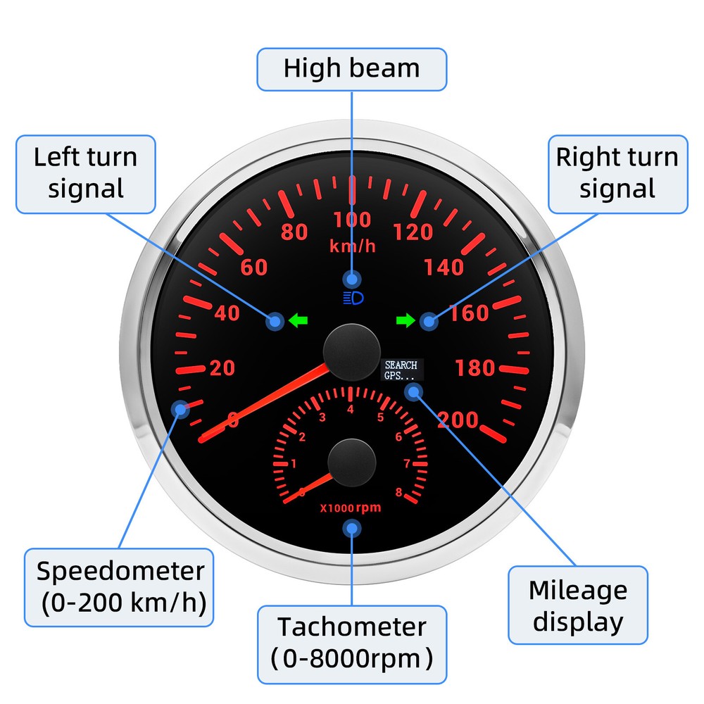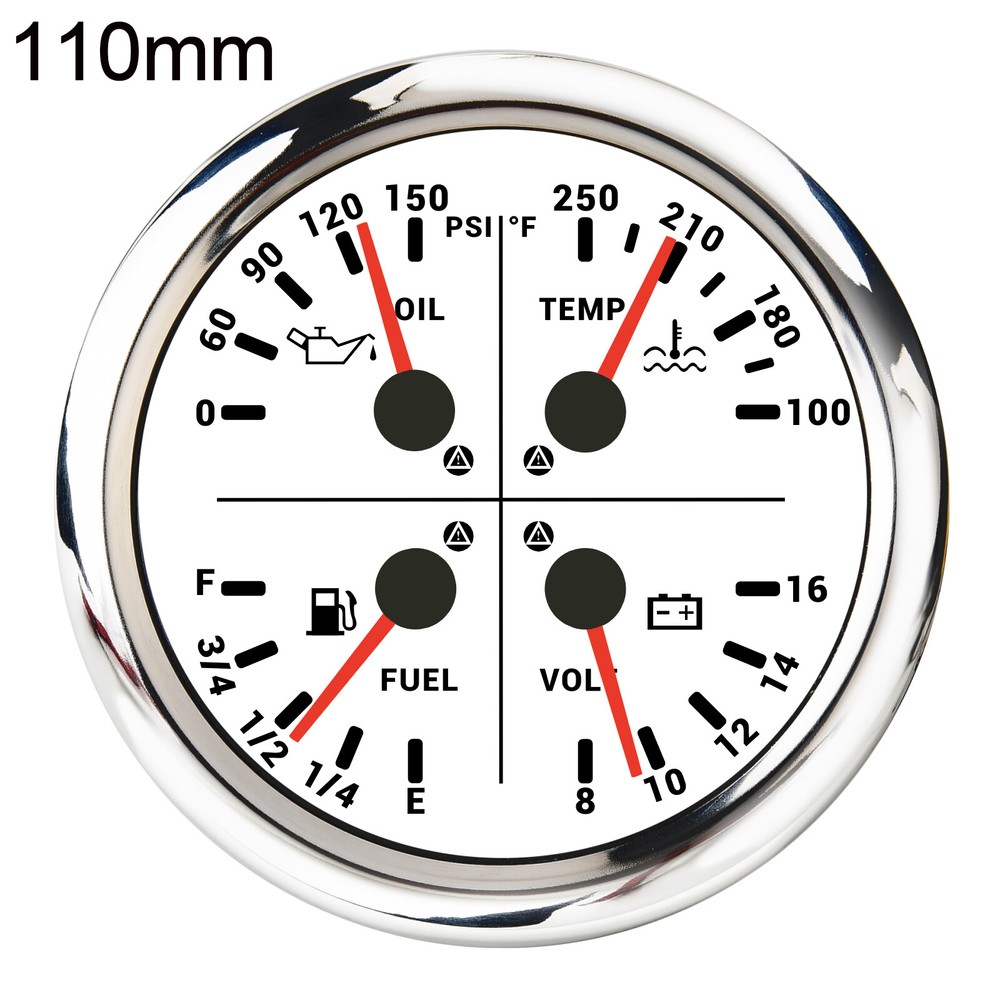 110mm GPS Speedometer 0-160MPH with Tacho & 110mm 4 IN 1 Gauge Set With Senders 2 Gauge Set 110mm GPS Speedometer 160MPH with Tacho & 4 IN 1 Gauge With Senders Features: Suitable for all vehicles and off-road vehicles Analog Display Speedometer & Tachometer & Digital Display Odometer. Speedometer with Turn Signal & High Beam Function. High Quality Stepper Motor Movement. Convex Clear Lens, 316 Stainless Steel Bezel & ABS Plastic Housing. White Gauge Faceplate, Red Needle. RED LED Illumination. IP67 Waterproof, Rustproof, Anti-Fog & UV-Resistant. Tachometer Fits Both Gas & Diesel Powered Engine. 4 In 1 Multi-Function Gauge with Warning Function. 2 IN 1 Multi-Function Gauge Requires 12 / 24 Volt Negative Ground Systems. 4 IN 1 Multi-Function Gauge Requires 12 Volt Negative Ground Systems. Most importantly, the gauge is easy to setup, and can be used in all vehicles, boats and off-road vehicles. GPS Speedometer Specifications: Application: Universal fit for Motorcycle/ Boat/Truck/Bus/Car Electronic Speedometer (stepper motor) No Mechanic Sensor, get speed signal from GPS Speed ≠0 and show accurate speed in tunnel with the help of accelerometer GPS Blind Area Odometer Compensation OverSpeed Buzzer Alarm (Value Adjustable) Indication Light (Left, Right and High Beam) Installation Diameter: 110mm (4 3/8") Speed Range: 0~160MPH RPM Range: 0~8000RPM Mileage Range: 0-99999.9 miles Working Voltage: 8-16V Power consumption:<120MA Working temperatures: - 20 to 70°C Storage temperatures: -30 to 80℃ Protection rank: IP67 Waterproof Reverse polarity protection and anti-fogging performance 4 In 1 Multi-Function Gauge Fixing dimension: 110mm (4-3/8") Indicating Range: Oil press. meter: 0-150Psi Water temp. meter: 100-250℉ Fuel level meter: 0-100%, empty-full; 0-190ohms/240-33ohms, The signal can be adjusted Voltmeter: 8-16V Working Voltage: 12V Input Signal: 10-184ohms for 0-150Psi oil pressure meter; 0-100% for fuel level meter;(Default 0-190ohms, can adjust to 240-33ohms) 8-16V voltage meter; Input Signal 301-22ohms for water temperature meter Red backlight Protection grade is IP67, the whole body is completely waterproof; Excellent antifogging function; 316 Stainless steel bezel with curved glass; Convenient Installation by multi-plug socket connecting way; Accessories: matched with connectors, Installation Instruction Alarm Value: 1. Fuel<13% Alarm 2. Oil pressure <0.8Bar Alarm 3. Water temp.<95℃ Alarm 4. Voltage<11.5V Alarm Package Included: 1 x 110mm 4 in 1 Multifunctional Gauge 1 x 110mm GPS Speedometer Gauge 1 x Fuel level sensor 240-33ohms 1 x 1/8NPT Water Temp Sensor 1 x 1/8NPT Oil pressure sensor 1 x GPS Antenna 2 x Cable 2 x Installation Instruction