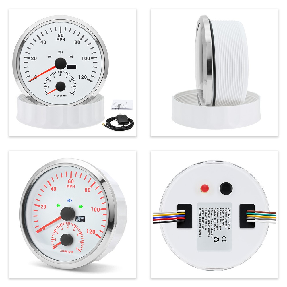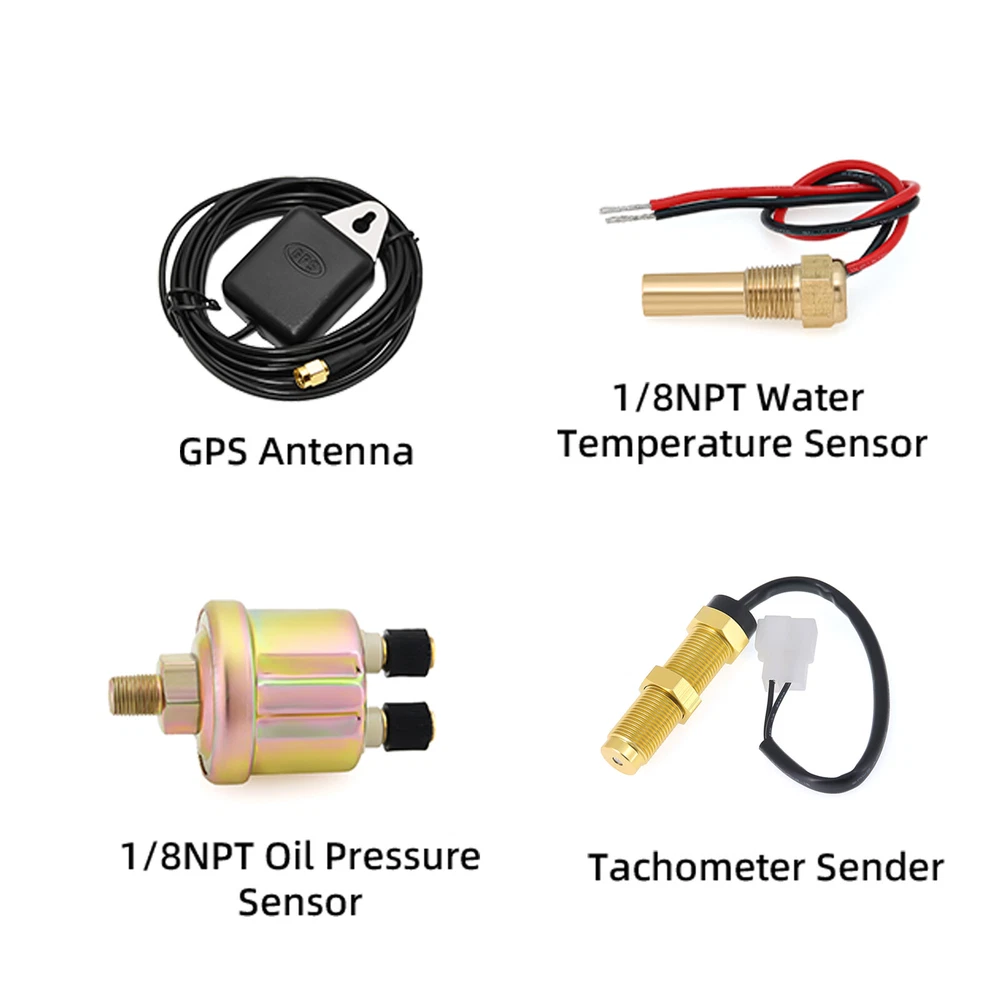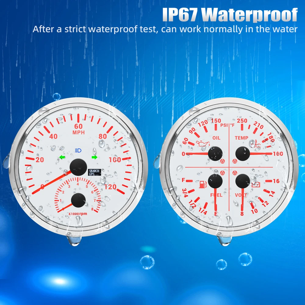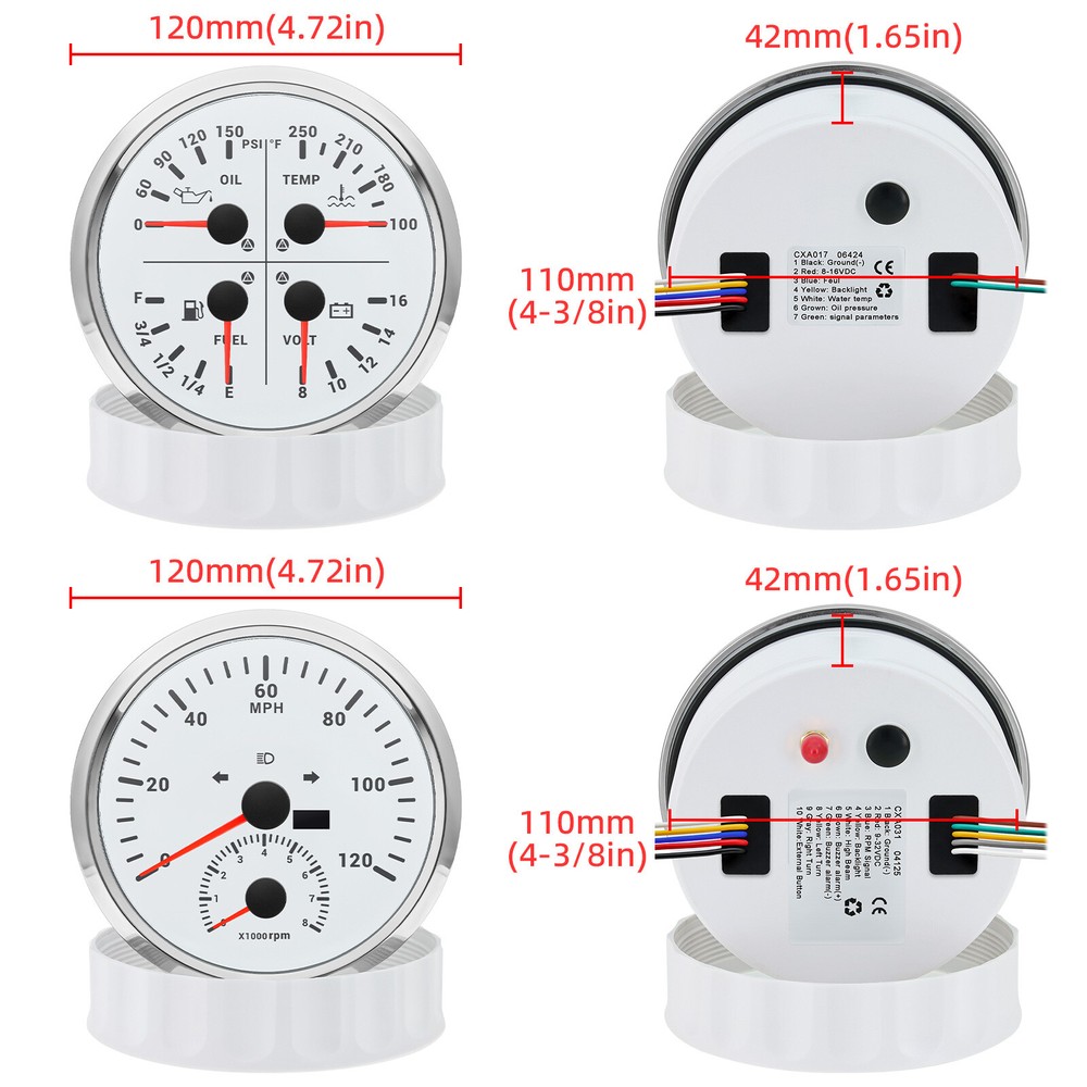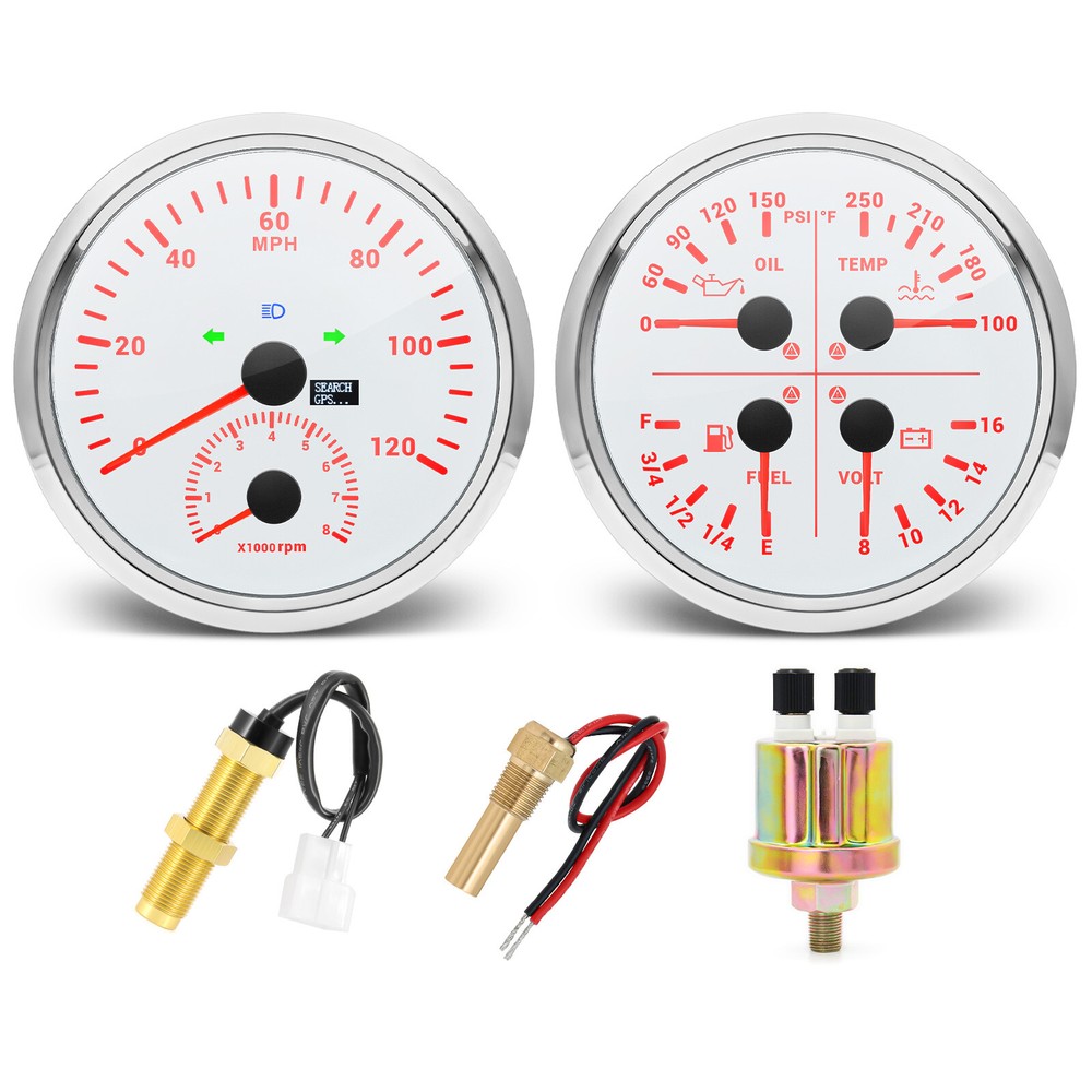 2 Gauge Set 110mm GPS Speedometer Tachometer 0-120MPH & 4in 1 Gauge with Senders 2 Gauge Set 110mm GPS Speedometer Tachometer 120MPH 8000RPM Turn Signal with 110mm 4 in1 Gauge For Car Boat Features: Suitable for all vehicles and off-road vehicles Analog Display Speedometer & Tachometer & Digital Display Odometer. Speedometer with Turn Signal & High Beam Function. High Quality Stepper Motor Movement. Convex Clear Lens, 316 Stainless Steel Bezel & ABS Plastic Housing. Black Gauge Faceplate, Red Needle. RED LED Illumination. IP67 Waterproof, Rustproof, Anti-Fog & UV-Resistant. Tachometer Fits Both Gas & Diesel Powered Engine. 4 In 1 Multi-Function Gauge with Warning Function. 2 IN 1 Multi-Function Gauge Requires 12 / 24 Volt Negative Ground Systems. 4 IN 1 Multi-Function Gauge Requires 12 Volt Negative Ground Systems. Most importantly, the gauge is easy to setup, and can be used in all vehicles, boats and off-road vehicles. GPS Speedometer Specifications: Application: Universal fit for Motorcycle/ Boat/Truck/Bus/Car Electronic Speedometer (stepper motor) No Mechanic Sensor, get speed signal from GPS Speed ≠0 and show accurate speed in tunnel with the help of accelerometer GPS Blind Area Odometer Compensation OverSpeed Buzzer Alarm (Value Adjustable) Indication Light (Left, Right and High Beam) Installation Diameter: 110mm (4 3/8") Speed Range: 0~120MPH RPM Range : 0~8000RPM Mileage Range: 0-99999.9miles Working Voltage: 8-16V Power consumption:<120MA Working temperatures: - 20 to 70°C Storage temperatures: -30 to 80℃ Protection rank: IP67 Waterproof Reverse polarity protection and anti-fogging performance 4 In 1 Multi-Function Gauge Fixing dimension: 110mm (4 3/8") Indicating Range: Oil press. meter: 0-150PSI; Water temp. meter: 100-250℉ Fuel level meter: 0-100%, empty-full; 0-190ohms/240-33ohms, The signal can be adjusted Voltmeter: 8-16V Working Voltage: 12V Input Signal: 10-184ohms for 0-10Bar oil pressure meter; 0-100% for fuel level meter;(Default 0-190ohms, can adjust to 240-33ohms) 8-16V voltage meter; Input Signal 301-22ohms for water temperature meter Red backlight Protection grade is IP67, the whole body is completely waterproof; Excellent antifogging function; 316 Stainless steel bezel with curved glass; Convenient Installation by multi-plug socket connecting way; Accessories: matched with connectors, Installation Instruction Alarm Value: 1. Fuel<13% Alarm 2. Oil pressure <0.8Bar Alarm 3. Water temp.<95℃ Alarm 4. Voltage<11.5V Alarm Package Included: 1 x 110mm 4 in 1 Multifunctional Gauge 1 x 110mm GPS Speedometer Gauge 1 x GPS Antenna 1 x Tacho sensor 1 x Water temp sensor 1/8NPT 1 x Oil pressure sensor 1/8NPT 2 x Cable 2 x Installation Instruction