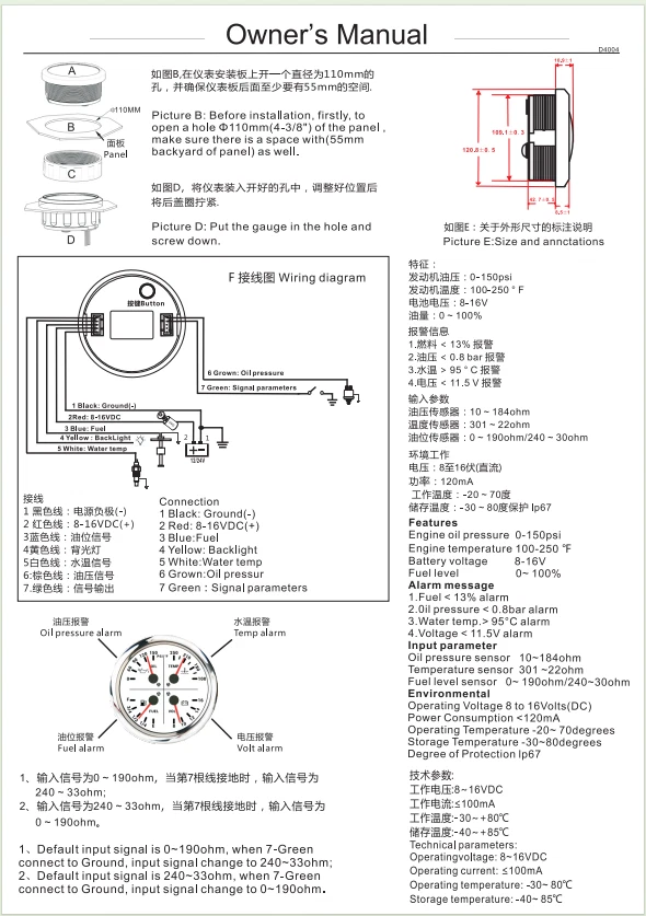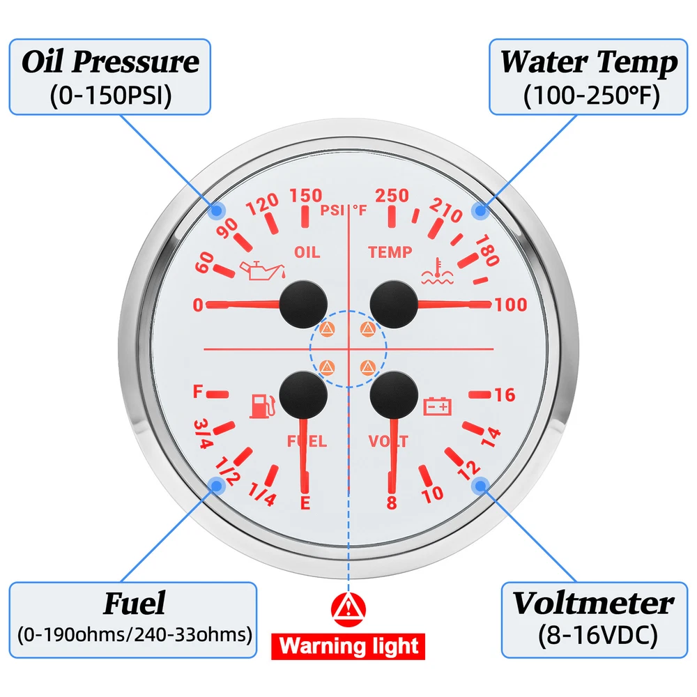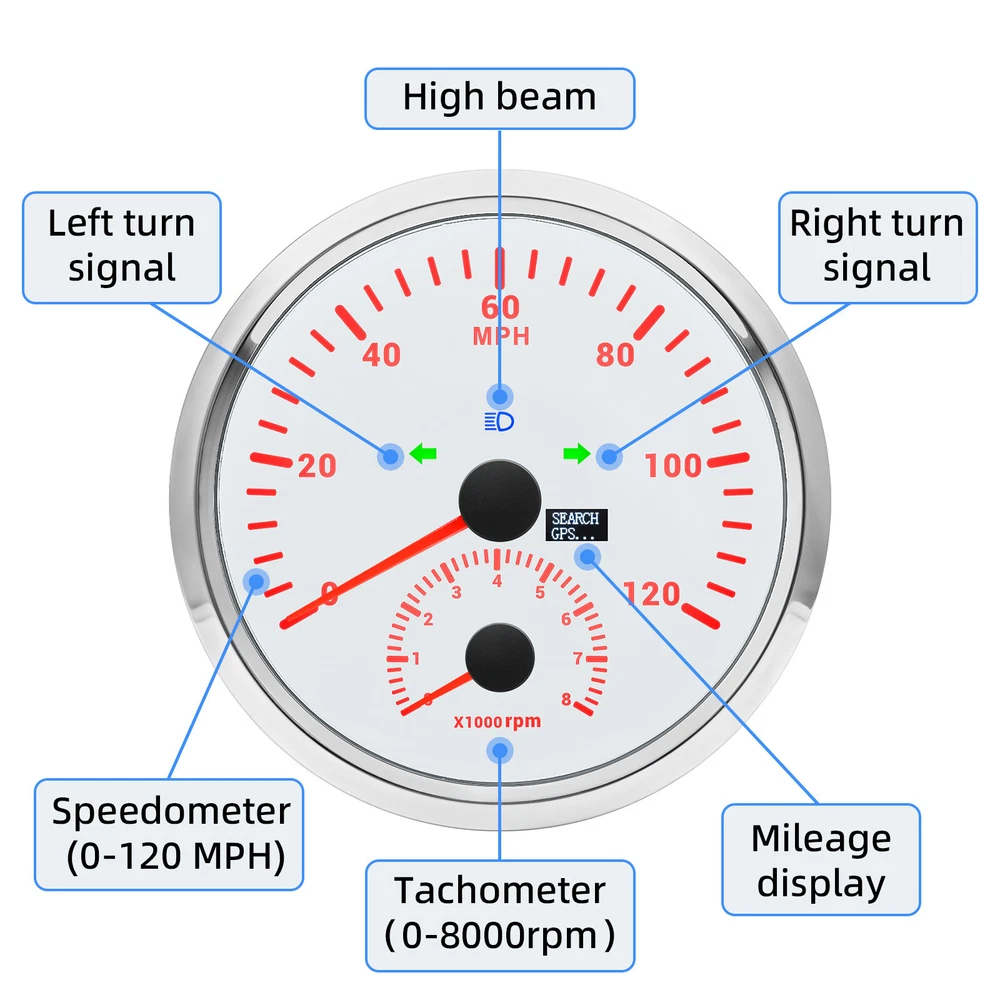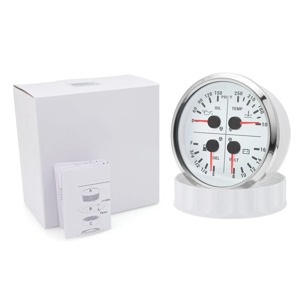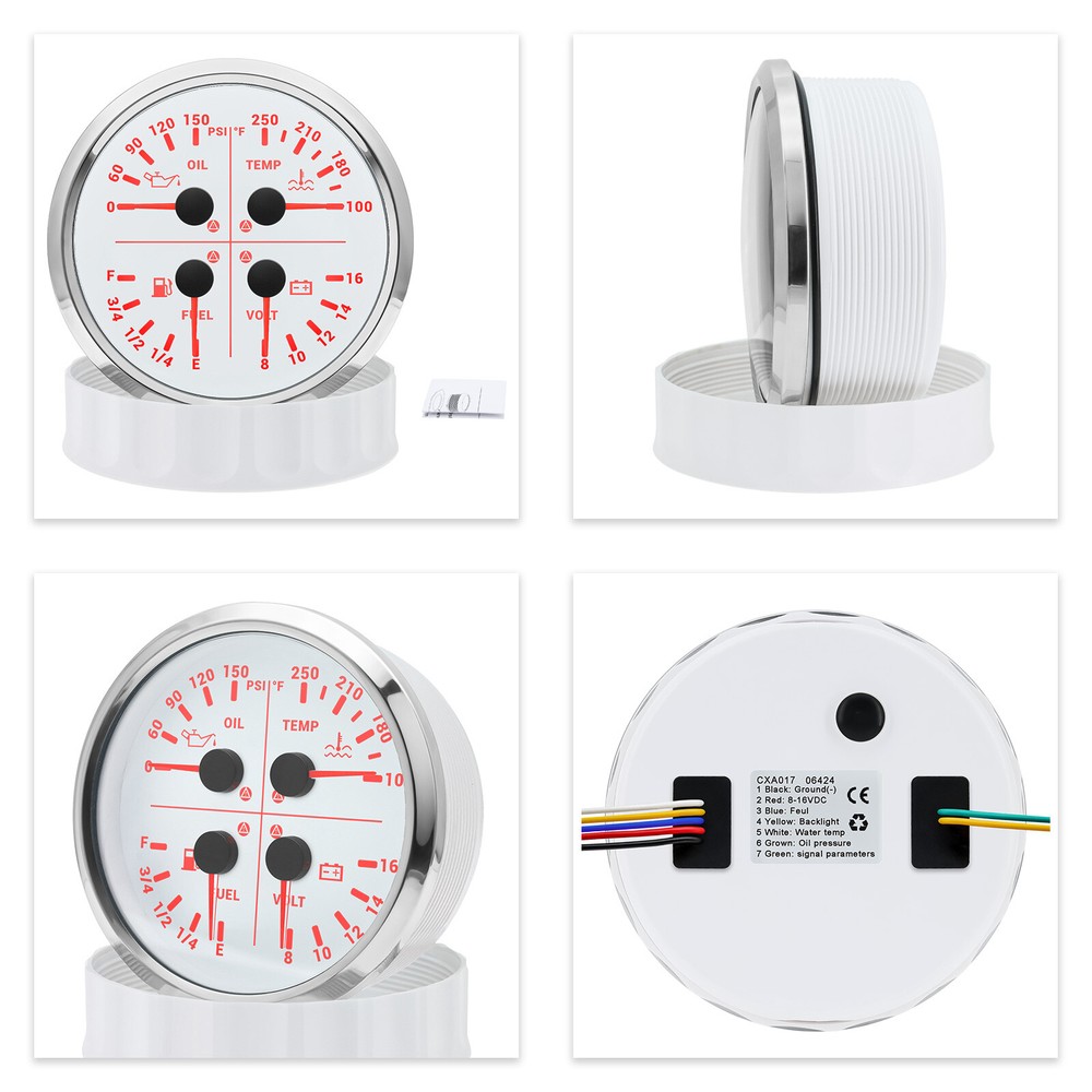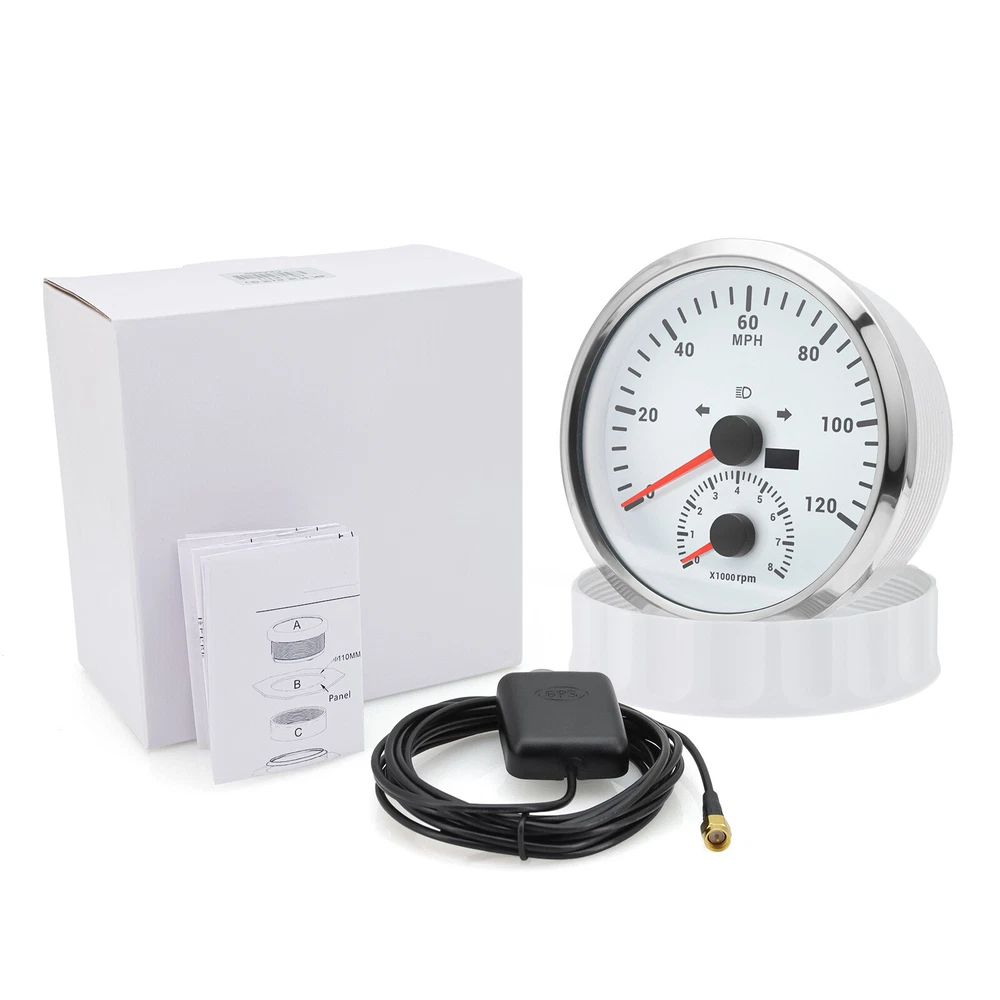 2 Gauge Set 110mm GPS Speedometer Tachometer 0-120MPH & 4in 1 Gauge with Senders 2 Gauge Set 110mm GPS Speedometer Tachometer 120MPH 8000RPM Turn Signal with 110mm 4 in1 Gauge For Car Boat Features: Suitable for all vehicles and off-road vehicles Analog Display Speedometer & Tachometer & Digital Display Odometer. Speedometer with Turn Signal & High Beam Function. High Quality Stepper Motor Movement. Convex Clear Lens, 316 Stainless Steel Bezel & ABS Plastic Housing. Black Gauge Faceplate, Red Needle. RED LED Illumination. IP67 Waterproof, Rustproof, Anti-Fog & UV-Resistant. Tachometer Fits Both Gas & Diesel Powered Engine. 4 In 1 Multi-Function Gauge with Warning Function. 2 IN 1 Multi-Function Gauge Requires 12 / 24 Volt Negative Ground Systems. 4 IN 1 Multi-Function Gauge Requires 12 Volt Negative Ground Systems. Most importantly, the gauge is easy to setup, and can be used in all vehicles, boats and off-road vehicles. GPS Speedometer Specifications: Application: Universal fit for Motorcycle/ Boat/Truck/Bus/Car Electronic Speedometer (stepper motor) No Mechanic Sensor, get speed signal from GPS Speed ≠0 and show accurate speed in tunnel with the help of accelerometer GPS Blind Area Odometer Compensation OverSpeed Buzzer Alarm (Value Adjustable) Indication Light (Left, Right and High Beam) Installation Diameter: 110mm (4 3/8") Speed Range: 0~120MPH RPM Range : 0~8000RPM Mileage Range: 0-99999.9miles Working Voltage: 8-16V Power consumption:<120MA Working temperatures: - 20 to 70°C Storage temperatures: -30 to 80℃ Protection rank: IP67 Waterproof Reverse polarity protection and anti-fogging performance 4 In 1 Multi-Function Gauge Fixing dimension: 110mm (4 3/8") Indicating Range: Oil press. meter: 0-150PSI; Water temp. meter: 100-250℉ Fuel level meter: 0-100%, empty-full; 0-190ohms/240-33ohms, The signal can be adjusted Voltmeter: 8-16V Working Voltage: 12V Input Signal: 10-184ohms for 0-10Bar oil pressure meter; 0-100% for fuel level meter;(Default 0-190ohms, can adjust to 240-33ohms) 8-16V voltage meter; Input Signal 301-22ohms for water temperature meter Red backlight Protection grade is IP67, the whole body is completely waterproof; Excellent antifogging function; 316 Stainless steel bezel with curved glass; Convenient Installation by multi-plug socket connecting way; Accessories: matched with connectors, Installation Instruction Alarm Value: 1. Fuel<13% Alarm 2. Oil pressure <0.8Bar Alarm 3. Water temp.<95℃ Alarm 4. Voltage<11.5V Alarm Package Included: 1 x 110mm 4 in 1 Multifunctional Gauge 1 x 110mm GPS Speedometer Gauge 1 x GPS Antenna 1 x Tacho sensor 1 x Water temp sensor 1/8NPT 1 x Oil pressure sensor 1/8NPT 2 x Cable 2 x Installation Instruction