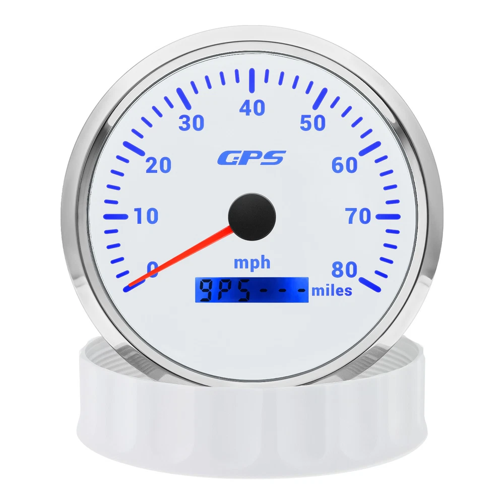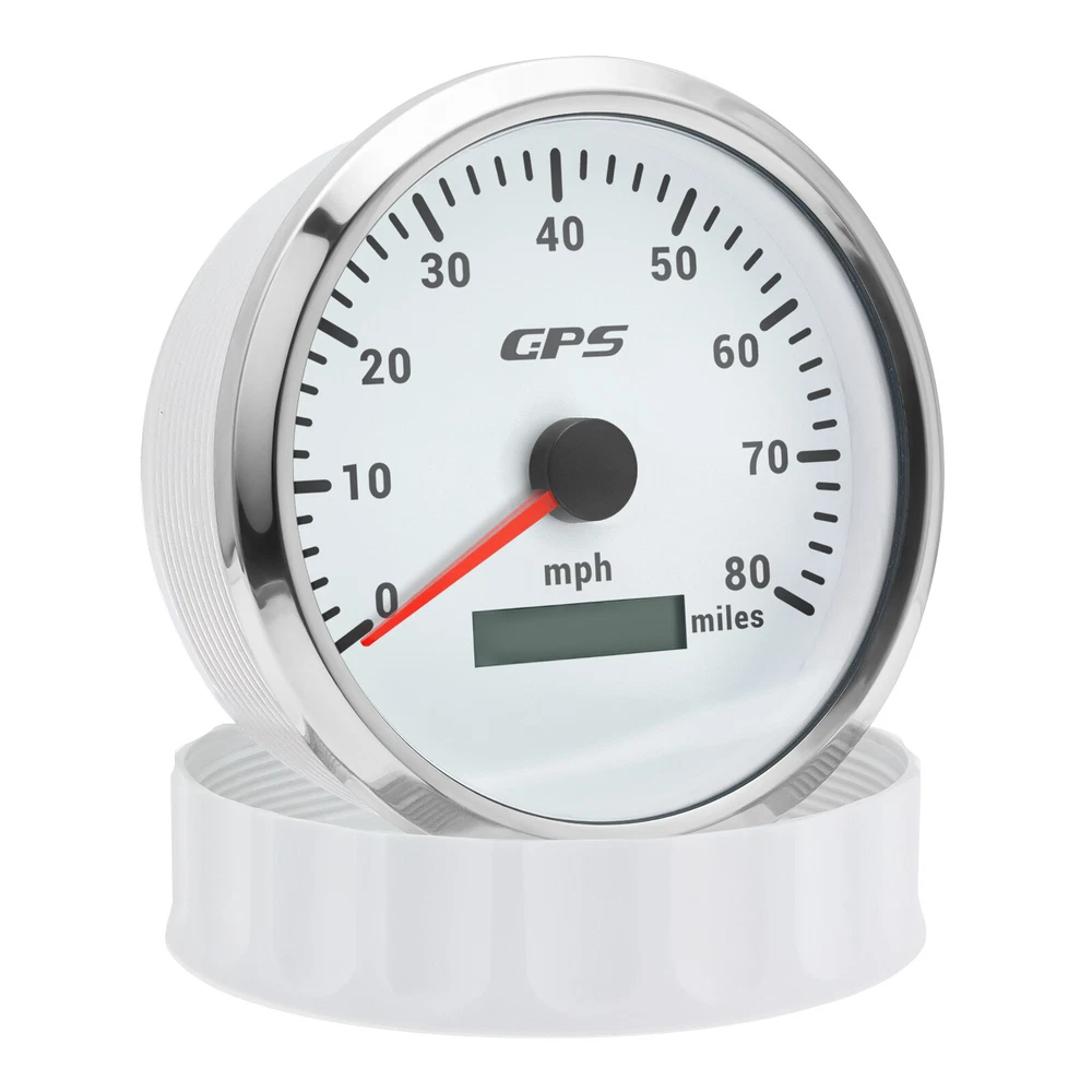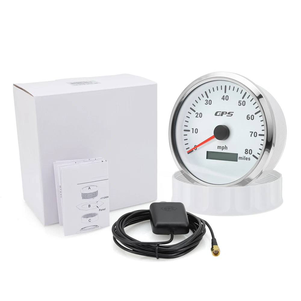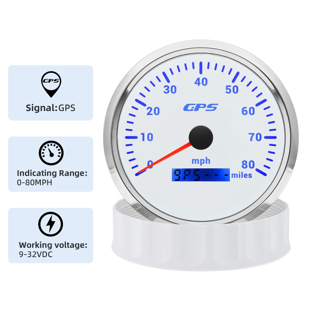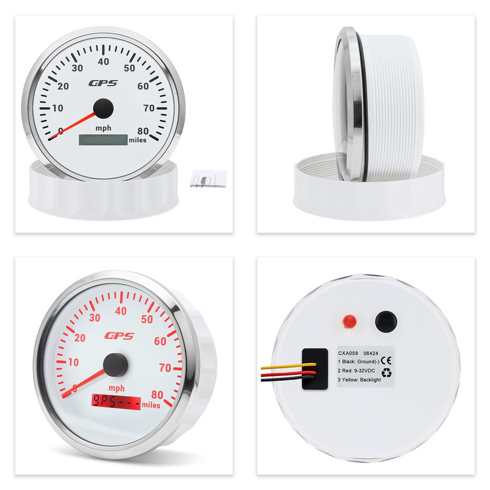 110mm White GPS Speedometer 0-80MPH Gauge for Motorcycles Boat Car Truck ATV US 110mm White GPS Speedometer 0-80MPH Gauge 7 Colors LED for Motorcycles Boat Car Truck ATV Feature: High-brightness LED backlight. 316 stainless steel for long-term use even in acid-base, humid environment. IP67 waterproof and dust-proof grade. With curved glass( with anti-fog function). Suitable for all kinds of vehicle modification. Using stepper motor drive pointer, accurate display of the engine speed, and with the LCD display clear display mileage. Gauges have many kinds backlight color (red,yellow,orange,green,blue,purple,white),customers can adjust any color that you like. GPS Speedometer Gauge Install Diameter: Φ110mm (4-3/8") Signal: GPS Working Voltage: 9~32V DC Size: 12x8x12cm/4.72x3.1x4.75 inch Units: MPH Colors:White&Silver Indication Range: 0-80MPH Backlight: 7Colors LED Package Includes: 1X 85MM GPS Speedometer Gauge 1X Wire Harness 1X GPS Antenna 1X Installation Instruction