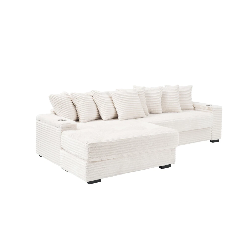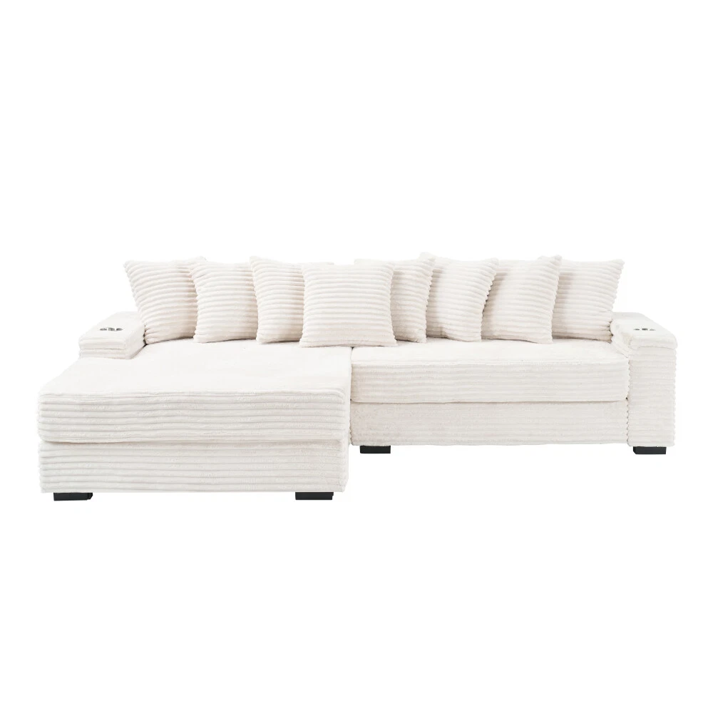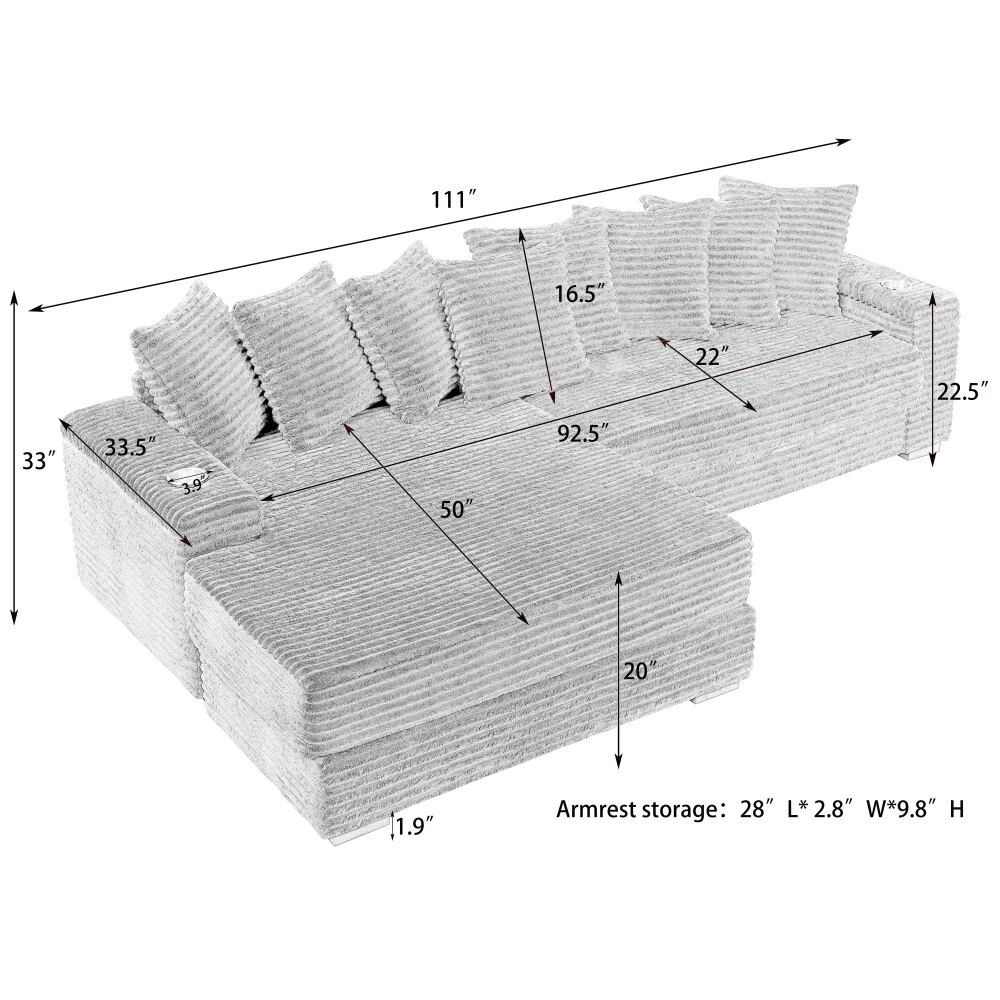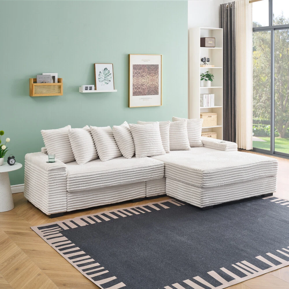 The color of the sofa is beige, its hue is soft, like a gentle snow white that sparkles under the light, not only giving a and natural feeling but also adding a pure and simple atmosphere to the space. The sofa armrests have storage functions, making it convenient to place books and tablets. The right side is equipped with a tea cup rack, is convenient and practical. The L-shaped design of the sofa further enhances its comfort, allowing people to lean and lie lazily, fully enjoying their leisure time. The cushions and pillows are filled with high-resilient foam and stuffed toys cotton, respectively, which have good resilience and soft seating feel, and are not easy to collapse, providing a very high level of comfort. The fabric is made of high-quality corduroy with smooth and thick texture, clear corduroy lines, and dense warp and weft, makes it feel very delicate and thick and less likely to pill. The sofa frame is made of solid wood, which is sturdy, durable, and resistant to deformation, ensuring it can stand the test of time.Description The chaise lounge of this sofa can be switched left and right. You only need to move the position of the chaise lounge slightly, and immediately a spacious area will be expanded, flexibly adapting to the needs of different scenarios and keeping the living room layout always in line with your current wishes. Product Information Sofa size 111.4*33.4*32.2 Product weight 191.5lbs Gross weight 214.93lbs It can seat several people 3 How to maintain the product Regularly clean with a vacuum cleaner Sofa color Beige Package Size A:41.73*29.13*14.17 B:51.96*29.13*9.05 C:49.60*26.37*12.99 Backrest filling material Sponge Frame material Solid wood + wood-based panel Product type Sofa Cushion filling material Sponge Supporting capacity 500 lbs Whether installation is required Yes Installation level Assembly level Seat structure Wood-based panel + Spring cushion Leg material/color Plastic/Black Sofa fabric Corduroy Whether the sofa cover can be removed NO Whether the pillowcase is removable and washable NO Pillow filling material Doll cotton The beige corduroy sofa with multiple throw pillows and a chaise longue that can be swapped. The L-shaped sofa with its simple and streamlined design not only elevates the decor of your home but also adds a warm touch. Made high-quality corduroy fabric, it brings a fashionable yet timeless feel to your living room. When sunlight pours in, it feels lazy and warm, as if has healing powers. The sofa is filled with high-density sponge, ensuring it remains firm even after long hours of sitting. The cushions are filled with polyester cotton, them soft and elastic, providing comfort whether you're sitting or lying down. Meanwhile, the overall structure of the sofa is made with solid wood and plywood, ensuring and weight-bearing capacity. The design concept of the L-shaped sofa is not only to provide a comfortable resting space but also to maximize space utilization. Its armrest function brings a lot of convenience to daily life. So don't miss out on the L-shaped sofa. Choose your favorite color and make your home more fun and! PLEASE NOTE: All colors on our website are for reference only, actual product colors may vary slightly due to different color settings for each screen device. Most of our sofas are measured by hand, so dimensions are for reference only and may vary slightly. On Mar 9, 2025 at 18:09:57 PDT, seller added the following information: