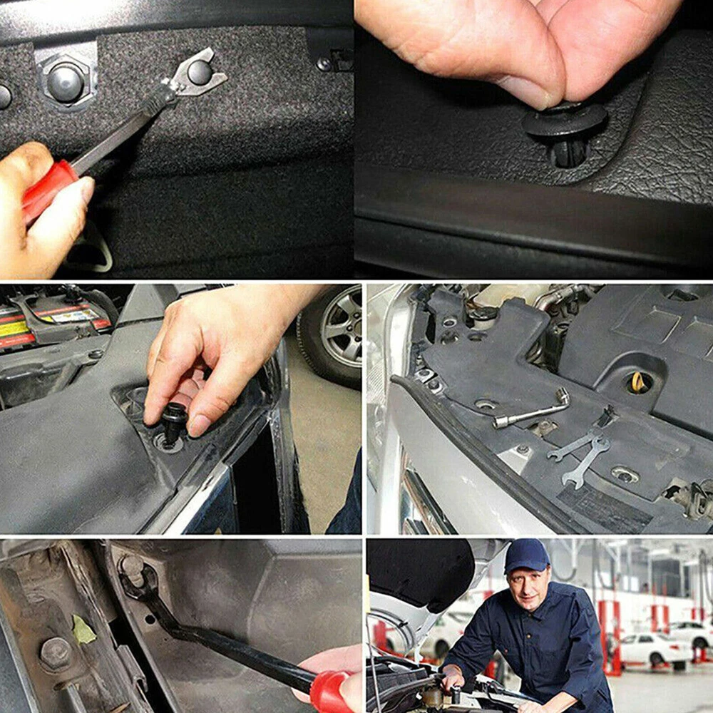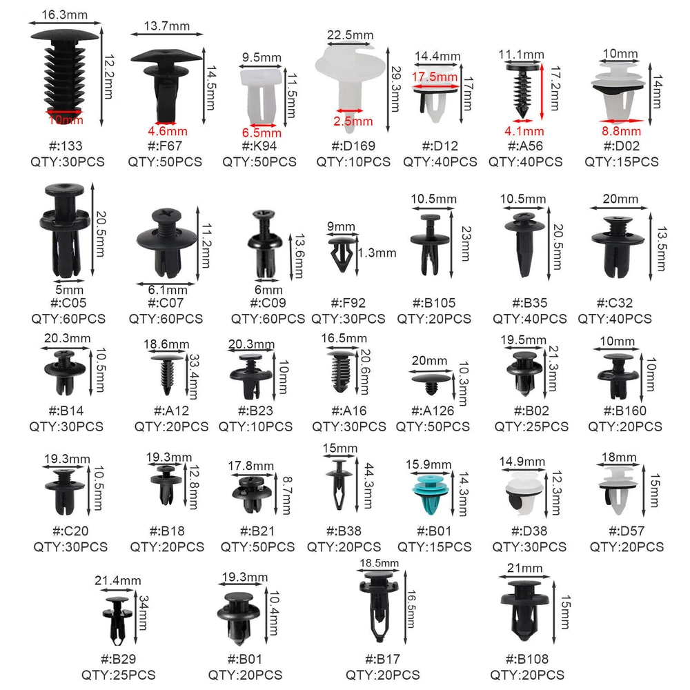 1115PCS Car Push Retainer Clips & Auto Fasteners Assortment-32Most Popular Sizes Nylon Bumper Fender Rivets with 10 Cable Ties and Blue Fastener Remover for Ford GM Toyota Honda Chrysler Benz Nissan About this item UNIVERSAL AUTOMOTIVE CLIPS KIT - 1000PCS great assortment push retainer kit including 32 most popular sizes, 4 different kinds tools with 1 Blue Fastener Remover, fitting for door trim, radiator shield yoke, fender, bumper, side skirt, grille, engine cover and splash shield retainers replacement,compatible with Ford, GM, Chrysler, Toyota, Honda and more. DURABLE MATERIAL - These car retainer clips are made of durable nylon and metal material, anti-wear and anti-corrosion, would not break or crack easily during use.All packed in a plastic container for easy organization and storage. WIDE APPLICATION - Universal bumper Clips Rivets can be used on cars, truck, motorcycles, buses, trains, planes, caravans, etc. BONUS ACCESSORIES - Free 5 remover tool and 10 cable ties in different size for quick and easy remove clips, 100x sponge gaskets avoid causing damage or scratch to your loved car. 1OO% SATISFACTORY SERVICE - offers clear pictures for your reference, please check the size, type, and shape to make sure the item is the one that you need. If there is any issue after sale such as inappropriate size& shape, please email us directly, we will offer 1OO% satisfactory service. Excellent Accessories to Protect Your Car 1 x Fastener Remover--Hold your parts very tightly, won't be loose as the time passing by and is easily removed without damaging it. 4 x Plastic Fastener Remover--Easy access to slide under confined clips and quickly remove those stubborn clips. 5 x Longer Cable Tie--No-Slip locking teeth on each tie for the securing of cables or wires in tight places. 5 x Shorter Cable Tie--Great for electronic cord organization and management. 100 x Spongy Cushion--Improve shakeproof and sound-proof performance. They make contact surface more stable, and will not shake. Fitment 32 Most Popular Sizes for Many Brand Vehicles Great for GM, for Ford, for Chrysler, for Toyota, for Honda, for Nissan, for Mazda, for Chevy, for Jeep etc.It also can use for truck, motorcycles, buses, trains, planes,caravans etc.For the cars that the size and shape fit your requirements, but more than that Fit for car bumper, car fender, engine cover, door trim panel, interior trim panel and various trim panels, side skirt etc.