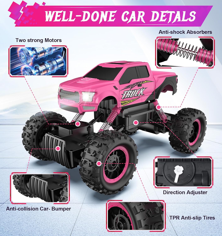 ⭐⭐⭐⭐⭐ Top Rated by Similar Buyers Realistic Off-Road Vehicle: The 1/12 large RC car looks realistic like a real thing. With anti-slip tires and shock absorbers, it can run on multiple terrains including beach, sand, rock, concrete road, etc. Special color for girls toys age 8-10 years old, gifts for girls 6 to 10 years old. Powerful Dual Motors, Anti Crash Bumper: Four-wheel drive and two built-in motors provide this monster trucks with strong power to run easily and stably on different surfase. It can even climb slope about 45-degree and over objects indoor/outdoor. The anti-collision car bumper protects the body and frame. Independent Signal, No interference: The wireless control system runs on a 2.4 GHZ frequency with a range of up to 100 feet, providing a stable signal and non-jamming function. Multiple users can play at the same time without interference. Gift Ideas for Girls: The DOUBLE E RC car comes with LED headlights and DIY stickers. You can make it what your kids like. It's a great gift idea for Chiristmas, birthday, party, and other festivals, and perfect for family time. Put your work on hold and enjoy exploring the field of automotive technology with your kids. Quality and Service Promise: DOUBLE E rc trucks are in compliance with toys dafety requirements of CPSIA and ASTM and obtained CPC certificate. We offer 30-day unconditional exchange/return and one-year part warranty. Please feel free to reach us for any concern at any time. Ships FREE from the US