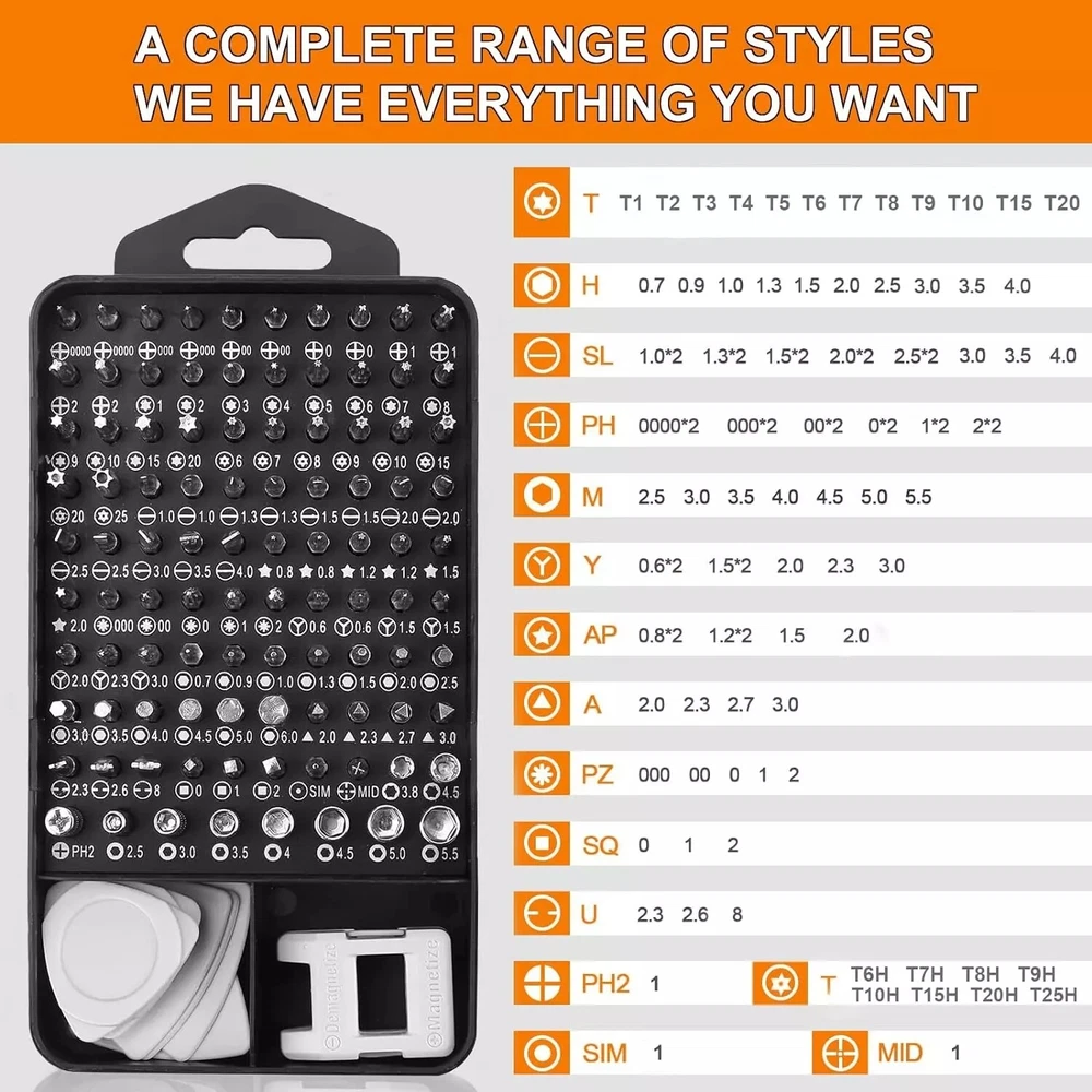 Product Features: Complete Repair Kit: This versatile 115-in-1 screwdriver set includes 98 different precision bits (Phillips, Flat, Torx, Pentalobe, Hexagon, and more) along with a variety of opening tools. Perfect for repairing electronics, smartphones, laptops, glasses, and other household items. High-Quality Military-Grade Bits: Made from durable chrome vanadium steel, these bits are designed to resist wear, oxidation, and corrosion, ensuring long-lasting performance. The magnetized tip easily picks up and secures screws, making it simple to handle even the smallest ones. Ergonomic Design for Comfort: The smooth, rotating cap and ergonomic PP + TPR handle provide maximum comfort and grip, making it easy to work on any project. The flexible extension tool is ideal for reaching screws in tight or hard-to-reach spaces. Sturdy Storage Case: The included storage case keeps all the components neatly organized and secure with a locking latch, ensuring everything is easy to find and portable for use on the go. Specifications: Phillips: PH000, PH00, PH0, PH1, PH2 Pozidriv: PZ0, PZ1, PZ2 Flathead: 1.0mm, 1.5mm, 2.0mm, 2.5mm, 3.0mm, 3.5mm, 4.0mm Torx: T3, T4, T5, T6, T7, T8, T9, T10, T15, T20 Hexagon: 0.7mm, 0.9mm, 1.3mm, 1.5mm, 2.0mm, 2.5mm, 3.0mm, 4.0mm Triangle: 2.0mm, 2.3mm, 2.7mm, 3.0mm Y-Shaped: 2.0mm, 3.0mm U-Shaped: 2.6mm 4mm Socket: M2.5, M3.0, M3.5, M4.0, M4.5, M5.0, M5.5 Package Includes: 98 * Precision Bits 8 * Opening Picks 3 * Pry Bars 1 * Tweezers 1 * Extension Rod 1 * Adapter 1 * SIM Pin 1 * Suction Cup 1 * Retractable Handle