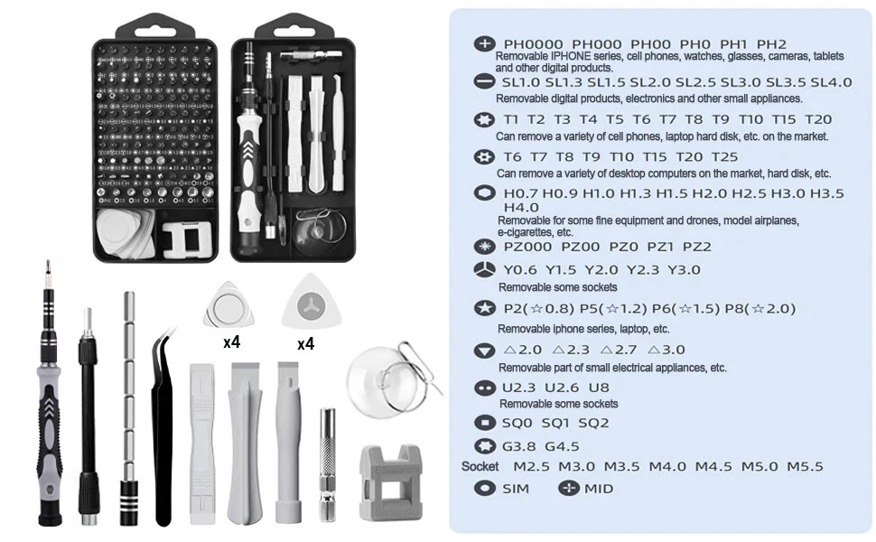 In the hustle and bustle of daily life, have you ever worried about finding the right tool? Ever been stuck with a stubborn little screw? Today, let us present to you - 115-in-1 multifunctional screwdriver set, your problem-solver and your best partner in precision life. 【One thing with multiple uses, precision down to the smallest detail】 From TVs and air conditioners to mobile phones, cameras, and even your car, this set of tools covers 117 different types of screw heads to meet your daily disassembly, assembly and maintenance needs for all equipment. Whether it is a simple repair of home appliances or a delicate operation of digital products, we can easily handle it and solve it perfectly. 【Professional combination, excellent quality】 Made of chromium vanadium alloy, the hardness is as high as 55-60HRC, ensuring that every twisting is accurate. The magnetic handle design prevents the screws from falling off, and the aluminum alloy extension rod combines hardness and flexibility to make your operation more stable and reliable. 【Detailed care, considerate accessories】 The set includes an extension pole with moderate hardness and softness, suitable for operation in narrow corners; anti-static power tweezers and anti-slip silicone handles, providing thoughtful consideration for various occasions. There is also a professional storage box. The PP material is sturdy and durable, the internal space is reasonably planned, and the accessories are arranged in an orderly manner. It is easy to carry and more secure to use. The 115-in-1 multifunctional screwdriver set is more than just a tool, it is a powerful assistant in your life and the embodiment of the pursuit of precision and perfection. Choosing it means choosing an efficient, convenient and reliable life. Take action now and make every corner of your life full of possibilities. Bit Included Specification Triangle:2.0, 2.3, 2.7, 3.0 Pozidriv :PZ000, PZ00, PZ0, PZ1, PZ2 Mini Hexagon Socket :M2.5, M3.0, M3.5, M4.0, M4.5, M5.0, M5.5 Phillips:PH0000*2, PH000*2, PH00*2, PH0*2, PH1*2, PH2*2 Hexagon:H0.7, H0.9, H1.0, H1.3, H1.5, H2.0, H2.5, H3.0*2, H3.5*2, H4.0*2 Torx:T1, T2, T3, T4, T5, T6*2, T7*2, T8*2, T9*2, T10*2, T15*2, T20*2 U-Type:U2.3, U2.6*2 Square:SQ1, SQ1, SQ2 Pentalobe:0.8*2, 1.2*2, 1.5, 2.0*2 Y-Type:Y0.6*2, Y1.5*2, Y2.0, Y2.3, Y3.0 Schlitz:SL1.0*2, SL1.3*2, SL1.5*2, SL2.0*2, SL2.5*2, SL3.0, SL3.5, SL4.0 Special Type:SIM*2, MID*2, P
