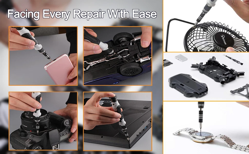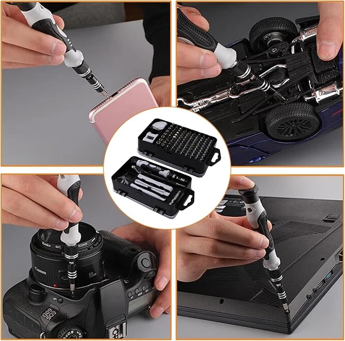 Product Features: Complete Repair Kit: This versatile 115-in-1 screwdriver set includes 98 different precision bits (Phillips, Flat, Torx, Pentalobe, Hexagon, and more) along with a variety of opening tools. Perfect for repairing electronics, smartphones, laptops, glasses, and other household items. High-Quality Military-Grade Bits: Made from durable chrome vanadium steel, these bits are designed to resist wear, oxidation, and corrosion, ensuring long-lasting performance. The magnetized tip easily picks up and secures screws, making it simple to handle even the smallest ones. Ergonomic Design for Comfort: The smooth, rotating cap and ergonomic PP + TPR handle provide maximum comfort and grip, making it easy to work on any project. The flexible extension tool is ideal for reaching screws in tight or hard-to-reach spaces. Sturdy Storage Case: The included storage case keeps all the components neatly organized and secure with a locking latch, ensuring everything is easy to find and portable for use on the go. Specifications: Phillips: PH000, PH00, PH0, PH1, PH2 Pozidriv: PZ0, PZ1, PZ2 Flathead: 1.0mm, 1.5mm, 2.0mm, 2.5mm, 3.0mm, 3.5mm, 4.0mm Torx: T3, T4, T5, T6, T7, T8, T9, T10, T15, T20 Hexagon: 0.7mm, 0.9mm, 1.3mm, 1.5mm, 2.0mm, 2.5mm, 3.0mm, 4.0mm Triangle: 2.0mm, 2.3mm, 2.7mm, 3.0mm Y-Shaped: 2.0mm, 3.0mm U-Shaped: 2.6mm 4mm Socket: M2.5, M3.0, M3.5, M4.0, M4.5, M5.0, M5.5 Package Includes: 98 * Precision Bits 8 * Opening Picks 3 * Pry Bars 1 * Tweezers 1 * Extension Rod 1 * Adapter 1 * SIM Pin 1 * Suction Cup 1 * Retractable Handle