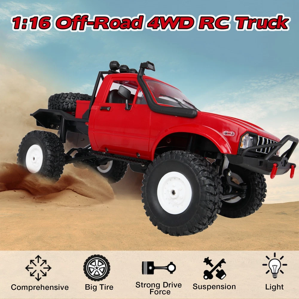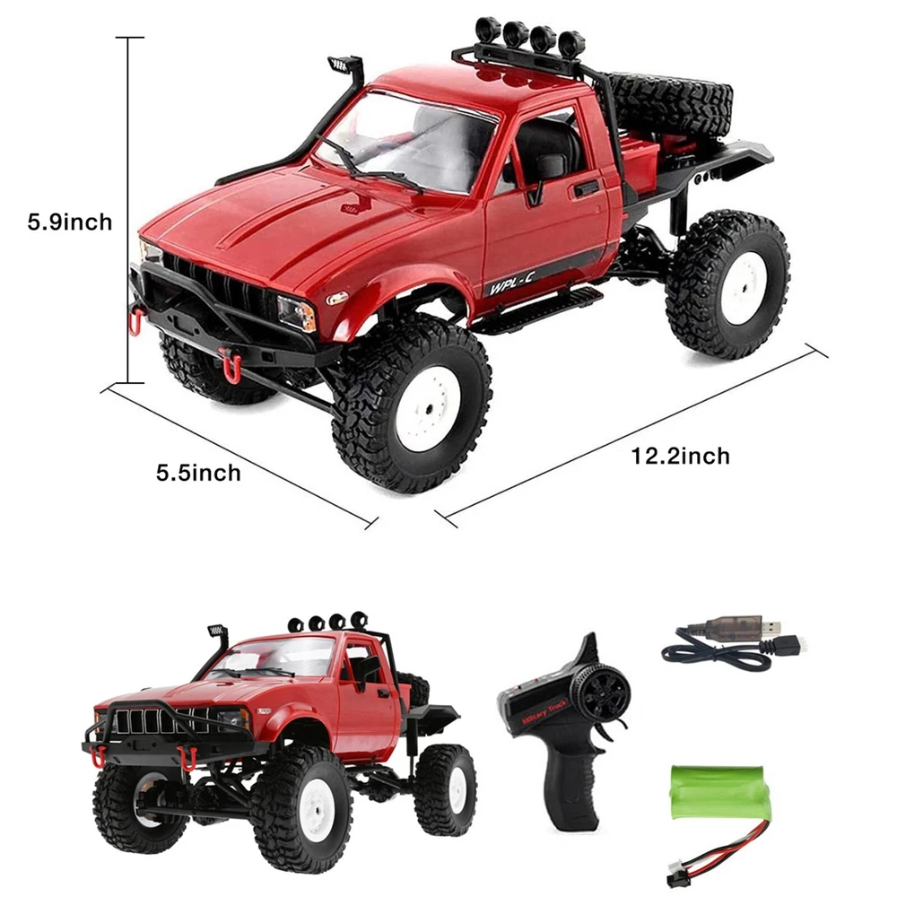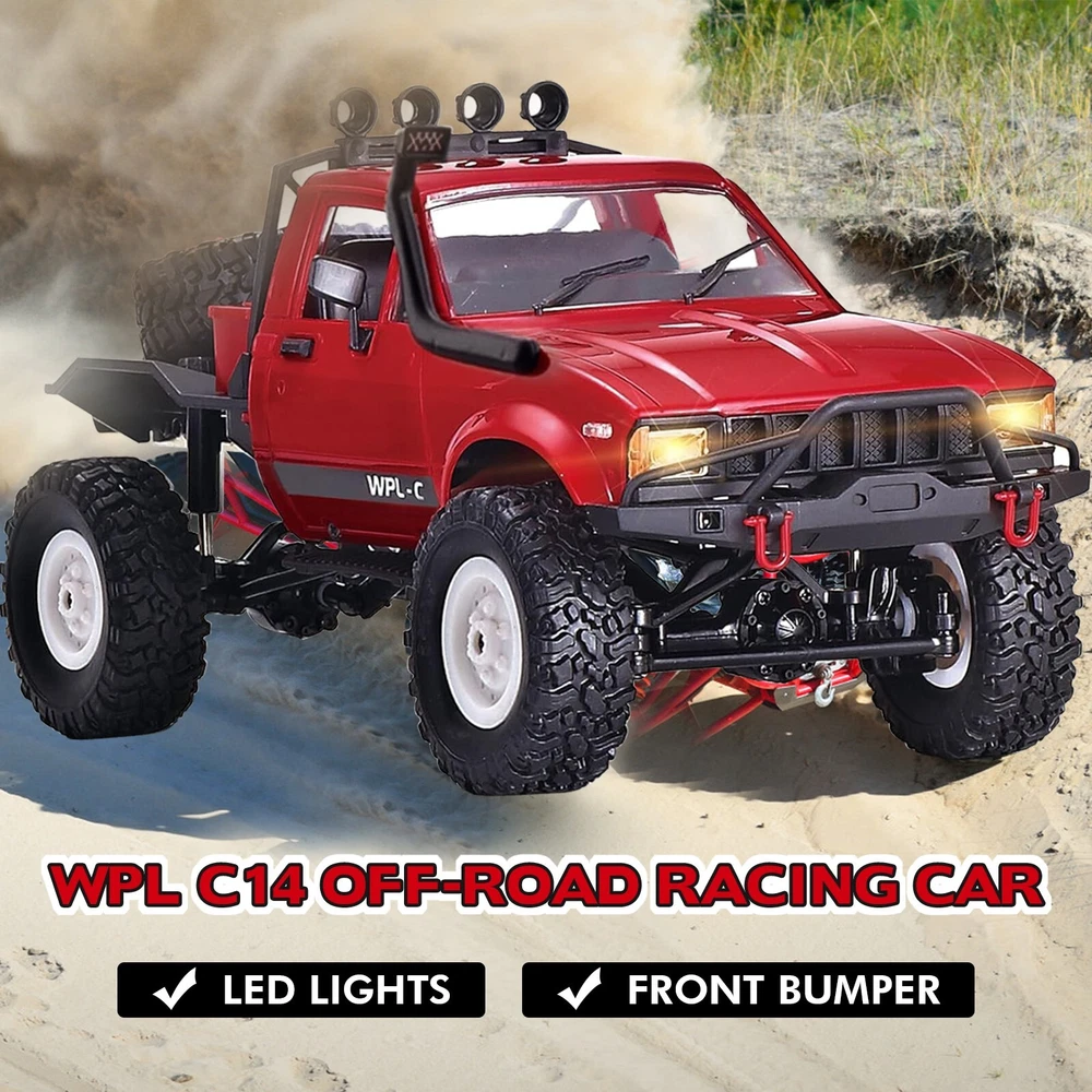 Product Description Features: The car can move to a long distance and satisfied your wish. Functions: go forward, go back, turn left and right. Great strength for the car to move through any rugged road, sand, mud, rock rugged mountain road. Bright Headlamp The car headlight can be lighted. Headlights are wired and quite bright - good for night driving. Full Proportional Control The 2.4Ghz remote control has the functions of high frequency, fast response and long control distance, so that you will not receive radio interference when playing with the remote control car. Big Soft Tires The WPL C14 4WD crawler truck is highly realistic, and it comes with the soft tires for all terrain. On Oct 22, 2024 at 03:17:24 PDT, seller added the following information: On Jan 2, 2025 at 03:17:36 PST, seller added the following information: