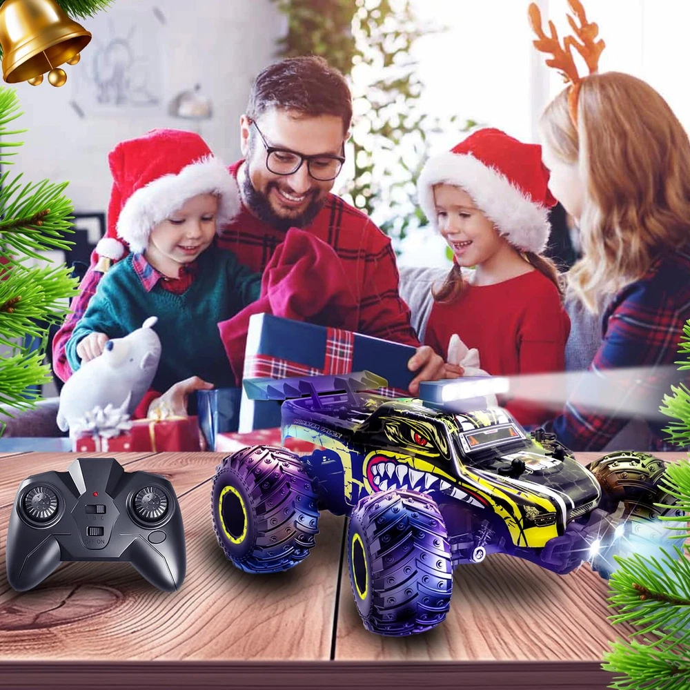 1:20 Super RC Car: This remote control car is powered by 260 strong magnetic motors and powerful 3.7 battery with a speed of 20KM/H, making you more competitive in racing. You can easily drive the rc truck on grass, rocks, sand, concrete roads and other terrains, providing a real off-road racing experience for you and your kids. Anti-Vibration Beyond the Wild: This high-speed rc truck is designed with independent suspension front and rear, and all four wheels are equipped with anti-skid tires and metal shock absorbers, which have good grip and good cushioning effect and help the remote control car keep driving at high speed without rolling over. The monster truck is equipped with anti-collision bumpers at the front and rear to effectively protect the body and frame. 2.4GHz Smart Remote Control: The ergonomically designed handheld 2.4GHz radio remote control has good anti-interference performance, supports multi-vehicle Interference-resistant manipulate, and stable signal transmission makes the remote control car ready to run. The operating range is about 164 feet, and it's fun to race with your kids! Superior Features for Quality and Durability: Made of sturdy, lightweight ABS material and eco-friendly paint, this remote control truck is equipped with classic ball bearings, sturdy drive shafts and a ready-to-run, high-quality gear differential. This RC monster truck is equipped with bright LED headlights and to light up the road ahead while playing at night. Cool LED bodylights add to the excitement! High Performance RC Car Toy : Whether you are new to RC cars or an advanced RC car enthusiast, RC cars are perfect for outdoor or indoor RC adventures. If you're looking for an exciting and extra cool Rc car , you'll love our toy-grade remote control car. Recommended for birthdays, parties and holidays (Children's Day, Christmas, Halloween, Thanksgiving and New Year's Day).