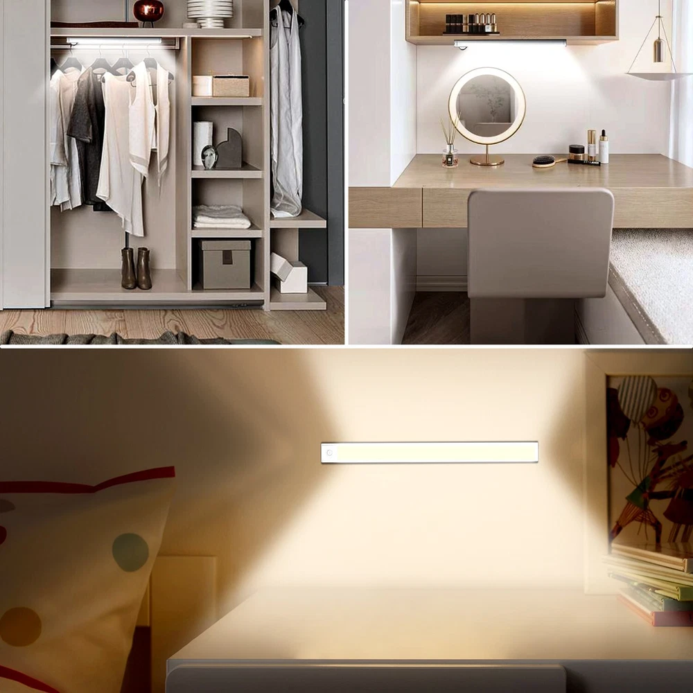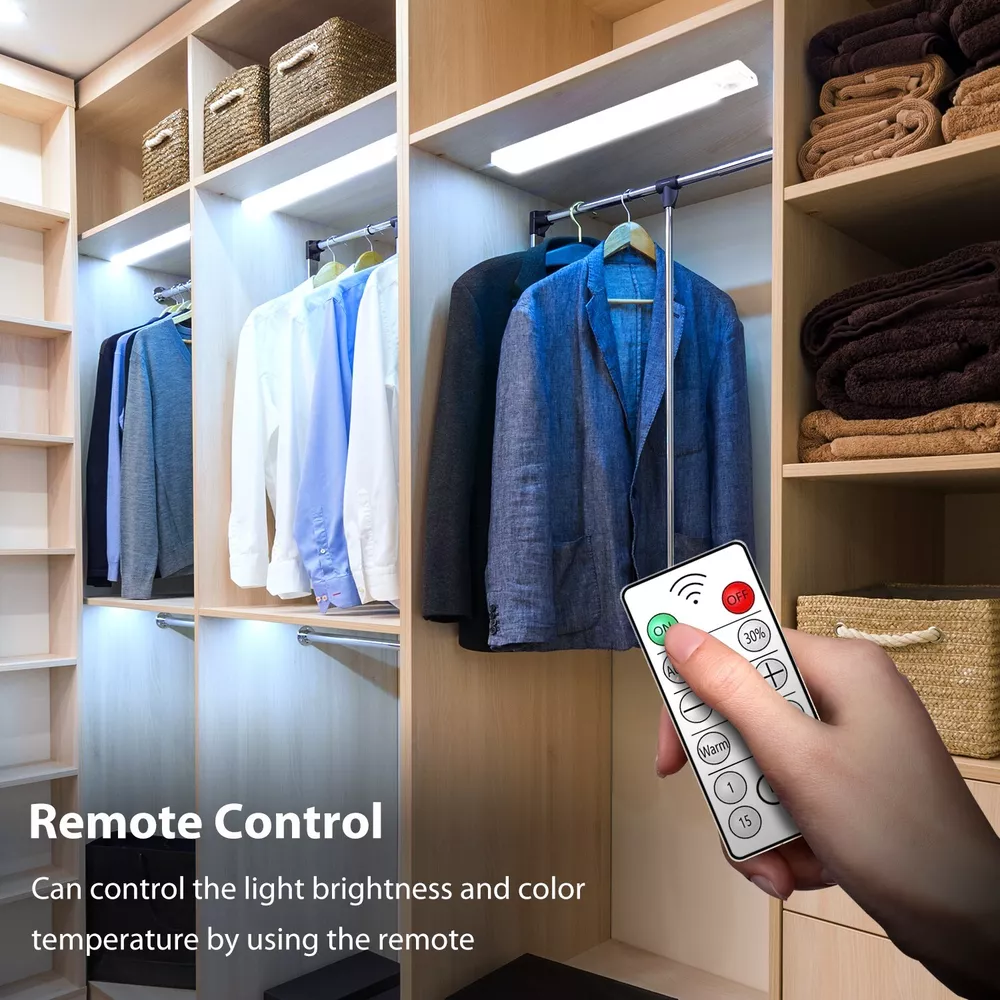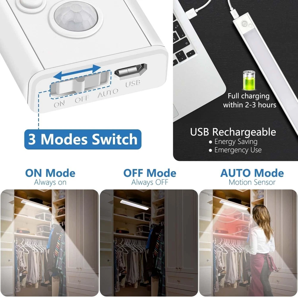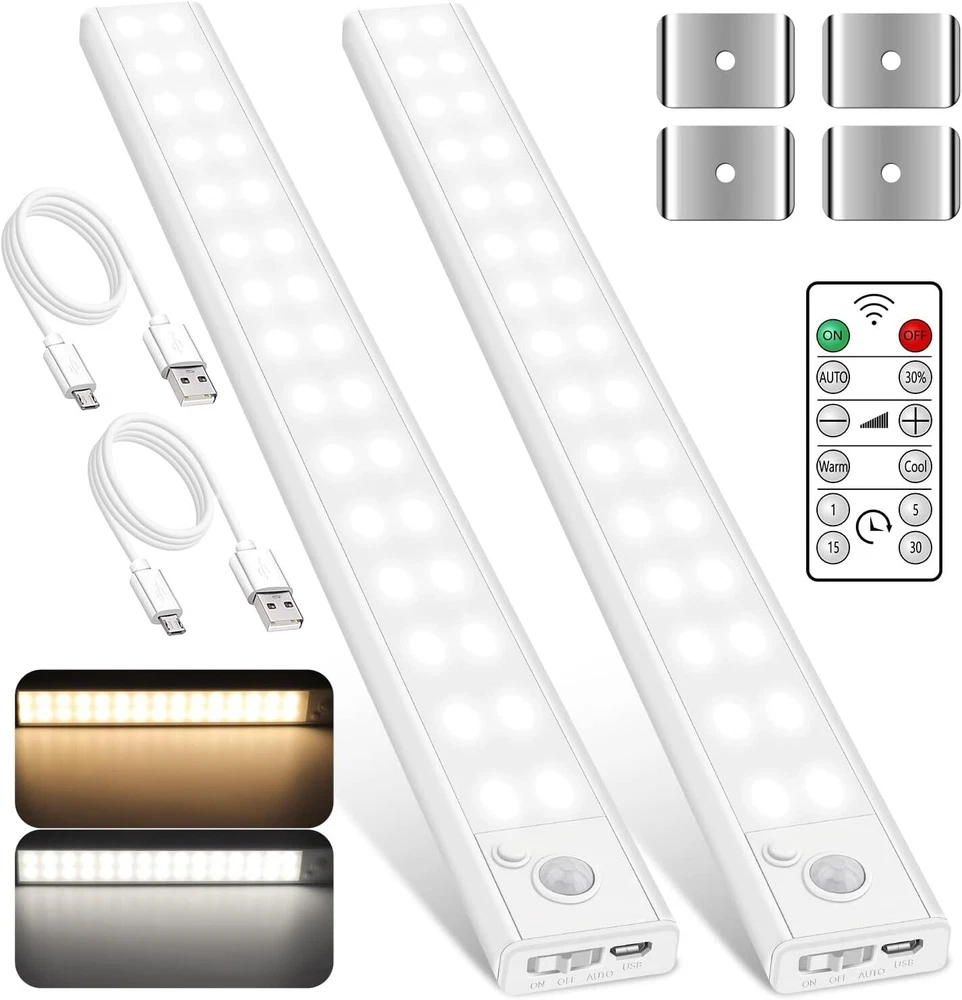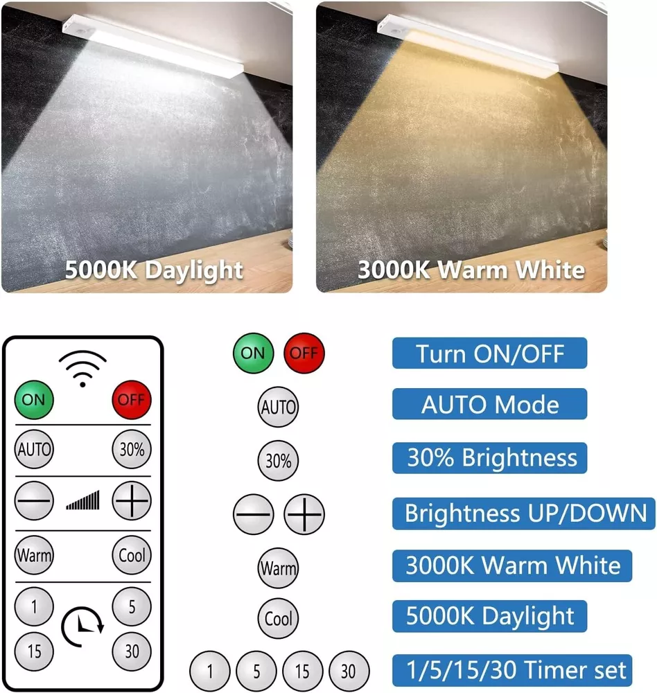 Kasonic cabinet LED light with motion sensor with remote control, very convenient to use. Automatically turns on / off based on your actions. It is powered by a built-in rechargeable battery. It can be installed in any place where safety lighting is required, such as wardrobes, closets, bathrooms, kitchens or corridor stairways. Also in outdoor car or camping, etc. AUTOMATIC MOTION SENSOR The light will turn on automatically when motioni is detected within range. The light turns off automatically after approximately 90 seconds or when no motion is detected. 3-Mode Power Switch: ON: Always ON OFF: Always OFF AUTO: Motion sensor mode with constant detection USB rechargeable battery Built-in rechargeable battery, can be charged from any USB port. Energy saving and save more! USB port on the computer USB charger USB power bank Fix the light in the desired position. Remove the light from the magnetic strip at any time to replace the batteries. Convenient lighting for kitchen pantries or medicine cabinets and more Works great for kitchen pantries, medicine cabinets, and similar applications. Easy to install motion sensor lights for wardrobes, corridors and stairs Great for cupboards and wardrobes. Use these lights as a convenient option so you can see what you need at night. About this item đĄăSuper Bright ă- This under cabinet lighting, super bright and suitable for illuminating every dark corner. 2 adjustable color temperature, 3000K(Warm white), 5000K(Cool white), suitable for light in various environments. đĄăUSB Rechargeable and Energy Savingă- These led cabinet lights built-in rechargeable battery, easily charged via the USB cable(included). đĄăMotion Sensor & Remoteă- These wireless closet lights have a 3 mode switch which is AUTO-Motion Sensor mode, and OFF/ON stays on all the time. Can control the light brightness and color temperature by using the remote. đĄăEasy To Installă- It's magnetic and directly adsorbs on the iron product surface, easy to remove for changing place or charging. Or stick on anywhere as you need with metal bracket with taped. đăWide Applicationă - Our multifunctional under counter lights are ideal for the kitchen cabinet, bedroom, stairwell, closets, cabinet, workshop, basement, garage, hallway, pantry and other places.