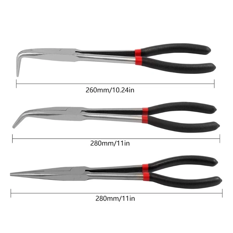 Features: Brand new and high quality Needle Nose Pliers Set:3Pcs pliers set includes 1 x needle nose pliers, 1 x 45° bending pliers, 1 x 25° bending pliers. Easy To Grip:These long needle nose pliers have tip heads, which make them easy to grip items and allows you to easily bend or reposition hoses, cables, and wires, close bead tips, form and more. Strong bite force ensures that things will not fall, suitable for doing fine work. Ergonomic Handle:These long reach pliers have ergonomic handles which provide good grip and comfortable feeling, easy to control, easy to grip while wet, insulated for cold weather use. The handle is not easy to wear out or slide off, and you will not feel hand fatigue even after long time use. Strong & Durable:These needle nose pliers are made of premium carbon steel, strong and durable, wear and rust resistant, with high strength and hardness, not easy to break and deform, and can be used for a long time. Wide Application: These multifunctional pliers are suitable for home DIY projects, professional auto repair, industry, construction, jewelry making, etc. They are great gift for electricians, engineers, artisans, etc. Specifications: Name: Pointed Nose Pliers Material: Carbon Steel Quantity: 3 Pieces Handle Length: 110mm/4.33 Inch Shear Diameter: 0.1mm Clamp Length: 100mm/3.94 Inch Total Length: 280mm/11 Inch 3PCS Pliers Set: 1x Needle Nose Pliers, 1 x 45 ° Elbow Pliers, 1 x 25 ° Elbow Pliers Package Includes: 1 x Needle Nose Pliers 1 x 45 ° Elbow Pliers 1 x 25 ° Elbow Pliers note: 1.Transition: 1cm=10mm=0.39inch 2.Please allow 0-1cm error due to manual measurement. pls make sure you do not mind before you bid. 3.Due to the difference between different monitors, the picture may not reflect the actual color of the item. Thank you!