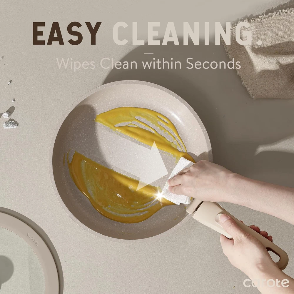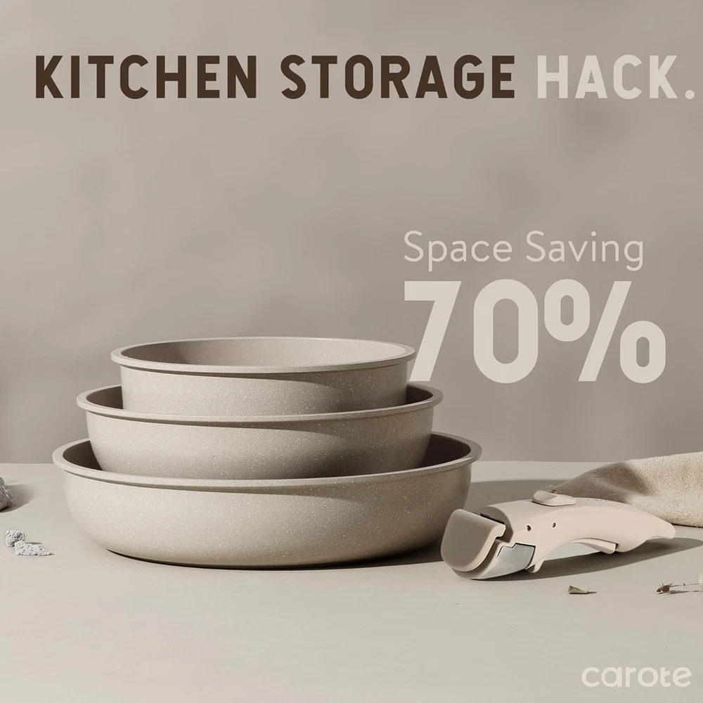 For a Clutter-free Cupboard: Optimal storage and easy stacking with the handles off saves up to 70% more space of Carote detachable handle pots and pans set. For a Fuss-free Cleaning: As both a cookware set and a dinnerware set, 1-time cleaning for all. Cleanup with 0 elbow grease thanks to the nonstick granite. Multitasking Cookware Set: Removable handle for the ultimate versatility– go from ALL kinds of hobs to the oven, to grill, to the fridge, and onto the table in a click. You Won't Compromise on Quality: Balanced convenience-rich features, rapid and even heat transfer, and nonstick performance as the same as other Carote cookware sets. Worry-free Service: Each CAROTE cookware passes a strict multi-inspection process. In case you received defective items caused by delivery, please don't hesitate to reach out, You will be guaranteed to get a solution. Set Includes: 2*fry pans(10''&8''), 2*sauce pans(3qt&2qt), 1*saute pan(10''/4qt), 2*detachable handles, 2*silicone lid(10''&8''), 2*storage lids(8''&7‘’). Product Description What benefits can the detachable handle cookware set bring to you? 70% Space-saving: Perfect stacking in storage compartments like drawers, cabinets, RV, camping use, travel trailer, and motorhome. Effortlessly Move: Removable handle for the ultimate versatility– go from ALL kinds of stoves to the oven, grill, fridge, and dinner table. VERSATILE COOKING Non-stick Pans and Pots Effortless Cooking in the Detachable Cookware Sets! With an ultra-peeling-resistant nonstick surface, this detachable cookware set marries breath-taking design with the latest in non-stick advances. Even the simplest recipes get the star treatment with Carote's unique "Click" cookware set. Clean with a 5s wipe Fuss-free Cleaning! Easy to clean pans and pots finished with an enhanced nonstick exterior make cleanup easy and with zero elbow grease. Space saving tech Kitchen Storage Hack! NO MORE CABINET CHAOS: 70% Space-saving magic, keep your kitchen tidy and clutter-free! 1 Easy Stoves Use 2 Easy Food Storage 3 Easy Oven Use 4 Easy Serving Click, Cook, Carote Pots and Pans Set Removable Handle