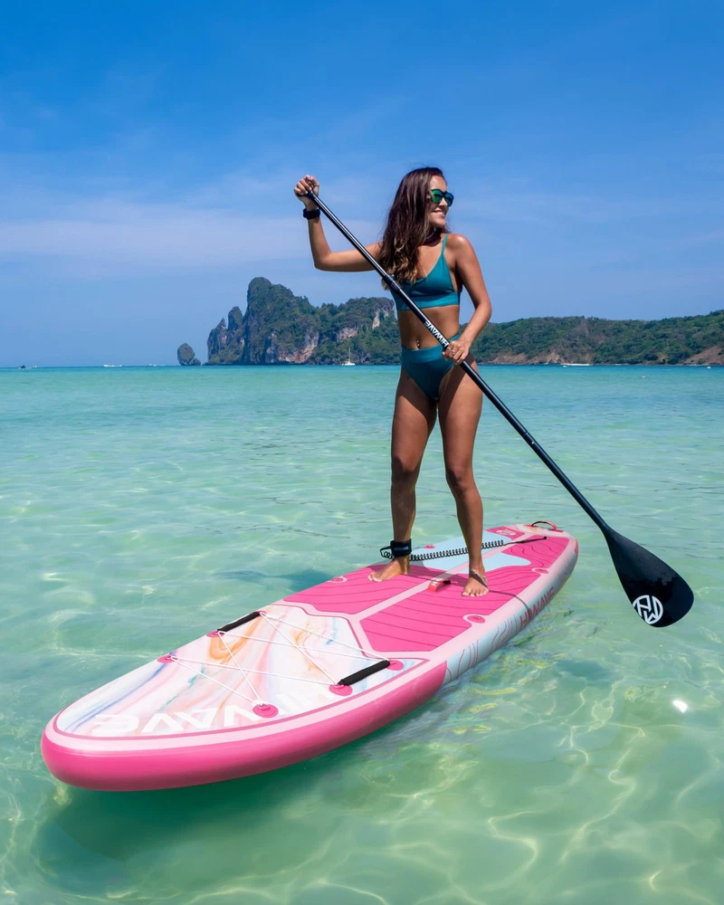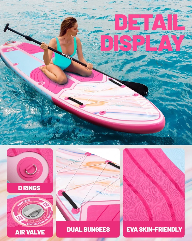 This inflatable paddle board is a game-changer! The extra-wide 34" design gives amazing stability, making it perfect for beginners and pros alike. It’s super lightweight yet handles up to 450lbs, and the non-slip EVA deck keeps you secure. The detachable fins enhance tracking, and it’s easy to carry and store. A must-have for water adventures!