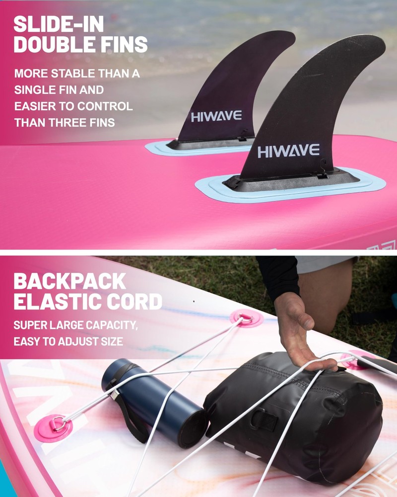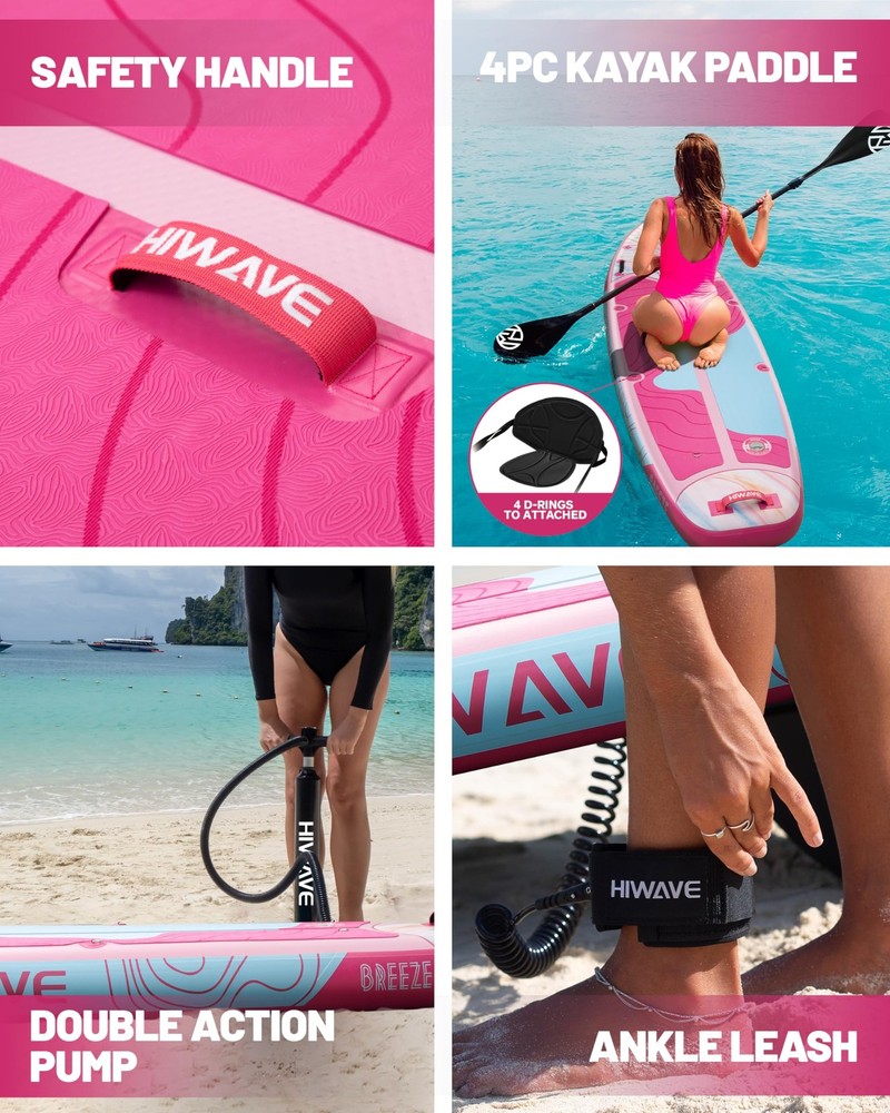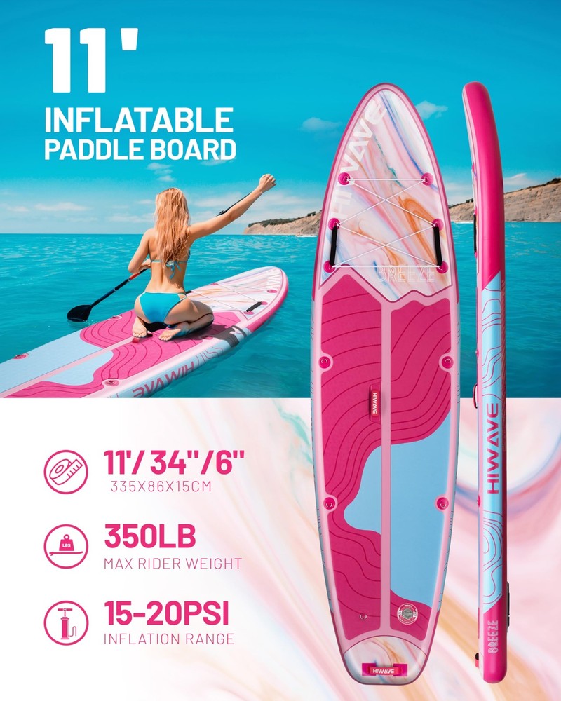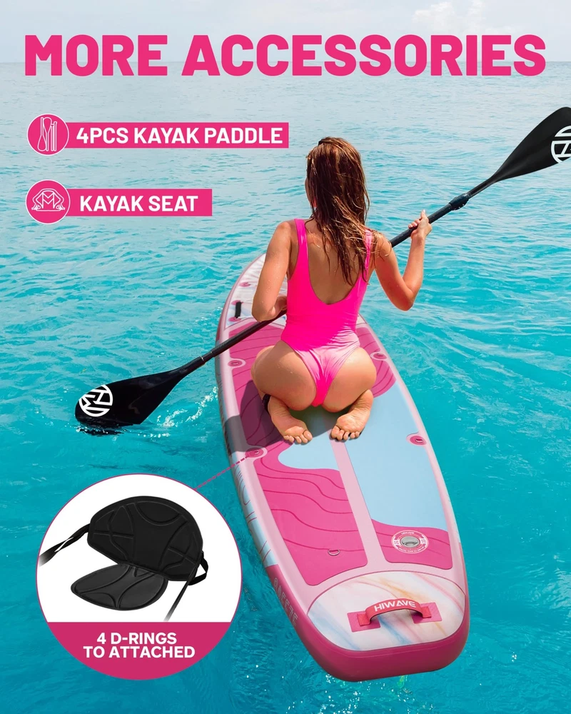 sup;paddleboard;paddle boards;inflatable paddleboard;sup paddle board;body glove paddle board;blow up paddle board;isle paddle board;fun water inflatable paddle board;tabla de surf 【EXTRA WIDE AND LONGER DESIGN FOR BETTER BALANCE】 Premium inflatable paddle board with non-slip EVA deck pad is made of high quality material that can able to withstand high pressure. 34 inches width board provided great stability. 【ULTRA LIGHT PADDLE BOARD THAT MADE YOU EASY TO CARRY】 Two big detachable bottom fins help improve overall speed and handling. Inflatable stand up paddle board can be used in exploring, touring, fishing, yoga. Also suitable in the ocean, fresh water lakes, and rivers. 【FAST INFLATION】 We provide DOUBLE ACTION HAND PUMP which can inflate and deflate quickly. The height-adjustable floating aluminum paddle(65-82 inches)is suitable for most people. 【PACKAGE INCLUDING 】adjustable aluminum paddle, safety leash, double action hand pump, waterproof phone bag, upgraded backpack, two removable fins and repair accessories,4 pcs kayak paddle,kayak seat. BOARD DIMENSION 11ft length, 34 inches width and 6 inches thickness, achieved amazing balance ability. Weight limit up to 350 lbs. We also offer 1 year parts WARRANTY and TELEPHONE service to secure customer experience. 【SAFETY HANDLE】There are two safety handles on the front of the paddle board. When people sit in front of the paddle board, they can hold the handles to ensure safety.