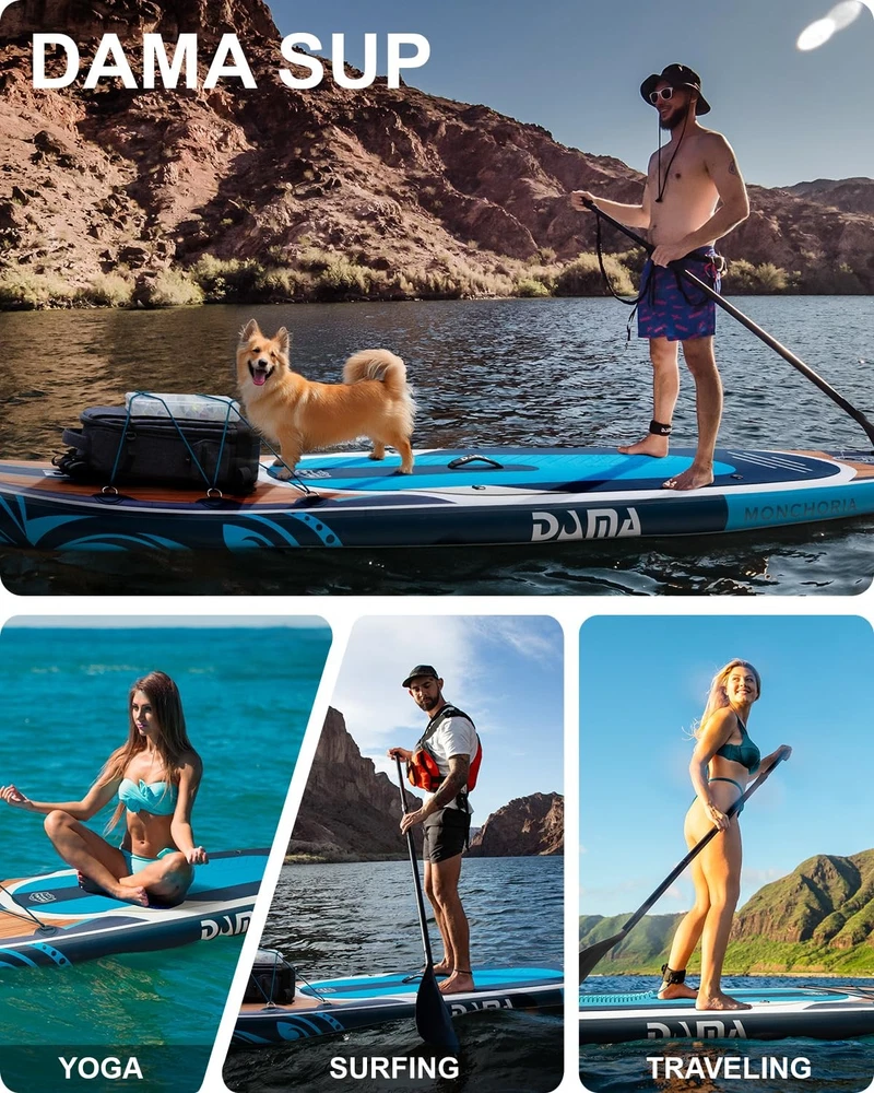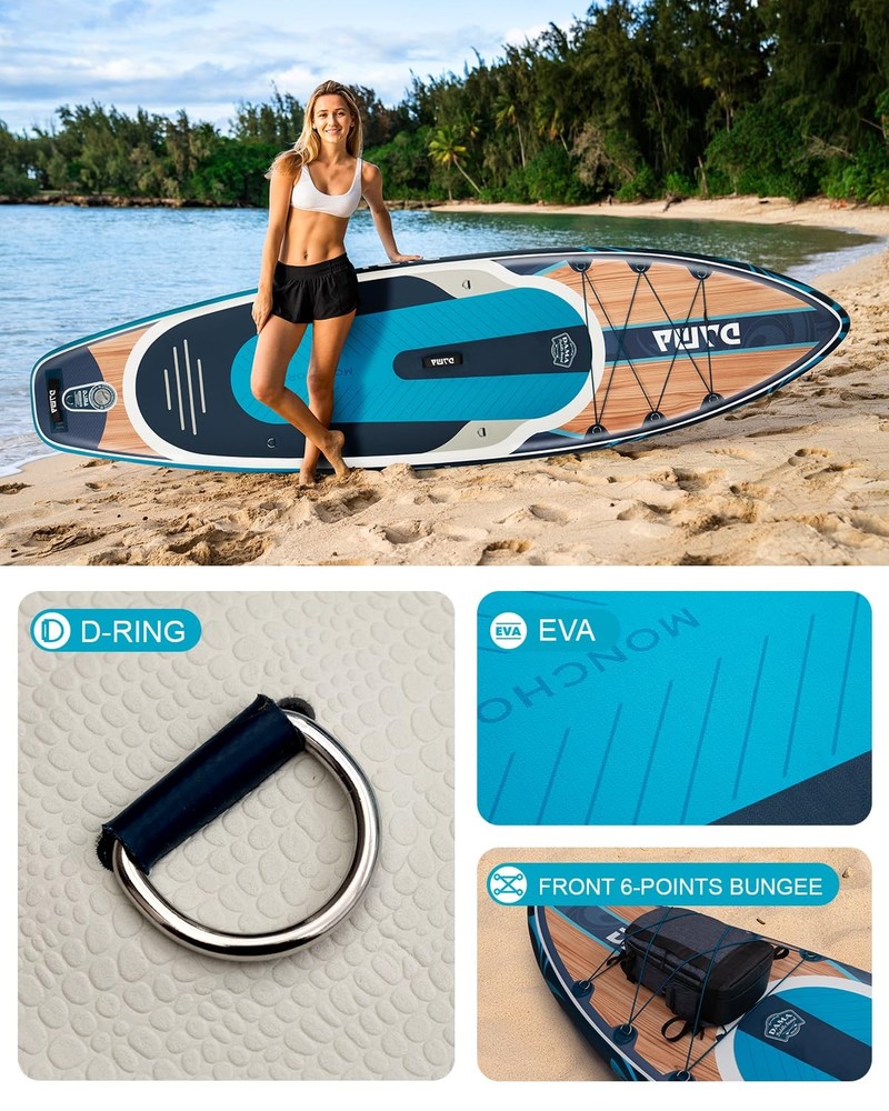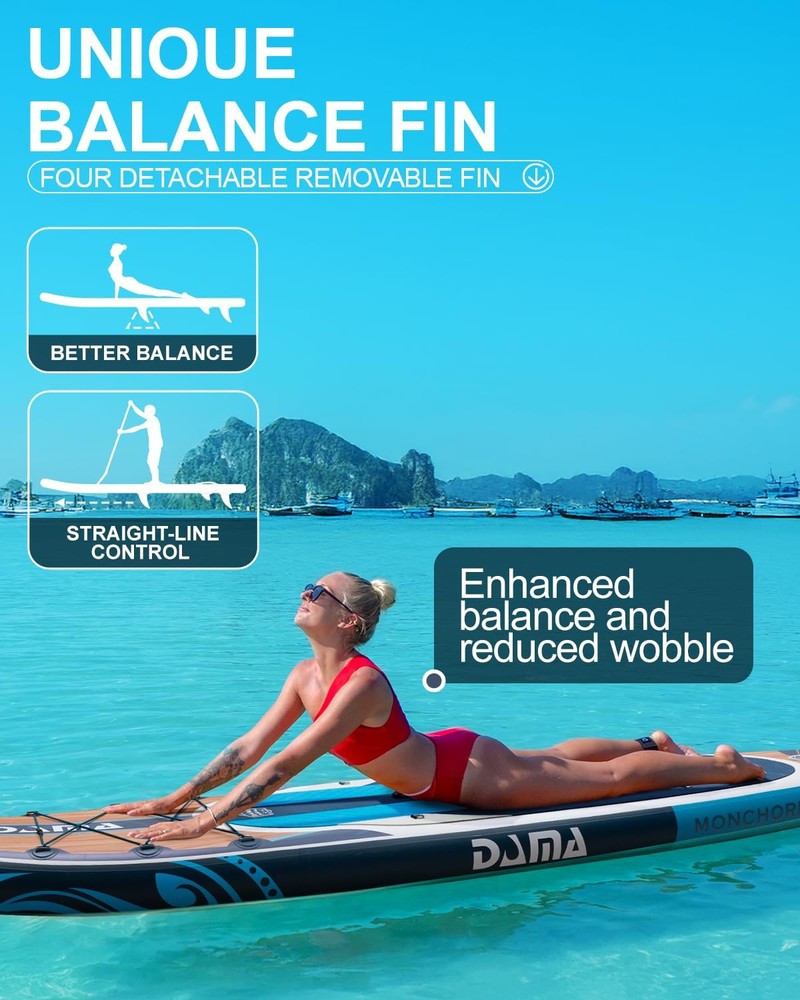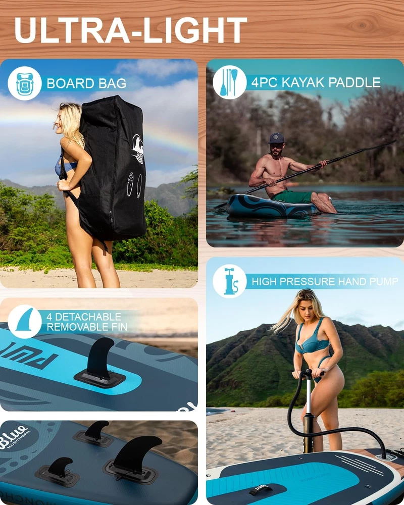 sup;paddleboard;paddle boards;inflatable paddleboard;sup paddle board;body glove paddle board;blow up paddle board;isle paddle board;fun water inflatable paddle board;tabla de surf [Excellent performance and stability]In terms of material and size selection, inflatable paddle boards are constructed from advanced imported materials and undergo rigorous quality control to ensure that air does not leak. The paddle boards for adults feature the most ergonomic dimensions: 11' x 34 6", with a maximum weight capacity of 400 pounds. Their stable structure and design can accommodate 1 to 3 people or your beloved pet. [Multi functional design]In terms of functionality and tail design, the paddle board incorporates concealed steel D-rings that facilitate the installation of a paddle board seat without sacrificing aesthetics. Additionally, we have implemented a quad-tail design, which enhances the overall speed and usability of the paddle board. [High standard professional accessories]Considering that women and teenagers can quickly inflate and deflate the paddle board, it comes with a double action pump equipped with a precise measuring and sealing hose for accurate psi readings. The backpack also includes a dry bag, four detachable removable fin, safety leash, a waterproof phone pouch, 4pc kayak paddle, dry bag. [Water partner]The backpack design is lightweight and easy to carry, while the 4pc kayak paddle is constructed from specialized materials that enable it to float on water. It is suitable for a variety of aquatic environments, including oceans, lakes, and rivers. The paddle board is the ideal companion for yoga, surfing, snorkeling, fishing, and travel. [High quality customer service and after-sales service]We are dedicated to delivering high-quality service and a comprehensive after-sales guarantee to our customers. We offer a two-year warranty. If you experience any issues or require assistance while using our products, please do not hesitate to reach out to our customer service team. We are more than happy to address your questions and provide the support you need.