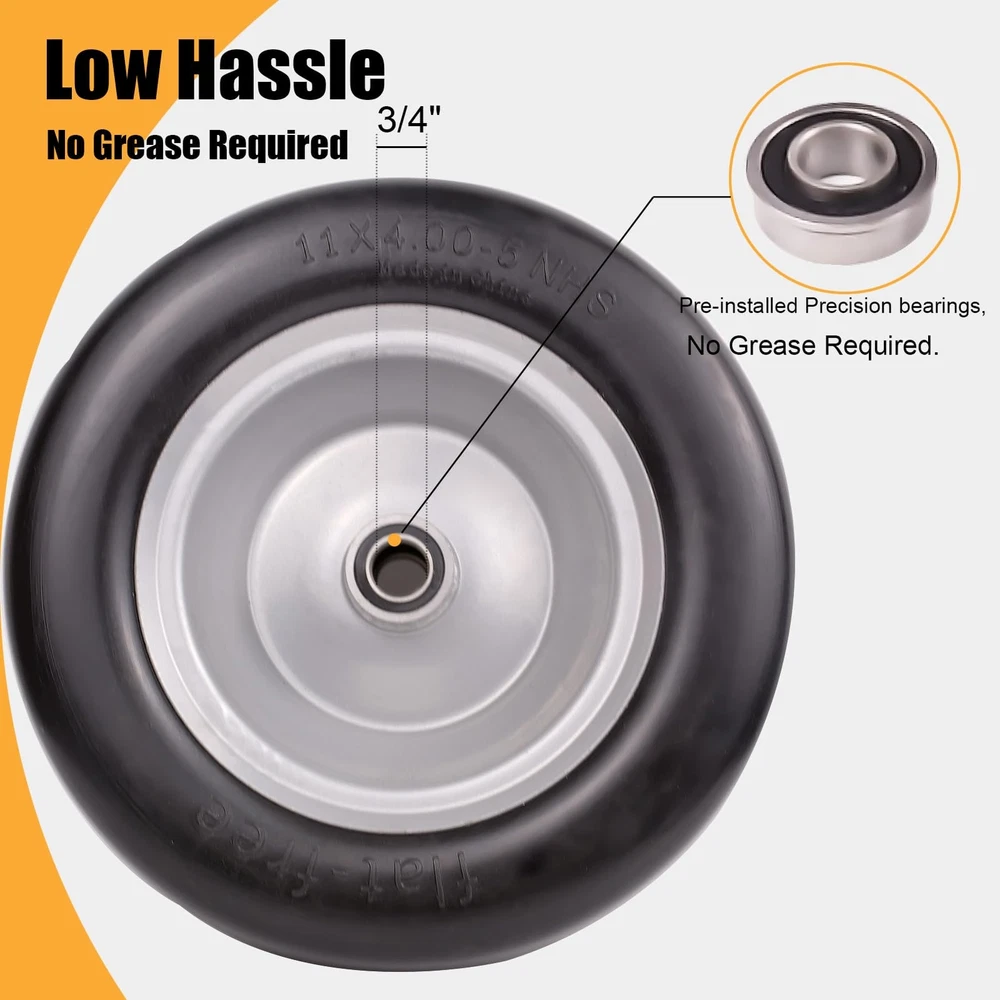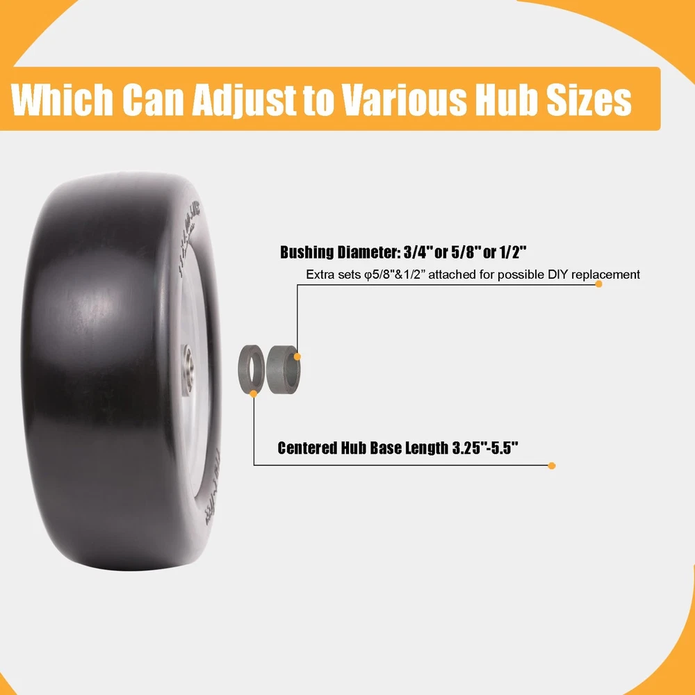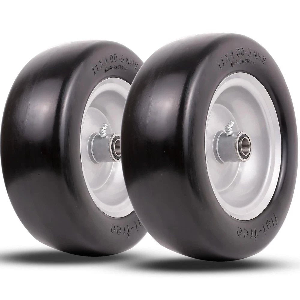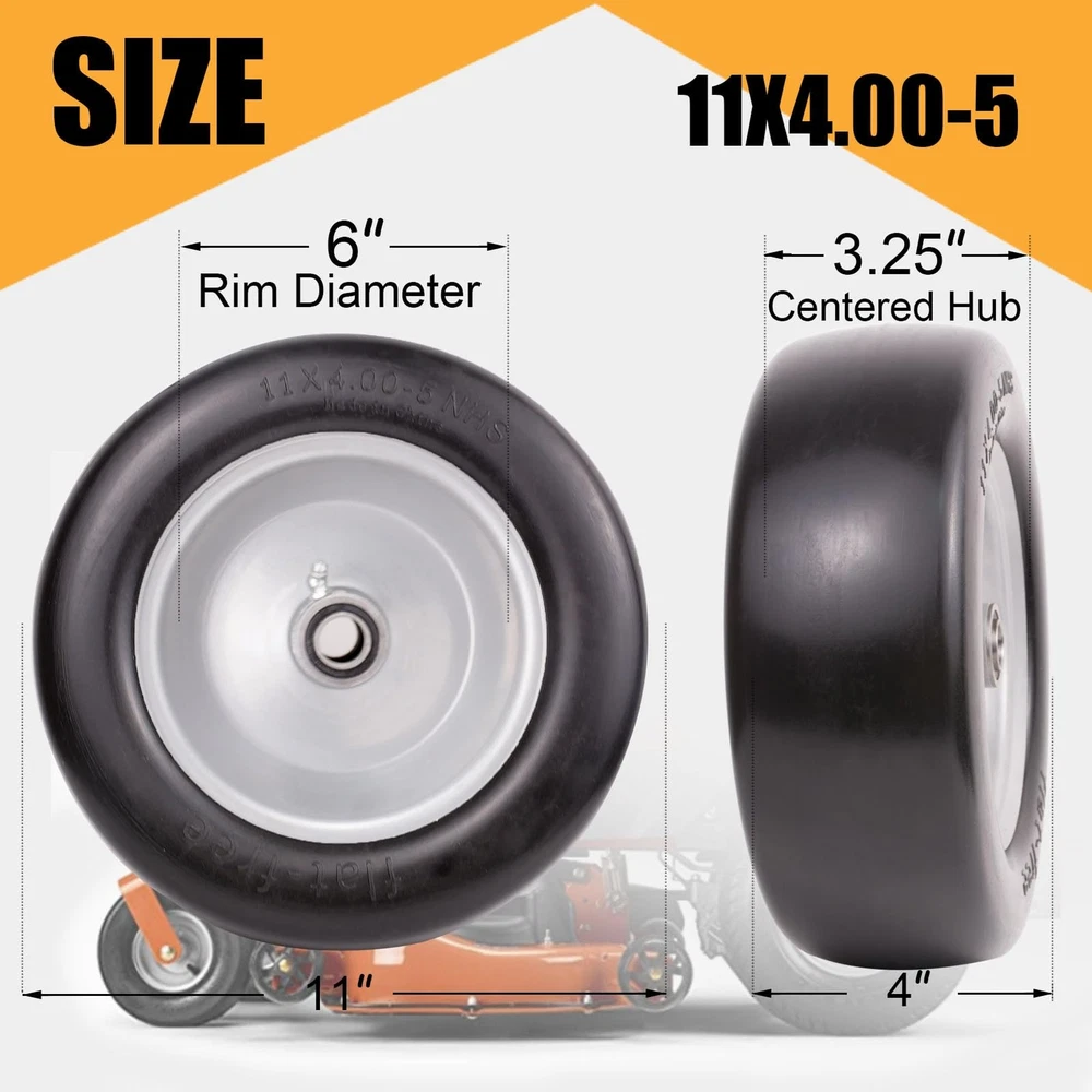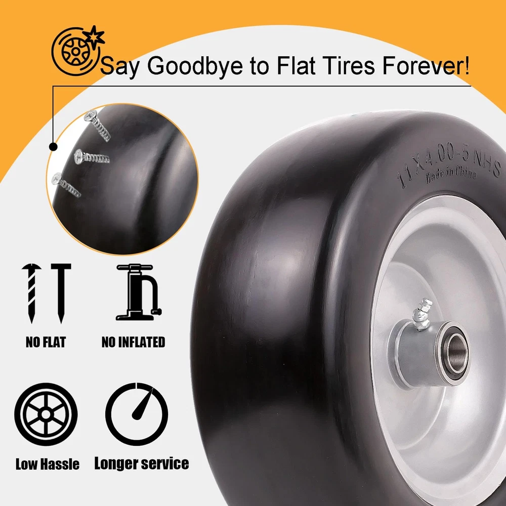 【Feature】11x4.00-5" flat-free tires provide bounce and load handling characteristics similar to an air-filled tire, making it puncture-proof, flat-free, Keep You Away from the Trouble of Inflating Tires Frequently. Seamless and smooth design for maximum protection of your lawn. Load capacity of 350 pounds 【Specification】 Universal Fit Smooth Tread Tire for Zero Turn Lawn Mowers model:11x4.00-5; Diameter 11’’; Axle Bore Diameter:3/4" Precision bearings with Extra 5/8"& 1/2" bushings; Hub length:3.25"-5.5" (adjustable via Metal Spacers). Please Check Carefully Before Buying to Make Sure the Tires Match. Not for highway use 【Low Hassle】 3/4-inch pre-installed Precision bearings, No Grease Required. Set of 2 11x4.00-5 Flat Free Lawn Mower Tires and Wheel. Comes with an additional adapter kit, including two 5/8" & 1/2" bushings,0.44" metal spacers*4,0.22"metal spacers*2, which can greatly expand its applicability. Whether you are a DIY enthusiast or a professional mechanic, you can easily install this tire 【Applications】 Widely used on many kinds of zero-turn lawn mowers front tires. Also fits wheelbarrows, garden carts, hand trucks, generators, air compressors, wagons, pressure washers and other types of outdoor power equipment BUY WITH CONFIDENCE: For any reason you're not completely satisfied, please kindly contact us by logging in your Amazon Buyer Account > Click Your Account > your order > Find your order and click Contact Seller, we will respond you in one business day. Customer satisfaction is our tireless pursuit