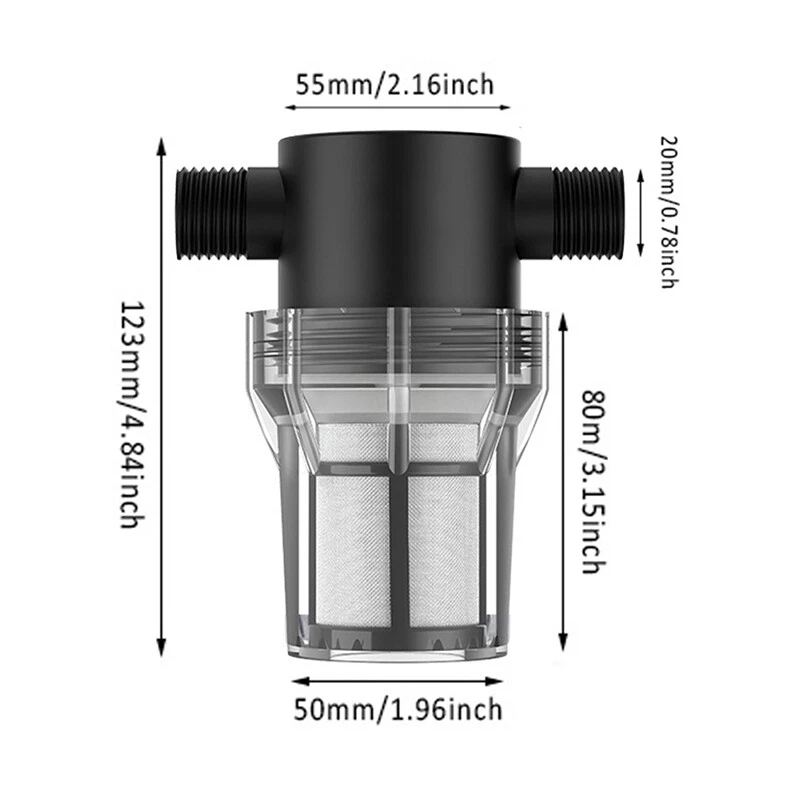 Description: Product Name: Water Pipe Filter Material: PC Color: Black + Transparent Threaded Interface: External thread Interface Size: 4-point Interface (1/2 inch), 6-point Interface (3/4 inch) Filter Mesh: 40 mesh, 80 mesh Uses: Suitable for garden irrigation, car washing, fish tanks, water tanks, etc. Features: The size of the 40 mesh and 80 mesh filters is moderate, and the flow rate will not be affected when filtering impurities. In winter or in the sun for a long time, please put a protective cover on the surface of the filter to prevent the shell from bursting. The garden hose filter is small in size, easy to clean and reuse, no need to replace it for a long time. The filter is available in several different sizes: 1/2 inch, 3/4 inch. The filter is suitable for garden hoses, pressure washers and RVs, which can effectively filter out impurities and increase the life of water equipment. Package includes: 1 X Water Pipe Filter Notice: 1. Transition: 1cm=10mm=0.39inch 2. Please allow 0-3cm error due to manual measurement. Please make sure you do not mind before bidding. 3. Due to the difference between different monitors, the picture may not reflect the actual color of the item. Thanks!