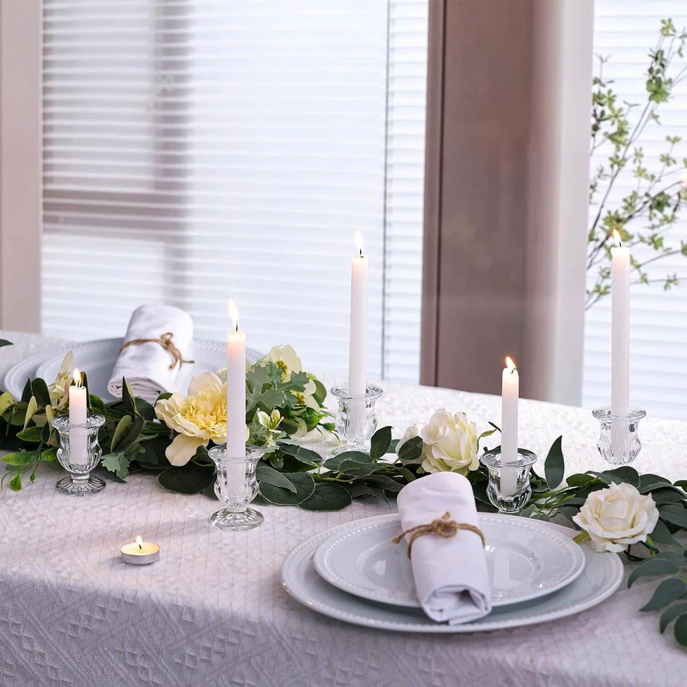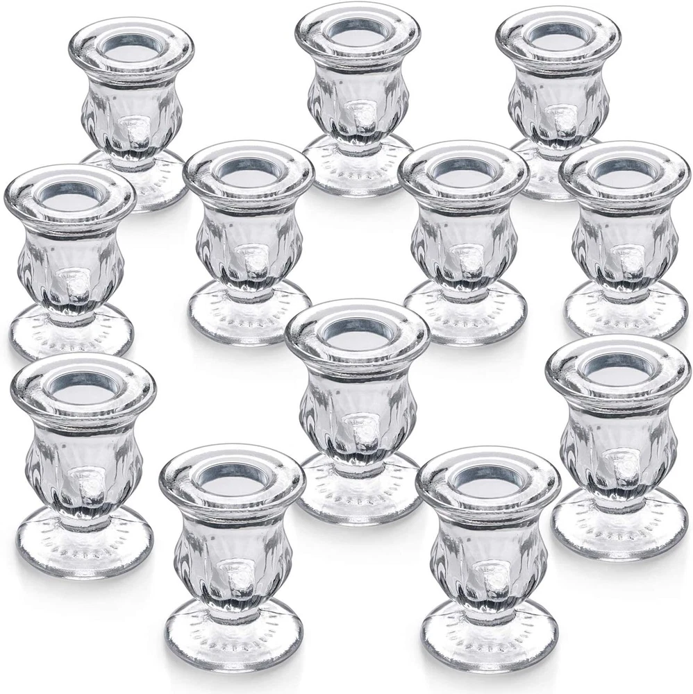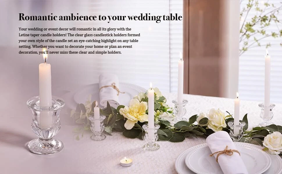 Product Description Pink Green Clear Amber Pink Green Add to Cart Add to Cart Add to Cart Add to Cart Add to Cart Add to Cart Customer Reviews 4.7 out of 5 stars 30 4.7 out of 5 stars 30 4.7 out of 5 stars 30 4.7 out of 5 stars 30 4.8 out of 5 stars 3,443 4.8 out of 5 stars 3,443 Price $21.99 $ 21 . 99 $21.29 $ 21 . 29 $22.99 $ 22 . 99 $21.23 $ 21 . 23 $37.99 $ 37 . 99 $37.99 $ 37 . 99 Quantity 12 12 12 12 36 36 Pink Green Clear Amber Blue Amber Add to Cart Add to Cart Add to Cart Add to Cart Add to Cart Add to Cart Customer Reviews 4.7 out of 5 stars 89 4.7 out of 5 stars 89 4.7 out of 5 stars 89 4.7 out of 5 stars 89 4.8 out of 5 stars 3,443 4.8 out of 5 stars 3,443 Price $22.99 $ 22 . 99 $22.99 $ 22 . 99 $24.99 $ 24 . 99 $22.99 $ 22 . 99 $37.99 $ 37 . 99 $37.99 $ 37 . 99 Quantity 12 12 12 12 36 36 Mercury Gold Silver Mercury Gold Silver Clear Clear Add to Cart Add to Cart Add to Cart Add to Cart Add to Cart Add to Cart Customer Reviews 4.8 out of 5 stars 3,443 4.8 out of 5 stars 3,443 4.7 out of 5 stars 174 4.7 out of 5 stars 174 4.8 out of 5 stars 2,037 4.7 out of 5 stars 89 Price $39.99 $ 39 . 99 $39.99 $ 39 . 99 $39.99 $ 39 . 99 $39.99 $ 39 . 99 $13.99 $ 13 . 99 $21.99 $ 21 . 99 Quantity 36 36 36 36 12 12 Quick and Easy to text us: If there’s anything wrong with your tea lights candles or any other issue. Just click Wamu-home ( below the cart) and then click the yellow button to text us. We will reply for you ASAP. We won’t let our customer burden any loss. Your understanding is highly appreciated. Romantic ambience to your wedding table Your wedding or event decor will romantic in all its glory with the Does not apply taper candle holders! The clear glass candlestick holders formed your own style of the candle set an eye-catching highlight on any table setting. Whether you want to decorate your home or plan an event decoration, you’ll never miss these clear and simple holders. From security perspective, we recommend that taper candles should not burn concentrated in the candlestick for a long time and taper candles battery operated would be better. We are committed to providing high quality products and value the customer experience. If there are any concerns, you can send email to us at any time.